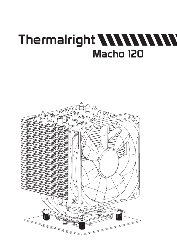 Thermalright Macho 120 Macho 120 Assembly package ×4 × 1 ×4 × 4 ×7 × 4 ×5 × 4 × 1 × 1 × 1 Chill Factor 2g 4 4 × 1 × 2 8 Macho 120 Intel 775/1155/1156/1366 Exploded View Important! Before proceeding with installation, please check for the most up-to-date instructions at www.thermalright.com 120mm Fan Clip Macho Heatsink Body M3 L6 Screw Anchoring Mount 120mm Fan Anti-Vibration Pads Mounting Plate Screw Nut Intel Washer (small) Metal Back Plate M3 L10 Screw Backplate cap 1 Component 1 2 4 3 5 9 13 6 10 14 7 12 11 Chill Factor 8 15 16 2g 1 Macho Heatsink Body ×1 2 Anchoring Mount ×1 3 Metal Back Plate ×1 4 Mounting Plate ×1 5 Screw Nut ×4 6 LGA2011 Type B Screw Pillars x4 7 M3 L10 Screw ×5 8 M3 L6 Screw ×7 9 Intel Washer (small) ×4 10 AMD Washer (big) ×4 11 13 120mm Fan Clip ×2 14 Thermal paste ×1 Anti-Vibration Pad ×4 12 Backplate cap ×1 15 Screw driver ×1 16 120mm Fan ×1 The Ultimate Cooling Solutions! www.thermalright.com 2 Installation Instructions: Step 1: Step 1 : Part Installation Take out Macho cooler from the paper box.Remove the 120mm Fan from the cooler by pulling the Fan Clips upwards in order to give room for ease of installation. And leave the Fan Clips on the Heatsink Body. Do not remove them.Apply Anti-Vibration Padding to 4 corners on the Heatsink Body. Step 2: 1366 775 1156 1155 Step 2 : Backplate Installation Choose the platform (775/1155/1156/1366) you are in use. Make four M3L10 Screw Pillars go through the Metal Back Plate from bottom towards top.And then place the Metal Back Plate on the table. Put the four Washers (for Intel) around the Screw Pillars. Step 3: Step 3 : 775 backplate cap Note: When installing on a 775 platform, please first insert the Back Plate Cap into the opening on the Back plate, make sure you have the Cap facing downwards. (Only for 775). 3 Step 4: Step 4 : Place the motherboard on top of the Back Plate. See the four Screw Pillars go through the four holes around the processor socket.Cap the four Screw Pillars with the four Screw Nuts.Make sure the side with a washer is facing the Back Plate. Step 5: Step 6: Chill or Fact 2g Chill Step 5 : Anchoring Mount Installation Place the Anchoring Mount on the Screw Nuts. Use the four M3L6 Screws to fix the Anchoring Mount on to the Screw Pillars. Step 7: Step 7: Mounting Plate Installation Place the Heatsink Body on top of the CPU. Make the Mounting Plate go through the Heatsink Body. Then use the supplied Screw Driver to fasten the two M3L6 Screws to Secure the Mounting Plate. Step 9: Step 9 : Fan Installation Place the included 120mm fan onto the Heatsink Body. And then secure it with the 120mm Fan Clips, by pulling the Fan Clips to place the four ends at the four holes on the 120mm Fan. or Fact 2g Step 6 : Applying Thermal Paste Apply the Thermal Paste to the base of the Heatsink and the surface of the CPU evenly. Step 8: Step 8: Easy Access Pass the supplied Screw Driver through the central hole of the Heatsink Body, for easier access to the M3L6 Screw underneath the cooler. Step 10: Step 10 : Installation completed Plug in the fan connector to the CPU PWM Fan socket on the motherboard. Installation complete. The Ultimate Cooling Solutions! www.thermalright.com 4 Macho 120 Intel 2011 Exploded View Important! Before proceeding with installation, please check for the most up-to-date instructions at www.thermalright.com Macho Heatsink Body 120mm Fan Clip M3 L6 Screw Anchoring Mount 120mm Fan Anti-Vibration Pads Mounting Plate LGA2011 Type B Screw Pillars 5 Component 1 2 4 3 5 9 13 6 10 14 7 12 11 Chill Factor 8 15 16 2g 1 Macho Heatsink Body ×1 2 Anchoring Mount ×1 3 Metal Back Plate ×1 4 Mounting Plate ×1 5 Screw Nut ×4 6 LGA2011 Type B Screw Pillars x4 7 M3 L10 Screw ×5 8 M3 L6 Screw ×7 9 Intel Washer (small) ×4 10 AMD Washer (big) ×4 11 13 120mm Fan Clip ×2 14 Thermal paste ×1 Anti-Vibration Pad ×4 12 Backplate cap ×1 15 Screw driver ×1 16 120mm Fan ×1 The Ultimate Cooling Solutions! www.thermalright.com 6 Installation Instructions: Step 1: Step 1 : Part Installation Take out Macho cooler from the paper box.Remove the 120mm Fan from the cooler by pulling the Fan Clips upwards in order to give room for ease of installation. And leave the Fan Clips on the Heatsink Body. Do not remove them.Apply Anti-Vibration Padding to 4 corners on the Heatsink Body. Step 2: Step 2 : Place the motherboard on top of the Back Plate. See the four Screw Pillars go through the four holes around the processor socket.Cap the four Screw Pillars with the four Screw Nuts.Make sure the side with a washer is facing the Back Plate. Step 3: Step 3 : Place the Anchoring Mount on the Screw Nuts. Use the four M3L6 Screws to fix the Anchoring Mount on to the Screw Pillars. 7 Macho 120 Step 4: Chill or Fact 2g Chill or Fact 2g Step 6 : Applying Thermal Paste Apply the Thermal Paste to the base of the Heatsink and the surface of the CPU evenly. Step 5: Step 7: Mounting Plate Installation Place the Heatsink Body on top of the CPU. Make the Mounting Plate go through the Heatsink Body. Then use the supplied Screw Driver to fasten the two M3L6 Screws to Secure the Mounting Plate. Step 7: Step 9 : Fan Installation Place the included 120mm Fan onto the Heatsink Body. And then secure it with the 120mm Fan Clips, by pulling the Fan Clips to place the four ends at the four holes on the 120mm Fan. Step 6: Step 8: Easy Access Pass the supplied Screw Driver through the central hole of the Heatsink Body, for easier access to the M3L6 Screw underneath the cooler. Step 8: Step 10 : Installation completed Plug in the fan connector to the CPU PWM Fan socket on the motherboard. Installation complete. The Ultimate Cooling Solutions! www.thermalright.com 8 Macho 120 AM2/AM2+/AM3/AM3+/FM1 Exploded View Important! Before proceeding with installation, please check for the most up-to-date instructions at www.thermalright.com 120mm Fan Clip Macho Heatsink Body 120mm Fan M3 L6 Screw Anchoring Mount Anti-Vibration Pads Mou