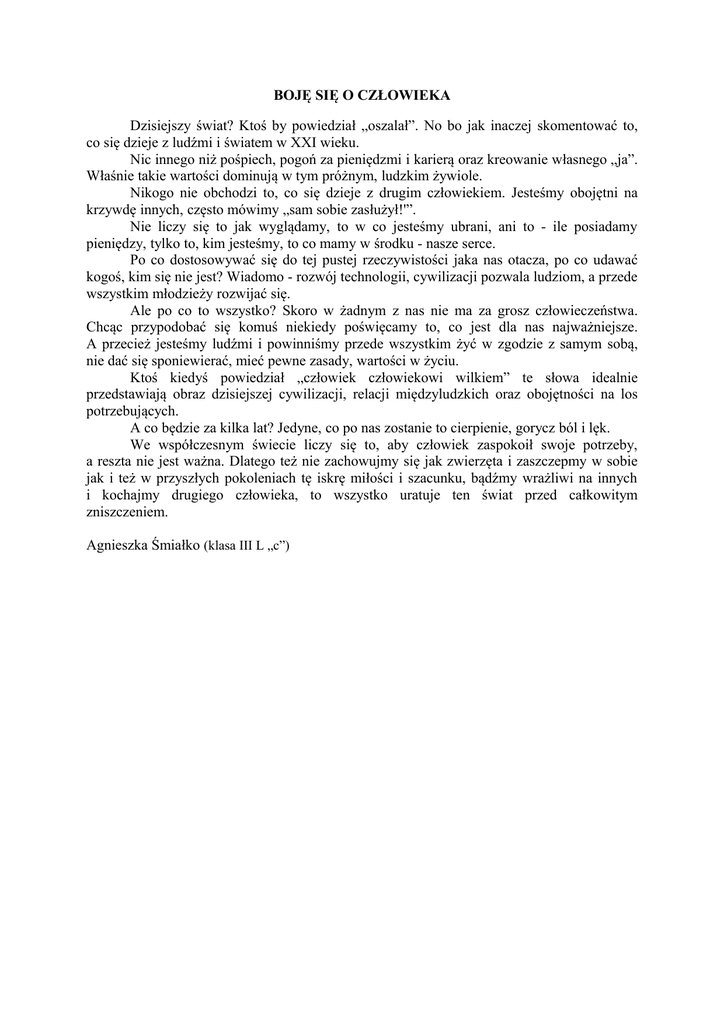 BOJĘ SIĘ O CZŁOWIEKA Dzisiejszy świat? Ktoś by powiedział „oszalał”. No bo jak inaczej skomentować to, co się dzieje z ludźmi i światem w XXI wieku. Nic innego niż pośpiech, pogoń za pieniędzmi i karierą oraz kreowanie własnego „ja”. Właśnie takie wartości dominują w tym próżnym, ludzkim żywiole. Nikogo nie obchodzi to, co się dzieje z drugim człowiekiem. Jesteśmy obojętni na krzywdę innych, często mówimy „sam sobie zasłużył!'”. Nie liczy się to jak wyglądamy, to w co jesteśmy ubrani, ani to - ile posiadamy pieniędzy, tylko to, kim jesteśmy, to co mamy w środku - nasze serce. Po co dostosowywać się do tej pustej rzeczywistości jaka nas otacza, po co udawać kogoś, kim się nie jest? Wiadomo - rozwój technologii, cywilizacji pozwala ludziom, a przede wszystkim młodzieży rozwijać się. Ale po co to wszystko? Skoro w żadnym z nas nie ma za grosz człowieczeństwa. Chcąc przypodobać się komuś niekiedy poświęcamy to, co jest dla nas najważniejsze. A przecież jesteśmy ludźmi i powinniśmy przede wszystkim żyć w zgodzie z samym sobą, nie dać się sponiewierać, mieć pewne zasady, wartości w życiu. Ktoś kiedyś powiedział „człowiek człowiekowi wilkiem” te słowa idealnie przedstawiają obraz dzisiejszej cywilizacji, relacji międzyludzkich oraz obojętności na los potrzebujących. A co będzie za kilka lat? Jedyne, co po nas zostanie to cierpienie, gorycz ból i lęk. We współczesnym świecie liczy się to, aby człowiek zaspokoił swoje potrzeby, a reszta nie jest ważna. Dlatego też nie zachowujmy się jak zwierzęta i zaszczepmy w sobie jak i też w przyszłych pokoleniach tę iskrę miłości i szacunku, bądźmy wrażliwi na innych i kochajmy drugiego człowieka, to wszystko uratuje ten świat przed całkowitym zniszczeniem. Agnieszka Śmiałko (klasa III L „c”)