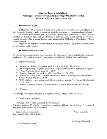 Sprawozdanie z działalności Polskiego Towarzystwa Ludoznawczego Oddział w Łodzi, 18 czerwca 2010 - 20 czerwca 2011 Dane organizacyjne Oddział liczy 60 członków. W roku sprawozdawczym przyjęto 3 nowych. Skreślono z listy członków 1 osobę – na jej wniosek, ze względu na zmianę przynależności oddziałowej. W okresie sprawozdawczym Zarząd odbył 4 posiedzenia (zebrania): 22 lipca 2010, 13 stycznia, 29 marca, 26 maja 2011, podejmując 2 uchwały. Jedna z nich dotyczyła wysokości składki członkowskiej a druga finansowego uczestnictwa Oddziału w Przeglądzie Filmów Etnologicznych. Wysłano 34 koperty korespondencji tradycyjnej starając się jednak komunikować głównie drogą elektroniczną. Działalność merytoryczna W okresie sprawozdawczym kontynuowano dotychczasowe formy działalności naukowooświatowej. Wszystkie spotkania organizowano wspólnie z Łódzkim Domem Kultury: I. Odczyty/prelekcje 1. „Wesele na Ukrainie. Tradycja dzisiaj” – Alicja Woźniak, 08.10.2010 2. „Między piramidą a targiem, czyli o tym, co polski turysta może zobaczyć w Egipcie” – Anna Nadolska-Styczyńska, 19.11.2010 3. "Początki fotografii tatrzańskiej" - Krzysztof Pisera, 27.01.2011 4. "Powrót do krainy snów. Dawna i współczesna kultura australijskich Aborygenów" Robert Andrzej Dul, 04.02.2011 5. "1913. Syberia - kraj przyszłości. Historia pewnej podróży" - Dariusz Klechowski, 18.03.2011 6. „Sztuka Makonde. Tradycja i nowoczesność” - Jolanta Koziorowska, 03.06.2011 II. Wystawy: Wystawa pt. "Aborygeni Australii w fotografii Jadwigi Hardyś" 4.02 – 19.03.2011 III. Konferencje i sympozja: Przegląd Filmów Etnologicznych 29-30 marca 2011. Pokazano ogółem 25 filmów + projekcje specjalne. Odbyły się dyskusje. Przyznano 2 nagrody (publiczności i organizatorów) Sprawozdanie sporządziła Sekretarz Oddziału PTL w Łodzi Prezes Oddziału dr Damian Kasprzyk dr Aleksandra Krupa