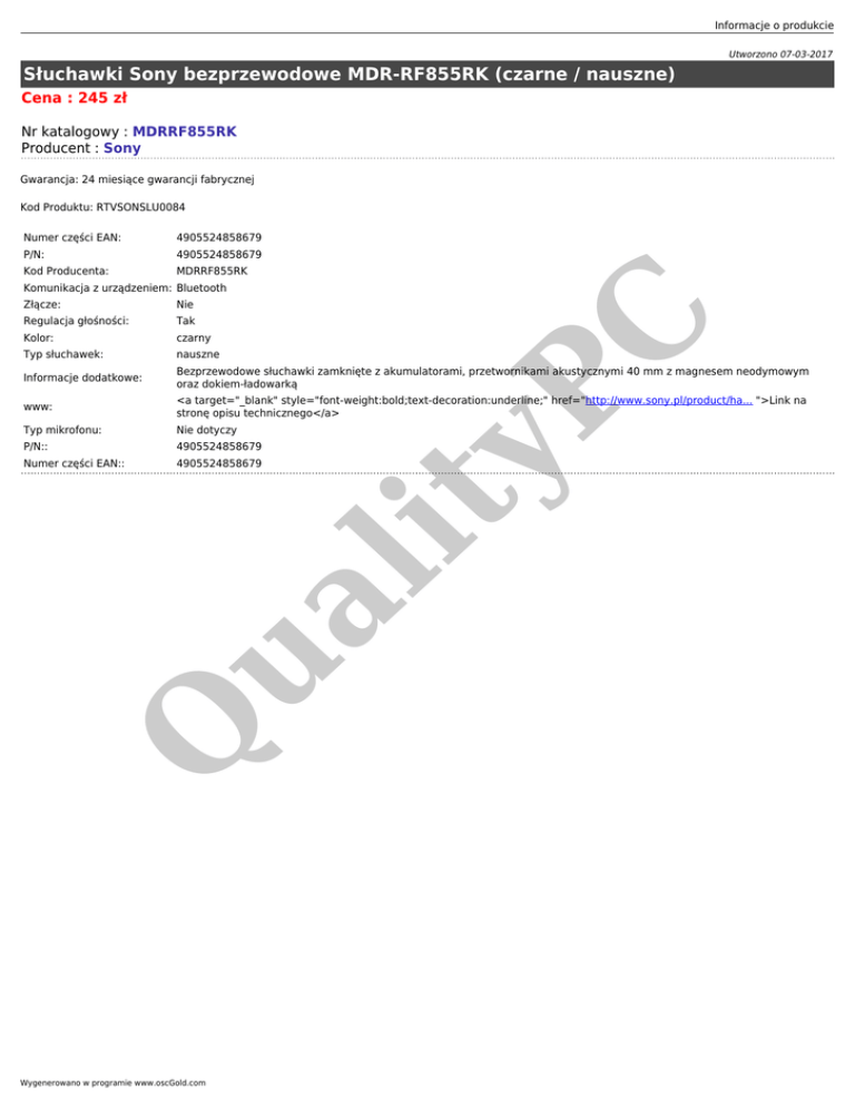 Informacje o produkcie Utworzono 07-03-2017 Słuchawki Sony bezprzewodowe MDR-RF855RK (czarne / nauszne) Cena : 245 zł Nr katalogowy : MDRRF855RK Producent : Sony Gwarancja: 24 miesiące gwarancji fabrycznej Kod Produktu: RTVSONSLU0084 Numer części EAN: 4905524858679 P/N: 4905524858679 Kod Producenta: MDRRF855RK Komunikacja z urządzeniem: Bluetooth Nie Regulacja głośności: Tak Kolor: czarny Typ słuchawek: nauszne Informacje dodatkowe: Bezprzewodowe słuchawki zamknięte z akumulatorami, przetwornikami akustycznymi 40 mm z magnesem neodymowym oraz dokiem-ładowarką www: <a target="_blank" style="font-weight:bold;text-decoration:underline;" href="http://www.sony.pl/product/ha... ">Link na stronę opisu technicznego</a> Typ mikrofonu: Nie dotyczy P/N:: 4905524858679 Numer części EAN:: 4905524858679 Q ua lit yP C Złącze: Wygenerowano w programie www.oscGold.com