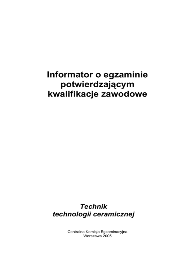 Informator o egzaminie potwierdzającym kwalifikacje zawodowe Technik technologii ceramicznej Centralna Komisja Egzaminacyjna Warszawa 2005 Informator opracowała Centralna Komisja Egzaminacyjna w Warszawie we współpracy z Okręgową Komisją Egzaminacyjną w Jaworznie oraz Ministrem właściwym do spraw gospodarki ISBN 83-7400-141-0 –2– Wstęp Centralna Komisja Egzaminacyjna poleca trzecią edycję informatorów o egzaminie potwierdzającym kwalifikacje zawodowe1 skierowaną do absolwentów szkół ponadgimnazjalnych: techników i szkół policealnych. Edycja obejmuje: − 75 informatorów, opublikowanych w terminie do 31 sierpnia 2005 roku, dla zawodów, w których po raz pierwszy w roku 2006, odbędzie się egzamin dla absolwentów ww. typów szkół, − 35 informatorów, dla pozostałych zawodów, przewidzianych do kształcenia na tym poziomie, które zostaną opublikowane w terminie do 31 grudnia 2005 roku. Prezentowana publikacja składa się z 75 odrębnych, dla poszczególnych zawodów, opracowań (informatorów), w których opisano wymagania egzaminacyjne. W każdym z informatorów omówiono: − strukturę egzaminu, jego organizację i przebieg, − wymagania, które należy spełnić żeby przystąpić do egzaminu i żeby zdać ten egzamin, − materiał egzaminacyjny z zakresu danego zawodu – wiadomości i umiejętności, które będą sprawdzane i oceniane na egzaminie, w etapie pisemnym i praktycznym, ilustrując go przykładami zadań egzaminacyjnych wraz z kryteriami oceniania. Informatory o egzaminie potwierdzającym kwalifikacje zawodowe kierujemy przede wszystkim do uczniów i nauczycieli szkół zawodowych, sądzimy jednak, że przedstawiony w nich syntetyczny materiał dotyczący sprawdzanych umiejętności stanowiących o kwalifikacjach zawodowych zainteresuje również innych czytelników, np.: przedstawicieli organów prowadzących szkoły i nadzorujących kształcenie, pracodawców i specjalistów ds. modelowania zawodów, kształcenia i doskonalenia zawodowego. 1 Podstawą prawną przeprowadzenia zewnętrznego egzaminu potwierdzającego kwalifikacje zawodowe, zwanego również egzaminem zawodowym, jest: − Rozporządzenie Ministra Edukacji Narodowej i Sportu z dnia 7 września 2004 r., w sprawie warunków i sposobu oceniania, klasyfikowania i promowania uczniów i słuchaczy oraz przeprowadzania sprawdzianów i egzaminów w szkołach publicznych (Dz. U. Nr 199, poz. 2046), − Rozporządzenie Ministra Edukacji Narodowej i Sportu z dnia 8 maja 2004 r., w sprawie klasyfikacji zawodów szkolnictwa zawodowego (Dz. U. Nr 114, poz. 1195), − Rozporządzenie Ministra Edukacji Narodowej i Sportu z dnia 29 marca 2005 r. zmieniające rozporządzenie w sprawie standardów wymagań będących podstawą przeprowadzania egzaminu potwierdzającego kwalifikacje zawodowe (Dz. U. Nr 66, poz. 580). Standardy, o których mowa w rozporządzeniu, stanowią oddzielny załącznik. –3– –4– SPIS TREŚCI 1. OGÓLNE INFORMACJE O EGZAMINIE POTWIERDZAJĄCYM KWALIFIKACJE ZAWODOWE................................................................ 6 1.1. Struktura egzaminu oraz formy sprawdzania wiadomości i umiejętności z zakresu zawodu .......................................................................................................................... 7 1.2. Wiadomości i umiejętności sprawdzane na egzaminie ................................................ 7 1.3. Wymagania, które trzeba spełnić, aby zdać egzamin................................................... 9 1.4. Wymagania, które trzeba spełnić, aby przystąpić do egzaminu................................... 9 1.5. Szczegółowe informacje o egzaminie zawodowym................................................... 10 2. ETAP PISEMNY EGZAMINU ................................................................... 11 2.1. Organizacja i przebieg ................................................................................................ 11 2.2. Wymagania egzaminacyjne z przykładami zadań do części I.................................... 13 2.3. Wymagania egzaminacyjne z przykładami zadań do części II .................................. 24 2.4. Odpowiedzi do przykładowych zadań........................................................................ 28 3. ETAP PRAKTYCZNY EGZAMINU ......................................................... 29 3.1. Organizacja i przebieg ................................................................................................ 29 3.2. Wymagania egzaminacyjne i ogólne kryteria oceniania ............................................ 30 3.3. Komentarz do standardu wymagań egzaminacyjnych ............................................... 31 3.4. Przykład zadania praktycznego .................................................................................. 33 3.5. Komentarz do rozwiązania zadania wraz z kryteriami oceniania .............................. 37 4. ZAŁĄCZNIKI ............................................................................................... 40 4.1. Standard wymagań egzaminacyjnych dla zawodu ..................................................... 40 4.2. Przykład karty odpowiedzi do etapu pisemnego ........................................................ 43 4.3. Lista zawodów, dla których opublikowano informatory w 2005 r............................. 44 –5– Ogólne informacje 1. OGÓLNE INFORMACJE O EGZAMINIE POTWIERDZAJĄCYM KWALIFIKACJE ZAWODOWE Egzamin potwierdzający kwalifikacje zawodowe jest formą oceny poziomu opanowania wiadomości i umiejętności z zakresu danego zawodu określonych w standardzie wymagań, ustalonym przez Ministra Edukacji Narodowej i Sportu. Egzamin ten, zwany również egzaminem zawodowym, jest egzaminem zewnętrznym. Umożliwia on uzyskanie porównywalnej i obiektywnej oceny poziomu osiągnięć zdającego poprzez zastosowanie jednolitych wymagań, kryteriów oceniania i zasad przeprowadzania egzaminu, opracow