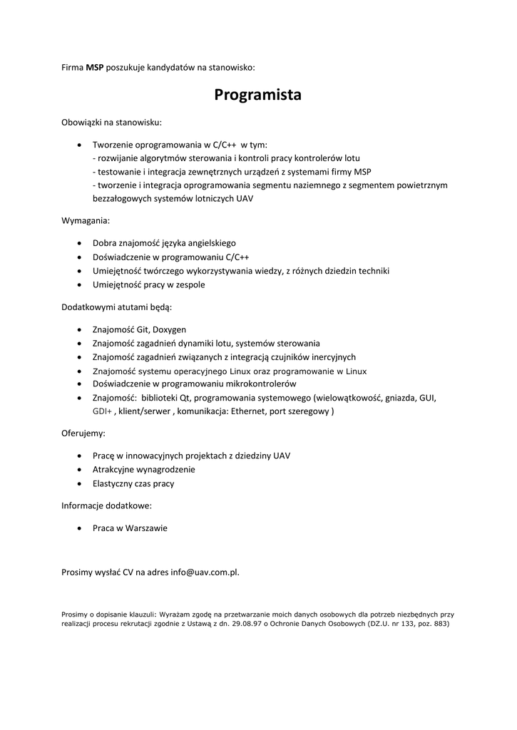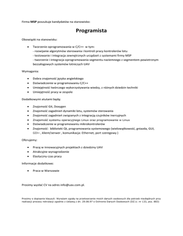 Firma MSP poszukuje kandydatów na stanowisko: Programista Obowiązki na stanowisku: Tworzenie oprogramowania w C/C++ w tym: - rozwijanie algorytmów sterowania i kontroli pracy kontrolerów lotu - testowanie i integracja zewnętrznych urządzeń z systemami firmy MSP - tworzenie i integracja oprogramowania segmentu naziemnego z segmentem powietrznym bezzałogowych systemów lotniczych UAV Wymagania: Dobra znajomość języka angielskiego Doświadczenie w programowaniu C/C++ Umiejętność twórczego wykorzystywania wiedzy, z różnych dziedzin techniki Umiejętność pracy w zespole Dodatkowymi atutami będą: Znajomość Git, Doxygen Znajomość zagadnień dynamiki lotu, systemów sterowania Znajomość zagadnień związanych z integracją czujników inercyjnych Znajomość systemu operacyjnego Linux oraz programowanie w Linux Doświadczenie w programowaniu mikrokontrolerów Znajomość: biblioteki Qt, programowania systemowego (wielowątkowość, gniazda, GUI, GDI+ , klient/serwer , komunikacja: Ethernet, port szeregowy ) Oferujemy: Pracę w innowacyjnych projektach z dziedziny UAV Atrakcyjne wynagrodzenie Elastyczny czas pracy Informacje dodatkowe: Praca w Warszawie Prosimy wysłać CV na adres [email protected]. Prosimy o dopisanie klauzuli: Wyrażam zgodę na przetwarzanie moich danych osobowych dla potrzeb niezbędnych przy realizacji procesu rekrutacji zgodnie z Ustawą z dn. 29.08.97 o Ochronie Danych Osobowych (DZ.U. nr 133, poz. 883)