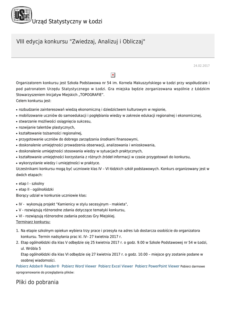 Urząd Statystyczny w Łodzi VIII edycja konkursu "Zwiedzaj, Analizuj i Obliczaj" 24.02.2017 Organizatorem konkursu jest Szkoła Podstawowa nr 54 im. Kornela Makuszyńskiego w Łodzi przy współudziale i pod patronatem Urzędu Statystycznego w Łodzi. Gra miejska będzie zorganizowana wspólnie z Łódzkim Stowarzyszeniem Inicjatyw Miejskich „TOPOGRAFIE”. Celem konkursu jest: ● rozbudzanie zainteresowań wiedzą ekonomiczną i dziedzictwem kulturowym w regionie, ● mobilizowanie uczniów do samoedukacji i pogłębiania wiedzy w zakresie edukacji regionalnej i ekonomicznej, ● stwarzanie możliwości osiągnięcia sukcesu, ● rozwijanie talentów plastycznych, ● kształtowanie tożsamości regionalnej, ● przygotowanie uczniów do dobrego zarządzania środkami finansowymi, ● doskonalenie umiejętności prowadzenia obserwacji, analizowania i wnioskowania, ● doskonalenie umiejętności stosowania wiedzy w sytuacjach praktycznych, ● kształtowanie umiejętności korzystania z różnych źródeł informacji w czasie przygotowań do konkursu, ● wykorzystanie wiedzy i umiejętności w praktyce. Uczestnikami konkursu mogą być uczniowie klas IV – VI łódzkich szkół podstawowych. Konkurs organizowany jest w dwóch etapach: ● etap I - szkolny ● etap II - ogólnołódzki Biorący udział w konkursie uczniowie klas: ● IV - wykonują projekt "Kamienicy w stylu secesyjnym - makieta", ● V - rozwiązują różnorodne zdania dotyczące tematyki konkursu, ● VI - rozwiązują różnorodne zadania podczas Gry Miejskiej. Terminarz konkursu: 1. Na etapie szkolnym opiekun wybiera trzy prace i przesyła na adres lub dostarcza osobiście do organizatora konkursu. Termin nadsyłania prac kl. IV– 27 kwietnia 2017 r. 2. Etap ogólnołódzki dla klas V odbędzie się 25 kwietnia 2017 r. o godz. 9.00 w Szkole Podstawowej nr 54 w Łodzi, ul. Wróbla 5 Etap ogólnołódzki dla klas VI odbędzie się 27 kwietnia 2017 r. o godz. 10.00 – miejsce gry zostanie podane w osobnej wiadomości. Pobierz Adobe® Reader® Pobierz Word Viewer Pobierz Excel Viewer Pobierz PowerPoint Viewer Pobierz darmowe oprogramowanie do przeglądania plików: Pliki do pobrania Regulamin 0.29 MB Oświadczenie 0.02 MB Zgłoszenie do konkursu 0.03 MB Archiwum 2016 VII edycja konkursu "Zwiedzaj, Analizuj i Obliczaj" 2015 VI edycja konkursu "Zwiedzaj, Analizuj i Obliczaj" 2014 V edycja Konkursu "Zwiedzaj, Analizuj i Obliczaj"