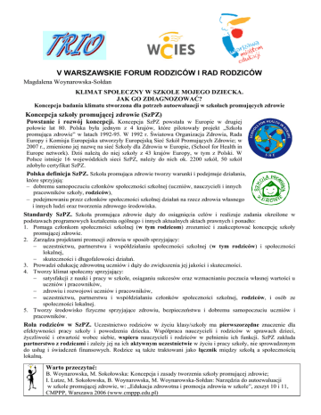 V WARSZAWSKIE FORUM RODZICÓW I RAD RODZICÓW Magdalena Woynarowska-Sołdan KLIMAT SPOŁECZNY W SZKOLE MOJEGO DZIECKA. JAK GO ZDIAGNOZOWAĆ? Koncepcja badania klimatu stworzona dla potrzeb autoewaluacji w szkołach promujących zdrowie Koncepcja szkoły promującej zdrowie (SzPZ) Powstanie i rozwój koncepcji. Koncepcja SzPZ powstała w Europie w drugiej połowie lat 80. Polska była jednym z 4 krajów, które pilotowały projekt „Szkoła promująca zdrowie” w latach 1992-95. W 1992 r. Światowa Organizacja Zdrowia, Rada Europy i Komisja Europejska utworzyły Europejską Sieć Szkół Promujących Zdrowie; w 2007 r., zmieniono jej nazwę na sieć Szkoły dla Zdrowia w Europie, (School for Health in Europe network). Dziś należą do niej szkoły z 43 krajów Europy, w tym z Polski. W Polsce istnieje 16 wojewódzkich sieci SzPZ, należy do nich ok. 2200 szkół, 50 szkół zdobyło certyfikat SzPZ. Polska definicja SzPZ. Szkoła promująca zdrowie tworzy warunki i podejmuje działania, które sprzyjają: – dobremu samopoczuciu członków społeczności szkolnej (uczniów, nauczycieli i innych pracowników szkoły, rodziców), – podejmowaniu przez członków społeczności szkolnej działań na rzecz zdrowia własnego i innych ludzi oraz tworzenia zdrowego środowiska. Standardy SzPZ. Szkoła promująca zdrowie dąży do osiągnięcia celów i realizuje zadania określone w podstawach programowych kształcenia ogólnego i innych aktualnych aktach prawnych i ponadto: 1. Pomaga członkom społeczności szkolnej (w tym rodzicom) zrozumieć i zaakceptować koncepcję szkoły promującej zdrowie. 2. Zarządza projektami promocji zdrowia w sposób sprzyjający: uczestnictwu, partnerstwu i współdziałaniu społeczności szkolnej (w tym rodziców) i społeczności lokalnej, skuteczności i długofalowości działań. 3. Prowadzi edukację zdrowotną uczniów i dąży do zwiększenia jej jakości i skuteczności. 4. Tworzy klimat społeczny sprzyjający: satysfakcji z nauki i pracy w szkole, osiąganiu sukcesów oraz wzmacnianiu poczucia własnej wartości u uczniów i pracowników, zdrowiu i rozwojowi uczniów i pracowników, uczestnictwu, partnerstwu i współdziałaniu członków społeczności szkolnej, rodziców, i osób ze społeczności lokalnej. 5. Tworzy środowisko fizyczne sprzyjające zdrowiu, bezpieczeństwu i dobremu samopoczuciu uczniów i pracowników. Rola rodziców w SzPZ. Uczestnictwo rodziców w życiu klasy/szkoły ma pierwszorzędne znaczenie dla efektywności pracy szkoły i powodzenia dziecka. Współpraca nauczycieli i rodziców w sprawach dzieci, życzliwość i otwartość wobec siebie, wspiera nauczycieli i rodziców w pełnieniu ich funkcji. SzPZ zakłada partnerstwo z rodzicami i zależy jej na ich aktywnym uczestnictwie w życiu i pracy szkoły, nie sprowadzonym do usług i świadczeń finansowych. Rodzice są także traktowani jako łącznik między szkołą a społecznością lokalną. Warto przeczytać: B. Woynarowska, M. Sokołowska: Koncepcja i zasady tworzenia szkoły promującej zdrowie; I. Lutze, M. Sokołowska, B. Woynarowska, M. Woynarowska-Sołdan: Narzędzia do autoewaluacji w szkole promującej zdrowie, w: „Edukacja zdrowotna i promocja zdrowia w szkole”, zeszyt 10 i 11, CMPPP, Warszawa 2006 (www.cmppp.edu.pl) Klimat społeczny szkoły Jest w szkole coś nieuchwytnego – styl, wydźwięk, atmosfera, coś, co czujesz za skórą po jakimś czasie spędzonym w tej szkole R. Fisher, 1999 Znaczenie pozytywnego klimatu społecznego szkoły 1. Sprzyja osiągnięciom szkolnym uczniów, ich motywacji do nauki, satysfakcji ze szkoły, a w przypadku nauczycieli – satysfakcji z pracy 2. Wpływa korzystnie na zdrowie psychiczne, poczucie własnej wartości i samopoczucie uczniów i pracowników 3. Zmniejsza ryzyko występowania wśród uczniów zachowań problemowych 4. Sprzyja satysfakcji rodziców ze szkoły ich dziecka, zwiększa ich zaufanie do szkoły, zachęca do współpracy ze szkołą i większego, bardziej aktywnego uczestnictwa w rozwiązywaniu problemów dziecka w szkole Definicja klimatu. Klimat społeczny szkoły jest pojęciem: określanym różnymi terminami pokrewnymi, złożonym, niejednoznacznym, różnie definiowanym, subiektywnym, składającym się z wielu wymiarów (elementów). Klimat społeczny w SzPZ zdefiniowano przez ustalenie specyficznych dla niej 2 grup wymiarów: • Satysfakcja z nauki lub pracy w szkole • Stwarzanie członkom społeczności szkolnej możliwości uczestnictwa w życiu i pracy szkoły Wymiary • Relacje międzyludzkie pozytywne • Wsparcie społeczne • Motywowane do osiągania sukcesów • Możliwości efektywnej pracy na lekcjach • Przestrzeganie praw uczniów, znajomość reguł i ich ocena Wymiary • Przeciążenie nauką/ pracą oraz częste odczuwanie stresu w szkole negatywne • Występowanie przemocy i zachowań aspołecznych wśród uczniów Metody badania klimatu społecznego w SzPZ Uczniowie klas III szkoły podstawowej Uczniowie klas V szkoły podstawowej Uczniowie klas VI szkoły podstawowej, II gimnazjum i szkół ponadgimnazjalnych Nauczyciele Inni pracownicy szkoły Rodzice Planowanie zmian Technika„Narysuj i napisz” - temat: „Co lubię w mojej klasie?” „Czego nie lubię w mojej klasie Praca pisemna na temat: „Jak mi się żyje w mojej klasie” Ankieta „Klimat w mojej szkole?” Ankieta „Klimat społeczny w mojej szkole” Ankieta „Klimat społeczny w szkole Ankieta „Klimat społeczny w szkole mojego dziecka 1. Diagnoza klimatu społecznego jest pierwszym krokiem w działaniach na rzecz jego poprawy – pozwala określić obszary, nad którymi można pracować 2. Diagnoza klimatu i podjęcie działań na rzecz jego poprawy muszą być akceptowane przez większość członków społeczności szkolnej 3. Wyniki diagnozy wymagają pogłębionej analizy. Powinny być one: – analizowane przez osoby znające specyfikę danej szkoły (klasy) – prezentowane wsz