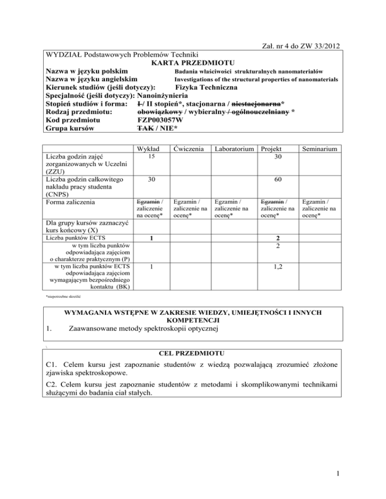 Zał. nr 4 do ZW 33/2012 WYDZIAŁ Podstawowych Problemów Techniki KARTA PRZEDMIOTU Nazwa w języku polskim Badania właściwości strukturalnych nanomateriałów Nazwa w języku angielskim Investigations of the structural properties of nanomaterials Kierunek studiów (jeśli dotyczy): Fizyka Techniczna Specjalność (jeśli dotyczy): Nanoinżynieria Stopień studiów i forma: I / II stopień*, stacjonarna / niestacjonarna* Rodzaj przedmiotu: obowiązkowy / wybieralny / ogólnouczelniany * Kod przedmiotu FZP003057W Grupa kursów TAK / NIE* Wykład Liczba godzin zajęć zorganizowanych w Uczelni (ZZU) Liczba godzin całkowitego nakładu pracy studenta (CNPS) Forma zaliczenia 15 Laboratorium Projekt 30 30 60 Egzamin / zaliczenie na ocenę* Ćwiczenia Egzamin / zaliczenie na ocenę* Egzamin / zaliczenie na ocenę* Egzamin / zaliczenie na ocenę* Seminarium Egzamin / zaliczenie na ocenę* Dla grupy kursów zaznaczyć kurs końcowy (X) Liczba punktów ECTS w tym liczba punktów odpowiadająca zajęciom o charakterze praktycznym (P) w tym liczba punktów ECTS odpowiadająca zajęciom wymagającym bezpośredniego kontaktu (BK) 1 2 2 1 1,2 *niepotrzebne skreślić WYMAGANIA WSTĘPNE W ZAKRESIE WIEDZY, UMIEJĘTNOŚCI I INNYCH KOMPETENCJI 1. Zaawansowane metody spektroskopii optycznej \ CEL PRZEDMIOTU C1. Celem kursu jest zapoznanie studentów z wiedzą pozwalającą zrozumieć złożone zjawiska spektroskopowe. C2. Celem kursu jest zapoznanie studentów z metodami i skomplikowanymi technikami służącymi do badania ciał stałych. 1 PRZEDMIOTOWE EFEKTY KSZTAŁCENIA Student Z zakresu wiedzy: PEK_W01 ma podbudowaną teoretycznie szczegółową wiedzę z zakresu spektroskopii pozwalającą zrozumieć podstawowe oraz złożone zjawiska spektroskopowe PEK_W02 zna zasady działania urządzeń, przyrządów pomiarowych i sprzętu wykorzystywanych w badaniach spektroskopowych i elektrycznych Z zakresu umiejętności: PEK_U01 potrafi obsługiwać skomplikowaną aparaturę pomiarową używaną w badaniach fizycznych własności atomów, cząsteczek i ciał stałych Z zakresu kompetencji społecznych: PEK_K01 potrafi współdziałać i pracować w grupie, przyjmując w niej różne role, także kierownicze TREŚCI PROGRAMOWE Wy1 Wy2 Wy3 Wy4 Wy5 Pr1 Pr2 Pr3 Pr4 Pr5 Pr6 Forma zajęć - wykład Spektroskopia rozpraszania Ramana Spektroskopia absorpcji w podczerwieni (FTIR) Dyfrakcja promieni rentgenowskich (XRD) Transmisyjna mikroskopia elektronowa (TEM) i mikroskopia sił atomowych (AFM) Spektroskopia rozpraszania Rutherforda (RBS) Suma godzin Liczba godzin Forma zajęć - projekt Pomiary rozpraszania Ramana – mody optyczne w nanomateriałach Pomiary rozpraszania Ramana – mody akustyczne w nanomateriałach Absorpcja w podczerwieni – pomiary metodą ATR Absorpcja w podczerwieni – pomiary w modzie transmisyjnym Pomiary dyfrakcji promieni rentgenowskich (XRD) Pomiary mikroskopii sił atomowych (AFM) Suma godzin Liczba godzin 4 4 4 2 1 15 5 5 5 5 5 5 30 STOSOWANE NARZĘDZIA DYDAKTYCZNE N1. Wykład z użyciem narzędzi mulitmedialnych N2. Samodzielne wykonanie doświadczeń w laboratorium N3. Samodzielne opracowanie i analiza wyników eksperymentalnych 2 OCENA OSIĄGNIĘCIA PRZEDMIOTOWYCH EFEKTÓW KSZTAŁCENIA Oceny (F – formująca (w trakcie semestru), P – podsumowująca (na koniec semestru) F1 (wykład) P = F1 F2 (projekt) Numer efektu kształcenia Sposób oceny osiągnięcia efektu kształcenia PEK_W01 PEK_W02 Kolokwium zaliczeniowe PEK_U01 PEK01 Sprawozdanie w formie pisemnej z opracowanych i zanalizowanych pomiarów wykonywanych w ramach laboratorium P = F2 LITERATURA PODSTAWOWA I UZUPEŁNIAJĄCA LITERATURA PODSTAWOWA: [1] Fizyka Ciała Stałego, Neil W. Ashcroft, N. David Mermin, PWN [2] Wstęp do Fizyki Ciała Stałego, Charles Kittel, PWN LITERATURA UZUPEŁNIAJĄCA: [1] Introductory Raman Spectroscopy, John R. Ferraro, Kazuo Nakamoto and Chris W. Brown (Elsevier, 2003) OPIEKUN PRZEDMIOTU (IMIĘ, NAZWISKO, ADRES E-MAIL) dr inż. Grzegorz Zatryb ([email protected]) 3 MACIERZ POWIĄZANIA EFEKTÓW KSZTAŁCENIA DLA PRZEDMIOTU Badania właściwości strukturalnych nanomateriałów Z EFEKTAMI KSZTAŁCENIA NA KIERUNKU Fizyka Techniczna I SPECJALNOŚCI Nanoinżynieria Przedmiotowy efekt kształcenia PEK_W01 (wiedza) PEK_W02 PEK_U01 Odniesienie przedmiotowego efektu do efektów kształcenia zdefiniowanych dla kierunku studiów i specjalności (o ile dotyczy)** Cele przedmiotu*** Treści programowe*** Numer narzędzia dydaktycznego*** K2FTE_W12_S1NIN C1 Wy1-Wy3 N1 K2FTE_W10_S1NIN K2FTE_U11_S1NIN C1-C2 C2 Wy4-Wy5 Pr1-Pr6 N1 N2, N3 K2FTE_K03 C1-C2 Pr1-Pr6 N2, N3 (umiejętności) PEK_K01 (kompetencje) ** - wpisać symbole kierunkowych/specjalnościowych efektów kształcenia *** - z tabeli powyżej
