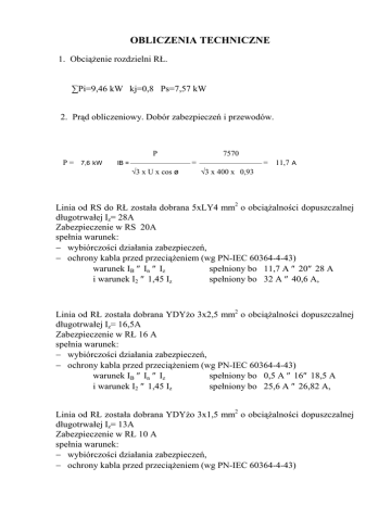 OBLICZENIA TECHNICZNE 1. Obciążenie rozdzielni RŁ. ∑Pi=9,46 kW kj=0,8 Ps=7,57 kW 2. Prąd obliczeniowy. Dobór zabezpieczeń i przewodów. P P = 7,6 kW 15000 7570 = IB = √3 x U x cos ø = 11,7 A √3 x 400 x 0,93 Linia od RS do RŁ została dobrana 5xLY4 mm2 o obciążalności dopuszczalnej długotrwałej Iz= 28A Zabezpieczenie w RS 20A spełnia warunek: − wybiórczości działania zabezpieczeń, − ochrony kabla przed przeciążeniem (wg PN-IEC 60364-4-43) warunek IB ≤ In ≤ Iz spełniony bo 11,7 A ≤ 20≤ 28 A i warunek I2 ≤ 1,45 Iz spełniony bo 32 A ≤ 40,6 A, Linia od RŁ została dobrana YDYżo 3x2,5 mm2 o obciążalności dopuszczalnej długotrwałej Iz= 16,5A Zabezpieczenie w RŁ 16 A spełnia warunek: − wybiórczości działania zabezpieczeń, − ochrony kabla przed przeciążeniem (wg PN-IEC 60364-4-43) spełniony bo 0,5 A ≤ 16≤ 18,5 A warunek IB ≤ In ≤ Iz i warunek I2 ≤ 1,45 Iz spełniony bo 25,6 A ≤ 26,82 A, Linia od RŁ została dobrana YDYżo 3x1,5 mm2 o obciążalności dopuszczalnej długotrwałej Iz= 13A Zabezpieczenie w RŁ 10 A spełnia warunek: − wybiórczości działania zabezpieczeń, − ochrony kabla przed przeciążeniem (wg PN-IEC 60364-4-43) warunek IB ≤ In ≤ Iz i warunek I2 ≤ 1,45 Iz spełniony bo 0,5 A ≤ 10≤ 13 A spełniony bo 16 A ≤ 18,85 A, Sprawdzenie skuteczności zerowania będzie możliwe po otrzymaniu z Zakładu Energetycznego projektu sieci zewnętrznej zasilającej budynek określającego wielkości transformatorów, długości i przekroje kabli zasilających.