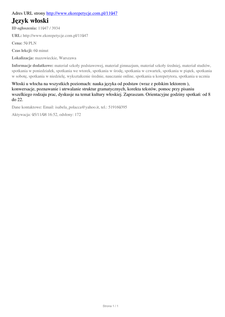 Adres URL strony http://www.ekorepetycje.com.pl/11047 Język włoski ID ogłoszenia: 11047 / 3934 URL: http://www.ekorepetycje.com.pl/11047 Cena: 50 PLN Czas lekcji: 60 minut Lokalizacja: mazowieckie, Warszawa Informacje dodatkowe: materiał szkoły podstawowej, materiał gimnazjum, materiał szkoły średniej, materiał studiów, spotkania w poniedziałek, spotkania we wtorek, spotkania w środę, spotkania w czwartek, spotkania w piątek, spotkania w sobotę, spotkania w niedzielę, wykształcenie średnie, nauczanie online, spotkania u korepetytora, spotkania u ucznia Włoski u włocha na wszystkich poziomach: nauka języka od podstaw (wraz z polskim lektorem ), konwersacje, poznawanie i utrwalanie struktur gramatycznych, korekta tekstów, pomoc przy pisaniu wszelkiego rodzaju prac, dyskusje na temat kultury włoskiej. Zapraszam. Orientacyjne godziny spotkań: od 8 do 22. Dane kontaktowe: Email: [email protected], tel.: 519160395 Aktywacja: 05/11/08 16:52, odsłony: 172 Strona 1 / 1