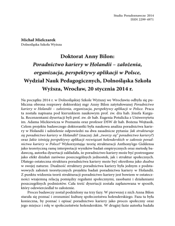 Studia Poradoznawcze 2014 ISSN 2299-4971 Michał Mielczarek Dolnośląska Szkoła Wyższa Doktorat Anny Bilon: Poradnictwo kariery w Holandii – założenia, organizacja, perspektywy aplikacji w Polsce, Wydział Nauk Pedagogicznych, Dolnośląska Szkoła Wyższa, Wrocław, 20 stycznia 2014 r. Na początku 2014 r. w Dolnośląskiej Szkole Wyższej we Wrocławiu odbyła się publiczna obrona rozprawy doktorskiej mgr Anny Bilon zatytułowanej Poradnictwo kariery w Holandii – założenia, organizacja, perspektywy aplikacji w Polsce. Praca ta została napisana pod kierunkiem naukowym prof. zw. dra hab. Józefa Kargula. Recenzentami dysertacji byli prof. zw. dr hab. Eugenia Potulicka z Uniwersytetu im. Adama Mickiewicza w Poznaniu oraz profesor DSW dr hab. Bożena Wojtasik. Celem projektu badawczego doktorantki była naukowa analiza poradnictwa kariery w Holandii i udzielenie odpowiedzi na dwa zasadnicze pytania: Jak strukturuje się poradnictwo kariery w Holandii? (inaczej: Jak „tworzy się” poradnictwo kariery?) oraz Jakie istnieją perspektywy aplikacji rozwiązań holenderskich w zakresie poradnictwa kariery w Polsce? Wykorzystując teorię strukturacji Anthony’ego Giddensa jako teoretyczną ramę interpretacji wyników badań empirycznych oraz metodę badawczą, autorka dysertacji zakładała, że poradnictwo kariery może być postrzegane jako efekt działań zarówno poszczególnych jednostek, jak i struktur społecznych. Dlatego ostateczna struktura poradnictwa kariery może być określona jako dualna w swojej naturze. Dualność struktury poradnictwa kariery była jednym z podstawowych założeń teoretycznych projektu badań poradnictwa kariery w Holandii. Z punktu widzenia teorii strukturacji poradnictwo kariery jest bowiem w ostateczności wzajemną relacją pomiędzy regułami społecznymi, zasobami i działaniami poszczególnych podmiotów. Cała treść dysertacji została zaplanowana w sposób, który odzwierciedlał to założenie. Proces badawczy został podzielony na trzy fazy. W pierwszej z nich Anna Bilon starała się poznać i zrozumieć kulturę społeczeństwa holenderskiego. Faza ta była konieczna, by poznać i opisać poradnictwo kariery jako proces społeczny oraz jego miejsce i rolę w społeczeństwie holenderskim. W drugiej fazie autorka badała 186 Studia Poradoznawcze 2014 holenderski system poradnictwa. Faza trzecia poświęcona była odpowiedzi na pytanie, czy jest możliwe zastosowanie holenderskich rozwiązań w Polsce. W fazie tej autorka dysertacji nie prowadziła badań polskiego poradnictwa kariery, stąd też nie mogła korzystać z metod stosowanych w pedagogice porównawczej. Poprzez wykorzystanie innej metody badawczej, jaką jest język przejrzystego kontrastu Charlesa Taylora, pokazała, że w tej fazie badań jej analiza była w swej naturze konceptualna. Rozprawa doktorska Anny Bilon składa się z pięciu rozdziałów. W pierwszym autorka analizuje poradnictwo kariery jako proces społeczny. Stąd też, ten rozdział poświęcony jest analizom kontekstów społecznych poradnictwa oraz znaczeniu różnic kulturowych dla organizacji poradnictwa kariery na świecie. Ponadto pierwszy rozdział zawiera analizę dyskursu naukowego dotyczącego rozwoju idei poradnictwa kariery. W rezultacie zidentyfikowane zostały współczesne nurty w badaniach tego rodzaju poradnictwa. W drugim rozdziale autorka przedstawiła metodologię badań własnych. Wyjaśniła w nim powody i sposoby wykorzystania teorii strukturacji jako metody badawczej i teoretycznej ramy interpretacji wyników badań empirycznych. Rozdział trzeci jest prezentacją kontekstów społeczno-kulturowych holenderskiego poradnictwa kariery. Przedstawione zostały tutaj podstawowe informacje o kraju i społeczeństwie holenderskim. Część rozdziału autorka poświęciła również opisowi holenderskiego systemu edukacji, gospodarki i rynku pracy. Było to konieczne, ponieważ poradnictwo kariery jest umiejscowione w obu tych sektorach. W czwartym rozdziale opisany został system poradnictwa kariery w Holandii. Treść tego rozdziału może być podzielona na dwie części: pierwsza z nich koncentruje się na regułach i zasobach holenderskiego systemu poradnictwa kariery, a druga ma na celu opis holenderskich instytucji poradnictwa oraz strategii działań, podejmowanych przez te organizacje. Autorka szczegółowo opisała działalność kilku instytucji prywatnych, zwracając uwagę na istniejącą w Holandii kulturowo uwarunkowaną tradycję włączania instytucji prywatnych w zapewnianie usług publicznych. Dokonała również analizy spójności całego systemu. Ostatni rozdział jest poświęcony krytycznej analizie możliwości aplikacji rozwiązań holenderskich w Polsce. Autorka, podobnie jak i inni badacze, podkreśliła konieczność zachowania ostrożności w próbach udzielania odpowiedzi na tego rodzaju pytania. Głównym wnioskiem wyłaniającym się z analiz było stwierdzenie, że istnieją zarówno możliwości, jak i przeszkody oraz przeciwwskazania aplikacji rozwiązań holenderskich w polskim poradnictwie kariery. Przygotowana przez Annę Bilon praca doktorska została bardzo wysoko oceniona przez obydwie recenzentki, sama obrona zaś okazała się ważnym wydarzeniem naukowym w życiu uczelni. Najczęstszą pochwałą – wyrażaną również przez innych uczestników tego wydarzenia, nie tylko recenzentek było podkreślanie wybitnej świadomości teoretycznej i metodologicznej doktorantki oraz znakomitej umiejętności wiązania przez nią wykorzystanej teorii z prowadzonymi badaniami i zarazem nowatorstwo jej pracy. Obie recenzentki zgodnie uznały, iż praca z całą V. Aktualności i kronika 187 pewnością zasługuje na wyróżnienie i zgłosiły stosowny wniosek w tej sprawie. Profesor Eugenia Potulicka wyraziła nadto opinię, iż rozprawa ta powinna zostać zgłoszona do nagrody ministra nauki i szkolnictwa wyższego. Ostatecznie, jednomyślną decyzj