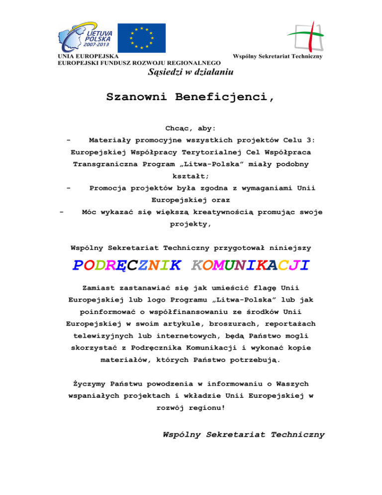 UNIA EUROPEJSKA EUROPEJSKI FUNDUSZ ROZWOJU REGIONALNEGO Wspólny Sekretariat Techniczny Sąsiedzi w działaniu Szanowni Beneficjenci, Chcąc, aby: - Materiały promocyjne wszystkich projektów Celu 3: Europejskiej Współpracy Terytorialnej Cel Współpraca Transgraniczna Program „Litwa-Polska” miały podobny kształt; - Promocja projektów była zgodna z wymaganiami Unii Europejskiej oraz - Móc wykazać się większą kreatywnością promując swoje projekty, Wspólny Sekretariat Techniczny przygotował niniejszy PODRĘCZNIK KOMUNIKACJI Zamiast zastanawiać się jak umieścić flagę Unii Europejskiej lub logo Programu „Litwa-Polska” lub jak poinformować o współfinansowaniu ze środków Unii Europejskiej w swoim artykule, broszurach, reportaŜach telewizyjnych lub internetowych, będą Państwo mogli skorzystać z Podręcznika Komunikacji i wykonać kopie materiałów, których Państwo potrzebują. śyczymy Państwu powodzenia w informowaniu o Waszych wspaniałych projektach i wkładzie Unii Europejskiej w rozwój regionu! Wspólny Sekretariat Techniczny UNIA EUROPEJSKA EUROPEJSKI FUNDUSZ ROZWOJU REGIONALNEGO Wspólny Sekretariat Techniczny Sąsiedzi w działaniu SPIS TREŚCI Informacja Podstawowe wymagania wobec osób realizujących projekty Proces komunikacji Aneksy Załącznik 1. Loga Aneks 2. Naklejki Aneks 3. Części składowe artykułu Aneks 4. Materiały rozdawane podczas wydarzeń Zalecenia Porady, które mogą usprawnić komunikację UNIA EUROPEJSKA EUROPEJSKI FUNDUSZ ROZWOJU REGIONALNEGO Wspólny Sekretariat Techniczny Sąsiedzi w działaniu Podstawowe wymagania wobec osób realizujących projekty KaŜdy projekt Celu 3: Europejskiej Współpracy Terytorialnej Programu Współpracy Transgranicznej „LitwaPolska” musi informować o wsparciu jakie otrzymał z Unii Europejskiej (Europejskiego Regionalnego). ramach Celu Musi 3: Funduszu informować, Europejskiej jest Ŝe Rozwoju realizowany Współpracy w Terytorialnej Programu Współpracy Transgranicznej „Litwa-Polska”. Zgodnie z 1828/2006 Artykułem z dnia 8 2 Rozporządzenia grudnia 2006 Komisji oraz z (WE) nr Podręcznikiem Programu (Rozdział 5.5.2) Cel 3: Europejskiej Współpracy Terytorialnej Programu Współpracy Transgranicznej „LitwaPolska”, projekty wszystkich swoich muszą umieścić materiałach 5 elementów na informacyjnych i promocyjnych (ulotki, pamiątki, rzeczy zakupione, itp.): 1. Flaga Unii Europejskiej 2. Logo Celu 3: Europejskiej Współpracy Terytorialnej Programu Współpracy Transgranicznej „Litwa-Polska”, 3. Zwrot: UNIA EUROPEJSKA 4. Zwrot EUROPEJSKI FUNDUSZ ROZWOJU REGIONALNEGO 5. Hasło Programu: Sąsiedzi w działaniu (w języku angielskim: Neighbours in action) W Projekcie naleŜy wykonać co najmniej następujące działania informacjyjne i środki promocji: Opublikować w prasie lokalnej przynajmniej 2 informacje o rozpoczęciu projektu, działaniach oraz rezultatach do osiągnięcia w szczególności przez partnerów projektu oraz o osiągnięciach końcowych projektu; UNIA EUROPEJSKA EUROPEJSKI FUNDUSZ ROZWOJU REGIONALNEGO Wspólny Sekretariat Techniczny Sąsiedzi w działaniu Opublikować w lokalnej gazecie co najmniej 1 artykuł opisujący wdraŜanie projektu, korzyści dla społeczeństwa oraz regionu przygranicznego; Wydać oraz rozpowszechnić co najmniej 2 zestawy publikacji, np.: ulotki, plakaty, kalendarze, inne materiały; Oznaczyć kaŜdy zakup części wyposaŜenia, mebli itp. specjalnymi naklejkami/etykietkami, informującymi o współfinansowaniu przez Unię Europejską, Europejski Fundusz Rozwoju Regionalnego; Zamieścić na terenie realizacji projektu trwałą plakietkę informującą (na zrekonstruowanym lub wybudowanym obiekcie, drodze, zakupionym samochodzie, etc.) nie później niŜ 6 miesięcy po zakończeniu działań (wymagania odnośnie plakietki moŜna znaleźć w Podręczniku Programu). Te wymagania odnoszą się do projektów, które otrzymują dofinansowanie z Europejskiego Funduszu Rozwoju Regionalnego przekraczające 500.000 euro, oraz które dotyczą zakupów środków trwałych, inwestycji w infrastrukturę lub działań budowlanych; Zamieścić tablice informacyjną na terenie projektu w trakcie okresu wdraŜania projektu. Wymaganie te odnosi się do projektów, które otrzymają dofinansowanie z Europejskiego Funduszu Rozwoju Regionalnego, w wysokości przekraczającej 500.000 euro, oraz które realizują rozwój infrastrukturalny lub prace budowlane. NaleŜy zwracać wymienionych zostać 5 uwagę, Ŝe obowiązkowych wymieniona nazwa niezaleŜnie elementów oraz od musi rodzaj wyŜej równieŜ (budowa, infrastruktura, itp.) projektu. 5 obowiązkowych elementów musi zajmować nie mniej niŜ 25% całego obszaru plakietki lub tablicy pamiątkowej. KaŜdy projekt przed podpisaniem Umowy o Dofinansowanie przedstawi plan komunikacji (bazując na Wniosku o dofinansowanie) Specjaliście ds. Informacji i Promocji ze Wspólnego Sekretariatu Technicznego. UNIA EUROPEJSKA EUROPEJSKI FUNDUSZ ROZWOJU REGIONALNEGO Wspólny Sekretariat Techniczny Sąsiedzi w działaniu Załącznik 1. Loga Wszystko, co Europejskiej: trzeba wiedzieć o fladze Unii http://europa.eu.int/abc/symbols/emblem/index_en.htm • Historia flagi Europejskiej; • Kolorowa oraz czarnobiała wersja flagi; • Graficzna wersja flagi, uŜywana, jako oznaczenie; • Wyjaśnienie jak uŜywać flagi. Wersja kolorowa: Wersja czarnobiała: Umieszczając flagę Unii Europejskiej na produktach i publikacjach informacyjnych naleŜy zwrócić uwagę, aby przestrzegane były poniŜsze zasady: Musi być dokładnie 12 gwiazdek; Wszystkie gwiazdki muszą być 1 ramieniem skierowane do góry (nie mogą być narysowane ukośnie). Wszystkie niezbędne informacje na temat logo Programu „Litwa-Polska” znajdują się na stronie: http://www.lietuva-polska.eu/index.php?1911348694 • • Kolorowa i czarnobiała wersja logo; Graficzne wersje logo, uŜywane przez projektantów. Wersja kolorowa: Wersja