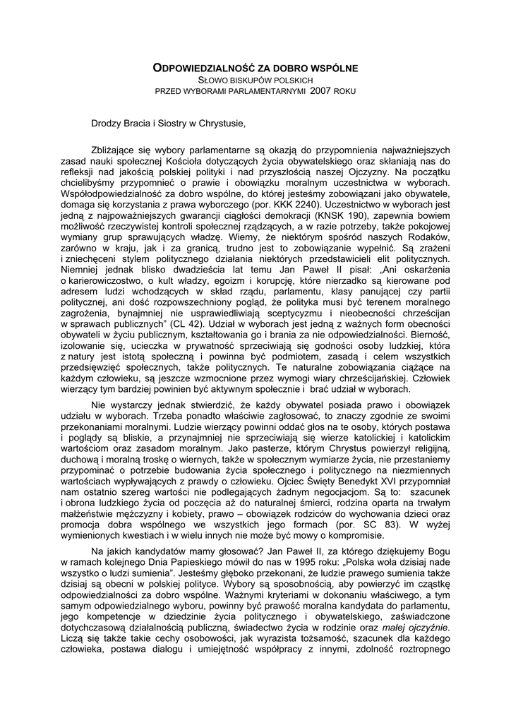 ODPOWIEDZIALNOŚĆ ZA DOBRO WSPÓLNE SŁOWO BISKUPÓW POLSKICH PRZED WYBORAMI PARLAMENTARNYMI 2007 ROKU Drodzy Bracia i Siostry w Chrystusie, Zbliżające się wybory parlamentarne są okazją do przypomnienia najważniejszych zasad nauki społecznej Kościoła dotyczących życia obywatelskiego oraz skłaniają nas do refleksji nad jakością polskiej polityki i nad przyszłością naszej Ojczyzny. Na początku chcielibyśmy przypomnieć o prawie i obowiązku moralnym uczestnictwa w wyborach. Współodpowiedzialność za dobro wspólne, do której jesteśmy zobowiązani jako obywatele, domaga się korzystania z prawa wyborczego (por. KKK 2240). Uczestnictwo w wyborach jest jedną z najpoważniejszych gwarancji ciągłości demokracji (KNSK 190), zapewnia bowiem możliwość rzeczywistej kontroli społecznej rządzących, a w razie potrzeby, także pokojowej wymiany grup sprawujących władzę. Wiemy, że niektórym spośród naszych Rodaków, zarówno w kraju, jak i za granicą, trudno jest to zobowiązanie wypełnić. Są zrażeni i zniechęceni stylem politycznego działania niektórych przedstawicieli elit politycznych. Niemniej jednak blisko dwadzieścia lat temu Jan Paweł II pisał: „Ani oskarżenia o karierowiczostwo, o kult władzy, egoizm i korupcję, które nierzadko są kierowane pod adresem ludzi wchodzących w skład rządu, parlamentu, klasy panującej czy partii politycznej, ani dość rozpowszechniony pogląd, że polityka musi być terenem moralnego zagrożenia, bynajmniej nie usprawiedliwiają sceptycyzmu i nieobecności chrześcijan w sprawach publicznych” (CL 42). Udział w wyborach jest jedną z ważnych form obecności obywateli w życiu publicznym, kształtowania go i brania za nie odpowiedzialności. Bierność, izolowanie się, ucieczka w prywatność sprzeciwiają się godności osoby ludzkiej, która z natury jest istotą społeczną i powinna być podmiotem, zasadą i celem wszystkich przedsięwzięć społecznych, także politycznych. Te naturalne zobowiązania ciążące na każdym człowieku, są jeszcze wzmocnione przez wymogi wiary chrześcijańskiej. Człowiek wierzący tym bardziej powinien być aktywnym społecznie i brać udział w wyborach. Nie wystarczy jednak stwierdzić, że każdy obywatel posiada prawo i obowiązek udziału w wyborach. Trzeba ponadto właściwie zagłosować, to znaczy zgodnie ze swoimi przekonaniami moralnymi. Ludzie wierzący powinni oddać głos na te osoby, których postawa i poglądy są bliskie, a przynajmniej nie sprzeciwiają się wierze katolickiej i katolickim wartościom oraz zasadom moralnym. Jako pasterze, którym Chrystus powierzył religijną, duchową i moralną troskę o wiernych, także w społecznym wymiarze życia, nie przestaniemy przypominać o potrzebie budowania życia społecznego i politycznego na niezmiennych wartościach wypływających z prawdy o człowieku. Ojciec Święty Benedykt XVI przypomniał nam ostatnio szereg wartości nie podlegających żadnym negocjacjom. Są to: szacunek i obrona ludzkiego życia od poczęcia aż do naturalnej śmierci, rodzina oparta na trwałym małżeństwie mężczyzny i kobiety, prawo – obowiązek rodziców do wychowania dzieci oraz promocja dobra wspólnego we wszystkich jego formach (por. SC 83). W wyżej wymienionych kwestiach i w wielu innych nie może być mowy o kompromisie. Na jakich kandydatów mamy głosować? Jan Paweł II, za którego dziękujemy Bogu w ramach kolejnego Dnia Papieskiego mówił do nas w 1995 roku: „Polska woła dzisiaj nade wszystko o ludzi sumienia”. Jesteśmy głęboko przekonani, że ludzie prawego sumienia także dzisiaj są obecni w polskiej polityce. Wybory są sposobnością, aby powierzyć im cząstkę odpowiedzialności za dobro wspólne. Ważnymi kryteriami w dokonaniu właściwego, a tym samym odpowiedzialnego wyboru, powinny być prawość moralna kandydata do parlamentu, jego kompetencje w dziedzinie życia politycznego i obywatelskiego, zaświadczone dotychczasową działalnością publiczną, świadectwo życia w rodzinie oraz małej ojczyźnie. Liczą się także takie cechy osobowości, jak wyrazista tożsamość, szacunek dla każdego człowieka, postawa dialogu i umiejętność współpracy z innymi, zdolność roztropnego rozwiązywania konfliktów, miłość do Ojczyzny oraz traktowanie władzy jako służby. Wybór takich kandydatów daje większą szansę na integralny i solidarny rozwój naszej Ojczyzny. Przed wyborami parlamentarnymi pragniemy jeszcze raz przypomnieć, że Kościół nie ma żadnej politycznej reprezentacji, a co za tym idzie partii politycznej, która miałaby prawo przemawiać w imieniu Kościoła lub powoływać się na jego poparcie. Zauważamy jednak, że programy niektórych ugrupowań politycznych i ich praktyka zaangażowania politycznego są bliższe chrześcijańskiej wizji człowieka i społeczeństwa, zaś programy innych partii są odległe od nauczania Kościoła lub wręcz z nim sprzeczne. Stąd odpowiedzialne oddanie głosu w wyborach wymaga rzetelnego rozeznania zarówno kandydatów, jak i programów. Rozbudzone emocje w żadnym wypadku nie są dobrym doradcą, a tym bardziej nie powinny stać się kryterium wyboru. Apelujemy o kulturę prowadzenia kampanii wyborczej. Nie może w niej być miejsca na wzajemną agresję i narastający konflikt. Nie powinniśmy ranić podczas kampanii wspólnoty, którą nazywamy naszą Ojczyzną, gdyż zawsze potrzebuje ona solidarności opartej na prawdzie. Apelujemy o zachowanie w kampanii wyborczej właściwego podziału ról i kompetencji zarówno duchownych, jak i świeckich. Wierni świeccy mają obowiązek angażować się w życie polityczne przez udział w wyborach i aktywność w tych partiach, które pozwalają uprawiać politykę rozumianą jako roztropna troska o dobro wspólne. Duszpasterze zaś, jako świadkowie rzeczywistości nadprzyrodzonej nie powinni angażować się w kampanii wyborczej po żadnej konkretnej stronie