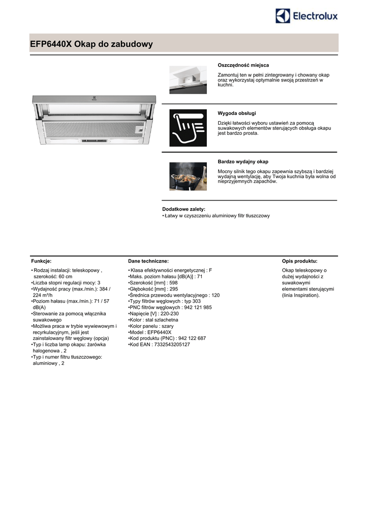 EFP6440X Okap do zabudowy Oszczędność miejsca Zamontuj ten w pełni zintegrowany i chowany okap oraz wykorzystaj optymalnie swoją przestrzeń w kuchni. Wygoda obsługi Dzięki łatwości wyboru ustawień za pomocą suwakowych elementów sterujących obsługa okapu jest bardzo prosta. Bardzo wydajny okap Mocny silnik tego okapu zapewnia szybszą i bardziej wydajną wentylację, aby Twoja kuchnia była wolna od nieprzyjemnych zapachów. Dodatkowe zalety: • Łatwy w czyszczeniu aluminiowy filtr tłuszczowy Funkcje: Dane techniczne: Opis produktu: • Rodzaj instalacji: teleskopowy , szerokość: 60 cm •Liczba stopni regulacji mocy: 3 •Wydajność pracy (max./min.): 384 / 224 m³/h •Poziom hałasu (max./min.): 71 / 57 dB(A) •Sterowanie za pomocą włącznika suwakowego •Możliwa praca w trybie wywiewowym i recyrkulacyjnym, jeśli jest zainstalowany filtr węglowy (opcja) •Typ i liczba lamp okapu: żarówka halogenowa , 2 •Typ i numer filtru tłuszczowego: aluminiowy , 2 • Klasa efektywności energetycznej : F •Maks. poziom hałasu [dB(A)] : 71 •Szerokość [mm] : 598 •Głębokość [mm] : 295 •Średnica przewodu wentylacyjnego : 120 •Typy filtrów węglowych : typ 303 •PNC filtrów węglowych : 942 121 985 •Napięcie [V] : 220-230 •Kolor : stal szlachetna •Kolor panelu : szary •Model : EFP6440X •Kod produktu (PNC) : 942 122 687 •Kod EAN : 7332543205127 Okap teleskopowy o dużej wydajności z suwakowymi elementami sterującymi (linia Inspiration). EFP6440X Okap do zabudowy