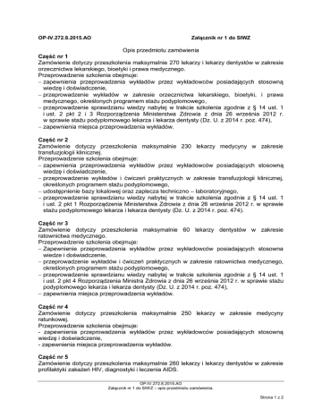 OP-IV.272.8.2015.AO Załącznik nr 1 do SIWZ Opis przedmiotu zamówienia Część nr 1 Zamówienie dotyczy przeszkolenia maksymalnie 270 lekarzy i lekarzy dentystów w zakresie orzecznictwa lekarskiego, bioetyki i prawa medycznego. Przeprowadzenie szkolenia obejmuje: zapewnienia przeprowadzenia wykładów przez wykładowców posiadających stosowną wiedzę i doświadczenie, przeprowadzenie wykładów w zakresie orzecznictwa lekarskiego, bioetyki, i prawa medycznego, określonych programem stażu podyplomowego, przeprowadzenie sprawdzianu wiedzy nabytej w trakcie szkolenia zgodnie z § 14 ust. 1 i ust. 2 pkt 2 i 3 Rozporządzenia Ministerstwa Zdrowia z dnia 26 września 2012 r. w sprawie stażu podyplomowego lekarza i lekarza dentysty (Dz. U. z 2014 r. poz. 474), zapewnienia miejsca przeprowadzenia wykładów. Część nr 2 Zamówienie dotyczy przeszkolenia maksymalnie 230 lekarzy medycyny w zakresie transfuzjologii klinicznej. Przeprowadzenie szkolenia obejmuje: zapewnienia przeprowadzenia wykładów przez wykładowców posiadających stosowną wiedzę i doświadczenie, przeprowadzenie wykładów i ćwiczeń praktycznych w zakresie transfuzjologii klinicznej, określonych programem stażu podyplomowego, udostępnienie bazy lokalowej oraz zaplecza techniczno – laboratoryjnego, przeprowadzenie sprawdzianu wiedzy nabytej w trakcie szkolenia zgodnie z § 14 ust. 1 i ust. 2 pkt 1 Rozporządzenia Ministerstwa Zdrowia z dnia 26 września 2012 r. w sprawie stażu podyplomowego lekarza i lekarza dentysty (Dz. U. z 2014 r. poz. 474). Część nr 3 Zamówienie dotyczy przeszkolenia maksymalnie 60 lekarzy dentystów w zakresie ratownictwa medycznego. Przeprowadzenie szkolenia obejmuje: Zapewnienie przeprowadzenia wykładów przez wykładowców posiadających stosowna wiedze i doświadczenie, przeprowadzenie wykładów i ćwiczeń praktycznych w zakresie ratownictwa medycznego, określonych programem stażu podyplomowego, przeprowadzenie sprawdzianu wiedzy nabytej w trakcie szkolenia zgodnie z § 14 ust. 1 i ust. 2 pkt 4 Rozporządzenia Ministra Zdrowia z dnia 26 września 2012 r. w sprawie stażu podyplomowego lekarza i lekarza dentysty (Dz. U. z 2014 r. poz. 474), zapewnienia miejsca przeprowadzenia wykładów. Część nr 4 Zamówienie dotyczy przeszkolenia maksymalnie 250 lekarzy w zakresie medycyny ratunkowej. Przeprowadzenie szkolenia obejmuje: - zapewnienia przeprowadzenia wykładów przez wykładowców posiadających stosowną wiedzę i doświadczenie, - zapewnienia miejsca przeprowadzenia wykładów. Część nr 5 Zamówienie dotyczy przeszkolenia maksymalnie 260 lekarzy i lekarzy dentystów w zakresie profilaktyki zakażeń HIV, diagnostyki i leczenia AIDS. OP-IV.272.8.2015.AO Załącznik nr 1 do SIWZ – opis przedmiotu zamówienia. Strona 1 z 2 Przeprowadzenie szkolenia obejmuje: zapewnienia przeprowadzenia wykładów przez wykładowców posiadających stosowną wiedzę i doświadczenie, przeprowadzenie wykładów w zakresie profilaktyki zakażeń HIV, diagnostyki i leczenia AIDS, określonych programem stażu podyplomowego, przeprowadzenie sprawdzianu wiedzy nabytej w trakcie szkolenia zgodnie z § 14 ust. 1 i ust. 2 pkt 1 Rozporządzenia Ministerstwa Zdrowia z dnia 26 września 2012 r. w sprawie stażu podyplomowego lekarza i lekarza dentysty (Dz. U. z 2014 r. poz. 474), zapewnienia miejsca przeprowadzenia wykładów. OP-IV.272.8.2015.AO Załącznik nr 1 do SIWZ – opis przedmiotu zamówienia. Strona 2 z 2