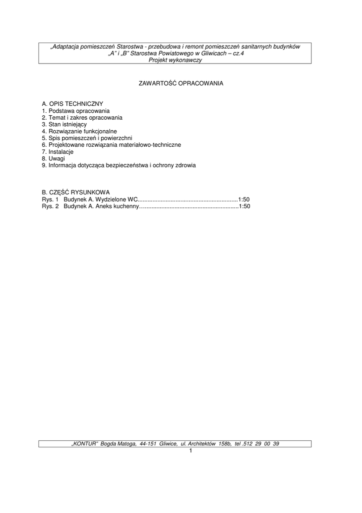 „Adaptacja pomieszczeń Starostwa - przebudowa i remont pomieszczeń sanitarnych budynków „A” i „B” Starostwa Powiatowego w Gliwicach – cz.4 Projekt wykonawczy ZAWARTOŚĆ OPRACOWANIA A. OPIS TECHNICZNY 1. Podstawa opracowania 2. Temat i zakres opracowania 3. Stan istniejący 4. Rozwiązanie funkcjonalne 5. Spis pomieszczeń i powierzchni 6. Projektowane rozwiązania materiałowo-techniczne 7. Instalacje 8. Uwagi 9. Informacja dotycząca bezpieczeństwa i ochrony zdrowia B. CZĘŚĆ RYSUNKOWA Rys. 1 Budynek A. Wydzielone WC.............................................................1:50 Rys. 2 Budynek A. Aneks kuchenny….........................................................1:50 „KONTUR” Bogda Matoga, 44-151 Gliwice, ul. Architektów 158b, tel .512 29 00 39 1 „Adaptacja pomieszczeń Starostwa - przebudowa i remont pomieszczeń sanitarnych budynków „A” i „B” Starostwa Powiatowego w Gliwicach – cz.4 Projekt wykonawczy OPIS TECHNICZNY 1. Podstawa opracowania - umowa z Inwestorem - uzgodniona koncepcja funkcjonalna - „Inwentaryzacja architektoniczno-budowlana budynku A, B i C” wykonana w październiku 2007r przez Atelier Urbanistyki-Architektury-Sztuki ul. Chopina 28/3, Gliwice - pomiary uzupełniające na miejscu 2. Temat i zakres opracowania Tematem opracowania jest projekt remontu wydzielonego WC na pierwszym piętrze budynku „A” oraz aneksu kuchennego na parterze budynku „ A” . Zakres opracowania – projekt wykonawczy. 3.Stan istniejący Aneks kuchenny wyposażony jest w zlewozmywak oraz bojler elektryczny. WC składa się z przedsionka z umywalką oraz kabiny wc z muszlą. Ciepła woda zapewniona jest z ogrzewacza przepływowego. Pomieszczenie wentylowane jest mechanicznie. 4. Rozwiązanie funkcjonalne Remontowane WC przeznaczone jest wyłącznie dla pracowników Starostwa i będzie składało się z jednoprzestrzennego pomieszczenia wyposażonego w muszlę i umywalkę. Projektowana jest umywalka nablatowa (np. Roca Diverta 44x45x14, Koło Twins 50x46x14). Górna krawędź umywalki na wys.85cm nad posadzką. Umywalka montowana na blacie z konglomeratu lub kamiennym. Półsyfon umywalkowy mosiężny, chromowany. Bateria sztorcowa, automatyczna. Muszla wc podwieszana (np. Roca Victoria 35,5x52,5cm, Koło Nova Top 35,5x55cm). Górna krawędź muszli na wysokości 40cm nad posadzką. Stelaż do zabudowy lekkiej z regulacją spłukiwania 6/3l. Aneks kuchenny zostanie wyposażony w umywalkę półblatową Roca Victoria 50x41 oraz zlewozmywak dwukomorowy ze stali nierdzewnej. Bateria sztorcowa z wysoką wylewką (kuchenna) do zlewozmywaka oraz sztorcowa automatyczna do umywalki. 5. Spis pomieszczeń i powierzchni Obmiary pomieszczeń wykonano zgodnie z (PN –ISO 9836:1997) lp 1 nazwa pom. /nr pom. PARTER BUDYNEK „A” 2 Pu m ANEKS KUCHENNY/015 7,13 PIERWSZE PIĘTRO BUDYNEK „A” 2 WC/157 4,13 „KONTUR” Bogda Matoga, 44-151 Gliwice, ul. Architektów 158b, tel .512 29 00 39 2 „Adaptacja pomieszczeń Starostwa - przebudowa i remont pomieszczeń sanitarnych budynków „A” i „B” Starostwa Powiatowego w Gliwicach – cz.4 Projekt wykonawczy 6. Projektowane rozwiązania materiałowo – techniczne 6.1. Posadzki : W aneksie kuchennym : Należy zdemontować istniejące warstwy podłogowe, odsłonić belki stropowe, usunąć ewentualną zasypkę. W przypadku stwierdzenia niezadawalającego stanu belek drewnianych należy skontaktować się z projektantem. Strop wypoziomować przez nadbicie na boki belek stropowych krawędziaków drewnianych 5x10cm. Dodatkowo krawędziaki mocować w poprzek pomiędzy belkami w rozstawie 60cm. Warstwę nośną wykonać z płyt OSB typ 3 gr.25mm. Na płytach ułożyć folię PE a następnie suchy jastrych „Fermacell”, 2x10mm.Płyty Fermacell zabezpieczyć płynną folią . Na tak wykonanym podkładzie ułożyć płytki ceramiczne na kleju elastycznym. W wc należy wymienić płytki istniejące na nowe. Posadzki z płytek ceramicznych, gresowych, nieśliskich o wymiarach ok.50x50cm w kolorze kontrastującym z okładziną ścienną. Kolor ustalić z Inwestorem 6.2. Drzwi: Drzwi do WC płytowe, przylgowe, wypełnienie - płyta otworowa, wykończenie - okleina drewnopodobna. 2 Drzwi wyposażone w kratkę wentylacyjną nawiewną o pow. min.200cm i samozamykacz. Ościeżnica drewniana, regulowana. Kolor drzwi ustalić z Inwestorem. Drzwi do aneksu kuchennego – bez zmian. 6.3. Wykończenie ścian Ściany w wc - istniejące płytki wymienić na nowe na wysokość min.200 cm. W aneksie kuchennym tylko ściana z umywalką i zlewozmywakiem wyłożone płytkami ceramicznymi Pozostała powierzchnia ścian malowana emulsją akrylową. Płytki o wymiarach 30x60cm w kolorach pastelowych. Kolor ustalić z Inwestorem. 7. Instalacje Planowany jest remont instalacji wod-kan oraz instalacji elektrycznej. - Instalacja wod-kan projektowana jest w oparciu o istniejące podłączenia. Ciepła woda zapewniona jest odpowiednio z bojlera elektrycznego i elektrycznego ogrzewacza przepływowego (w wc). - Instalacja elektryczna projektowana jest w oparciu o zmodernizowaną instalacje elektryczną w budynku. W pom.wc projektowane jest oświetlenie lampami ledowymi wyposażonymi w czujnik ruchu. W pomieszczeniach zainstalowane zostanie także oświetlenie awaryjne. Projekty instalacji objęte są odrębnym opracowaniem. 8. Uwaga Przedstawione w dokumentacji projektowej wskazania na systemy i materiały z podaniem producenta należy traktować jako przykładowe, ze względu na zasady ustawy Prawo zamówień publicznych. Oznacza to, że Wykonawcy mogą zaproponować inne niż wyszczególnione w dokumentacji rozwiązania z zachowaniem odpowiednich, równoważnych parametrów technicznych z zapewnieniem uzyskania wszelkich ewentualnie wymaganych uzgodnień. „KONTUR” Bogda Matoga, 44-151 Gliwice, ul. Architektów 158b, tel .512 29 00 39 3 „Adaptacja pomieszczeń Starostwa - przebudowa i remont pomieszczeń sanitarnych budynków „A”