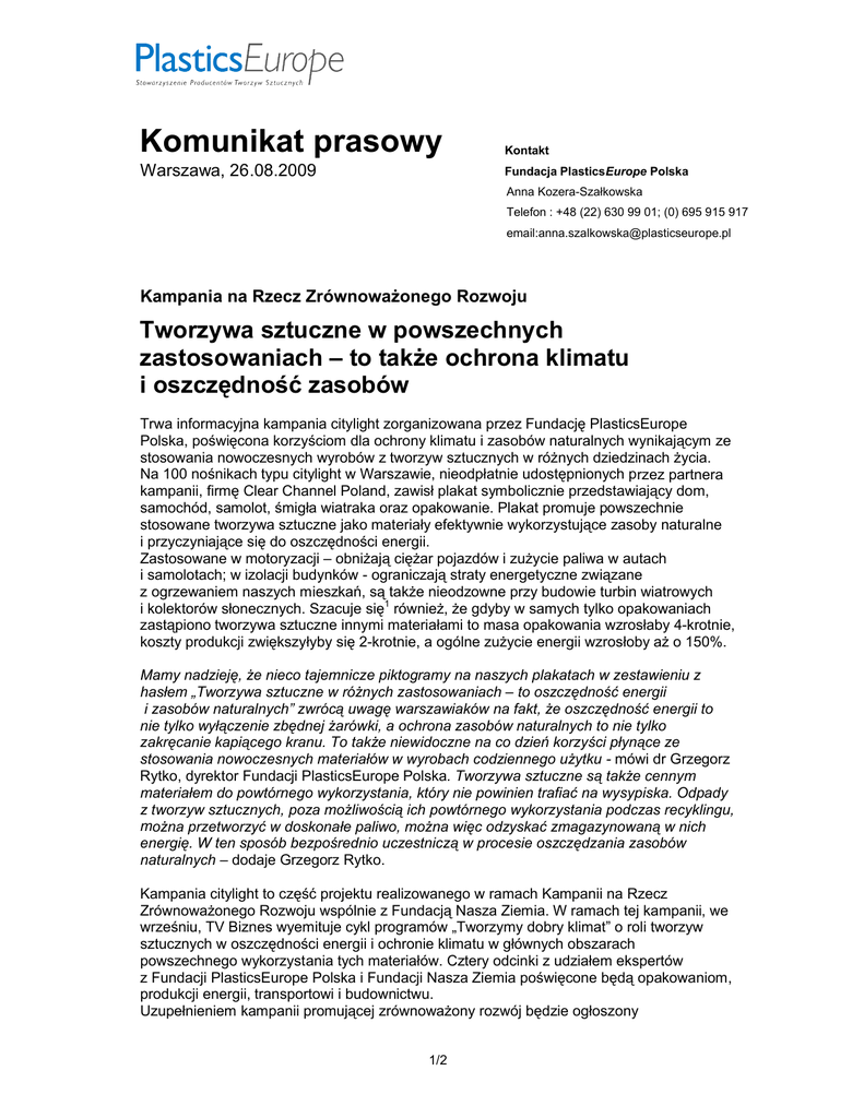 Komunikat prasowy Kontakt Warszawa, 26.08.2009 Fundacja PlasticsEurope Polska Anna Kozera-Szałkowska Telefon : +48 (22) 630 99 01; (0) 695 915 917 email:[email protected] Kampania na Rzecz Zrównoważonego Rozwoju Tworzywa sztuczne w powszechnych zastosowaniach – to także ochrona klimatu i oszczędność zasobów Trwa informacyjna kampania citylight zorganizowana przez Fundację PlasticsEurope Polska, poświęcona korzyściom dla ochrony klimatu i zasobów naturalnych wynikającym ze stosowania nowoczesnych wyrobów z tworzyw sztucznych w różnych dziedzinach życia. Na 100 nośnikach typu citylight w Warszawie, nieodpłatnie udostępnionych przez partnera kampanii, firmę Clear Channel Poland, zawisł plakat symbolicznie przedstawiający dom, samochód, samolot, śmigła wiatraka oraz opakowanie. Plakat promuje powszechnie stosowane tworzywa sztuczne jako materiały efektywnie wykorzystujące zasoby naturalne i przyczyniające się do oszczędności energii. Zastosowane w motoryzacji – obniżają ciężar pojazdów i zużycie paliwa w autach i samolotach; w izolacji budynków - ograniczają straty energetyczne związane z ogrzewaniem naszych mieszkań, są także nieodzowne przy budowie turbin wiatrowych i kolektorów słonecznych. Szacuje się1 również, że gdyby w samych tylko opakowaniach zastąpiono tworzywa sztuczne innymi materiałami to masa opakowania wzrosłaby 4-krotnie, koszty produkcji zwiększyłyby się 2-krotnie, a ogólne zużycie energii wzrosłoby aż o 150%. Mamy nadzieję, że nieco tajemnicze piktogramy na naszych plakatach w zestawieniu z hasłem „Tworzywa sztuczne w różnych zastosowaniach – to oszczędność energii i zasobów naturalnych” zwrócą uwagę warszawiaków na fakt, że oszczędność energii to nie tylko wyłączenie zbędnej żarówki, a ochrona zasobów naturalnych to nie tylko zakręcanie kapiącego kranu. To także niewidoczne na co dzień korzyści płynące ze stosowania nowoczesnych materiałów w wyrobach codziennego użytku - mówi dr Grzegorz Rytko, dyrektor Fundacji PlasticsEurope Polska. Tworzywa sztuczne są także cennym materiałem do powtórnego wykorzystania, który nie powinien trafiać na wysypiska. Odpady z tworzyw sztucznych, poza możliwością ich powtórnego wykorzystania podczas recyklingu, można przetworzyć w doskonałe paliwo, można więc odzyskać zmagazynowaną w nich energię. W ten sposób bezpośrednio uczestniczą w procesie oszczędzania zasobów naturalnych – dodaje Grzegorz Rytko. Kampania citylight to część projektu realizowanego w ramach Kampanii na Rzecz Zrównoważonego Rozwoju wspólnie z Fundacją Nasza Ziemia. W ramach tej kampanii, we wrześniu, TV Biznes wyemituje cykl programów „Tworzymy dobry klimat” o roli tworzyw sztucznych w oszczędności energii i ochronie klimatu w głównych obszarach powszechnego wykorzystania tych materiałów. Cztery odcinki z udziałem ekspertów z Fundacji PlasticsEurope Polska i Fundacji Nasza Ziemia poświęcone będą opakowaniom, produkcji energii, transportowi i budownictwu. Uzupełnieniem kampanii promującej zrównoważony rozwój będzie ogłoszony 1/2 w rozpoczynającym się roku szkolnym 2009/2010 konkurs grantowy dla szkół, w którym Fundacja PlasticsEurope Polska ufundowała 4 granty w wysokości 5 tys. zł. To już trzecia edycja konkursu, realizowanego wspólnie z Fundacją Nasza Ziemia. Tym razem jego hasłem będzie myśl przewodnia plakatu „Tworzywa sztuczne w różnych zastosowaniach to oszczędność energii i surowców naturalnych”. Zadaniem uczestników konkursu będzie zaprojektowanie akcji informacyjnej, która pokaże, w jaki sposób tworzywa wykorzystywane są w życiu codziennym oraz jakie przynosi to korzyści ekologiczne i ekonomiczne. Informacje dodatkowe Mniej emisji CO2 dzięki tworzywom sztucznym Użycie tworzyw sztucznych w celu podniesienia komfortu i bezpieczeństwa jazdy w samochodach nie dziwi nikogo. Mało kto jednak wie, że aż 40% z tych tworzyw wykorzystuje się w celu zmniejszenia masy samochodu, dzięki czemu można znacznie obniżyć zużycie paliwa oraz emisję CO2. Mniejsza masa nowoczesnego samochodu, uzyskana dzięki zastosowaniu elementów z tworzyw sztucznych, przekłada się na oszczędność ponad 500 l paliwa w okresie użytkowania samochodu. Podobnie jest w lotnictwie. W nowoczesnych samolotach zaawansowane technologicznie kompozyty z tworzyw sztucznych zmniejszają masę samolotu, a tym samym zużycie paliwa. Ponieważ ok. 40% zużycia energii pierwotnej na całym świecie przypada na budynki, optymalna izolacja stała się jednym z najważniejszych zadań, które umożliwią realizację celów konwencji z Kioto. Ogromną rolę odgrywają zatem materiały izolacyjne wykonane z tworzyw sztucznych, które mogą zarówno utrzymywać ciepło w budynkach, jak i nie dopuszczać do nagrzewania się budynków. Nowoczesne tworzywa sztuczne umożliwiają także projektantom i konstruktorom optymalne wykorzystanie alternatywnych źródeł energii. Przykładem tego mogą być wirniki turbin wiatrowych lub panele fotowoltaiczne w kolektorach słonecznych, które dzięki plastikowym elementom mogą pracować dłużej i bardziej wydajnie. Poprzez recykling i odzysk odpadów z tworzyw sztucznych można odzyskać materiał (np. z 30 zużytych butelek typu PET można wytworzyć bluzę polarową) lub zmagazynowaną w nich energię. Przyczynia się to do oszczędzania zasobów naturalnych. Zasada 4R Reduce - Ograniczanie Reuse – Używanie wielokrotne Recycle - Recykling Recovery – Odzysk Równorzędne i elastyczne stosowanie tej zasady – w miarę możliwości także w codziennym postępowaniu z odpadami z tworzyw sztucznych – to podejście uzasadnione zarówno z ekologicznego, jak i ekonomicznego punktu widzenia. 1 Badania Stowarzyszenia ds. Badań Rynkowych Opakowań (GVM), Wiesbaden PlasticsEurope Polska, fundacja reprezentująca producentów tworzyw sztucznych w Polsce, jest częścią europejsk