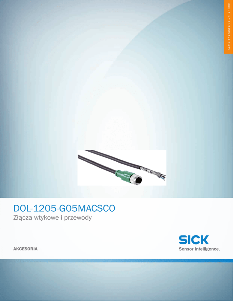 Karta charakterystyki online DOL-1205-G05MACSCO Złącza wtykowe i przewody AKCESORIA DOL-1205-G05MACSCO | Złącza wtykowe i przewody AKCESORIA A B C D E F H I J K L M N O P Q R S T Informacje do zamówienia Typ Nr artykułu DOL-1205-G05MACSCO więcej wersji urządzeń i akcesoriów 6049453 www.sick.com/Złącza_wtykowe_i_przewody Szczegółowe dane techniczne Dane techniczne Grupa akcesoriów Złącza wtykowe i przewody Rodzina akcesoriów Przewody podłączeniowe z gniazdem Typ przyłącza – głowica A Gniazdo, M12, 5 pinów, prosty, kodowanie A Typ przyłącza – głowica B Przewód Blokada złącza wtykowego M12-Speedcon Materiał, złącze wtykowe TPU Materiał, nakrętka radełkowa Cynkowy odlew ciśnieniowy, niklowany Przewód 5 m, 5 żył Materiał, płaszcz PUR, bezhalogenowy Kolor, płaszcz Czarny Średnica przewodu Ø 5,9 mm Przekrój poprzeczny przewodu 0,34 mm², 5 x 0,34 mm² Ekranowanie Ekranowany Promień gięcia > 10 x średnica przewodu w stanie ruchomym, > 5 x średnica przewodu przy ułożeniu nieruchomym Napięcie znamionowe ≤ 60 V Obciążalność prądowa 4 A Typ sygnału Analogowy Wykonanie specjalne Nadaje się do zastosowania w prowadnikach kabli Temperatura robocza –25 °C ... +80 °C Stopień ochrony (M12) IP 65/IP 67/IP 69K Opis Gniazdo M12 Speedcon, z kodowaniem A, proste – wolny koniec Klasyfikacje ECl@ss 5.0 19030312 ECl@ss 5.1.4 19030312 ECl@ss 6.0 27060304 ECl@ss 6.2 27060304 ECl@ss 7.0 27060304 ECl@ss 8.0 27060304 ECl@ss 8.1 27060304 ECl@ss 9.0 27060304 ETIM 5.0 EC000830 ETIM 6.0 EC000830 2 AKCESORIA | SICK Karta charakterystyki online | 2017-03-04 11:51:08 Informacje mogą ulec zmianie bez powiadomienia DOL-1205-G05MACSCO | Złącza wtykowe i przewody AKCESORIA UNSPSC 16.0901 26121604 Rysunek wymiarowy (Wymiary w mm) 44.5 (1.75) 4 5 (0.58) M12 Ø 14.8 (0.47) Ø 12 3 2 1 female connector M12 x1, straight, screened ① Brązowy ② Biały ③ Niebieski ④ Czarny ⑤ Szary 2017-03-04 11:51:08 | Karta charakterystyki online Informacje mogą ulec zmianie bez powiadomienia AKCESORIA | SICK 3 Karta charakterystyki online SICK W SKRÓCIE Firma SICK należy do czołowych producentów inteligentnych czujników i rozwiązań wykorzystujących czujniki do zastosowań przemysłowych. Wyjątkowa gama produktów i usług stwarza idealną podstawę dla bezpiecznego i wydajnego sterowania procesami, ochrony ludzi przed wypadkami i unikania zanieczyszczenia środowiska. Mamy szerokie doświadczenie w różnych branżach i znamy występujące w nich procesy oraz wymagania. Nasze inteligentne czujniki zapewniają klientom dokładnie to, czego im potrzeba. W centrach aplikacji w Europie, Azji i Ameryce Północnej rozwiązania systemowe są testowane i optymalizowane pod kątem potrzeb konkretnych klientów. Wszystko to sprawia, że jesteśmy niezawodnym dostawcą i partnerem w zakresie rozwoju. Naszą ofertę dopełniają kompleksowe usługi: rozwiązania SICK LifeTime Services wspierają klientów w trakcie całego cyklu użytkowania maszyny i dbają o bezpieczeństwo i produktywność. Właśnie tak rozumiemy hasło „Sensor Intelligence”. BLISKO KLIENTA NA CAŁYM ŚWIECIE: Osoby kontaktowe i pozostałe lokalizacje - www.sick.com SICK AG |Waldkirch|Niemcy |www.sick.com