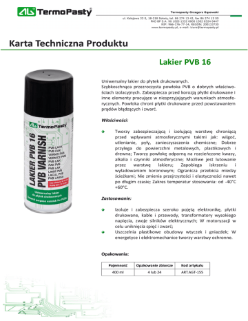 Karta Techniczna Produktu Lakier PVB 16 Uniwersalny lakier do płytek drukowanych. Szybkoschnąca przezroczysta powłoka PVB o dobrych właściwościach izolacyjnych. Zabezpiecza przed korozją płytki drukowane i inne elementy pracujące w niesprzyjających warunkach atmosferycznych. Powłoka chroni płytki drukowane przed powstawaniem prądów błądzących i zwarć. Właściwości: Tworzy zabezpieczającą i izolującą warstwę chroniącą przed wpływami atmosferycznymi takimi jak: wilgoć, utlenianie, pyły, zanieczyszczenia chemiczne; Dobrze przylega do powierzchni metalowych, plastikowych i drewna; Tworzy powłokę odporną na rozcieńczone kwasy, alkalia i czynniki atmosferyczne; Możliwe jest lutowanie przez warstwę lakieru; Zapobiega iskrzeniu i wyładowaniom koronowym; Ogranicza przebicia miedzy ścieżkami; Nie zmienia przejrzystości i elastyczności nawet po długim czasie; Zakres temperatur stosowania: od -40°C +60°C. Zastosowanie: Izoluje i zabezpiecza szeroko pojętą elektronikę, płytki drukowane, kable i przewody, transformatory wysokiego napięcia, zwoje silników elektrycznych; W motoryzacji w celu uniknięcia spięć i zwarć; Uszczelnia plastikowe obudowy wtyczek i gniazdek; W energetyce i elektromechanice tworzy warstwy ochronne. Opakowania: Pojemność Opakowanie zbiorcze Kod artykułu 400 ml 4 lub 24 ART.AGT-155