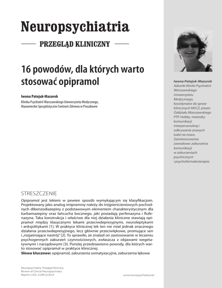 16 powodów, dla których warto stosować opipramol Iwona Patejuk-Mazurek Klinika Psychiatrii Warszawskiego Uniwersytetu Medycznego, Mazowieckie Specjalistyczne Centrum Zdrowia w Pruszkowie Iwona Patejuk-Mazurek Adiunkt Kliniki Psychiatrii Warszawskiego Uniwersytetu Medycznego, koordynator do spraw klinicznych MSCZ, prezes Oddziału Warszawskiego PTP. Hobby: meandry komunikacji interpersonalnej i odkrywanie znanych ludzi na nowo. Zainteresowania zawodowe: zaburzenia komunikacji w zaburzeniach psychicznych i psychofarmakoterapia. STRESZCZENIE Opipramol jest lekiem w pewien sposób wymykającym się klasyfikacjom. Projektowany jako analog imipraminy należy do trójpierścieniowych pochodnych dibenzodiazepiny z podstawowym elementem charakterystycznym dla karbamazepiny oraz łańcucha bocznego, jaki posiadają perfenazyna i flufenazyna. Taka konstrukcja i właściwe dla niej działania kliniczne stawiają opipramol między klasycznymi lekami przeciwdepresyjnymi, neuroleptykami i anksjolitykami [1]. W praktyce klinicznej lek ten nie miał jednak znacznego działania przeciwdepresyjnego, lecz głównie przeciwlękowe, promujące sen i „rozjaśniające nastrój” [2]. To sprawiło, że znalazł on zastosowanie w leczeniu psychogennych zaburzeń czynnościowych, zwłaszcza z objawami wegetatywnymi i narządowymi [3]. Poniżej przedstawiono powody, dla których warto stosować opipramol w praktyce klinicznej. Słowa kluczowe: opipramol, zaburzenia somatyzacyjne, zaburzenia lękowe Neuropsychiatria. Przegląd Kliniczny Review of Clinical Neuropsychiatry Reprint z VOL. 6 (NR 2)/2014 www.neuropsychiatria.net 16 powodów, dla których warto stosować opipramol I. Patejuk-Mazurek Abstract Opipramol is drug beyond classification. It was originally designed as analog of imipramine. Opipramol is tricyclic dibenzodiazepine derivative with side chain characteristic for perphenazine and fluphenazine. This construction places opipramol between antidepressants, neuroleptics and anxiolytics. In clinical practise it is mainly used for anxiety treatment, sleep disorders and as „mood brightener”. All that properties led opipramol to be used in psychogenic disorders, especially in somatoform disorders. Reasons for prescribing opipramol in clinical practise are listed below. Key words: opipramol, somatoform disorders, anxiety disorders Najważniejsze Opipramol jest skutecznym lekiem w zaburzeniach lękowych (zespół lęku uogólnionego) i somatyzacyjnych. Highlights Opipramol is effective treatment in anxiety (generalized anxiety disorder) and somatoform disorders. Powód 1. Ponad 50 lat obecności opipramolu na rynku spowodowało, że lekarze mają szerokie doświadczenie w stosowaniu go, poparte badaniami klinicznymi. Jest wiele molekuł, które w tym czasie zostały zapomniane lub wyparte z rynku, jednak opipramol nadal jest wykorzystywany i ma swoją terapeutyczną niszę. Powód 2. Opipramol jest trójcykliczną pochodną dibenzodiazepiny, był syntetyzowany jako analog imipraminy. Podobieństwo budowy chemicznej do tego antydepresantu nie zapewniło jednak cząsteczce oczekiwanej siły działania przeciwdepresyjnego (mniejsze niż w przypadku imipraminy powinowactwo do receptorów serotoninowych 5-HT2A, dopaminowych D2 i adrenergicznych α1, brak wychwytu zwrotnego serotoniny i noradrenaliny). Badania kliniczne i praktyka wykazały zaś widoczne efekty uspokajające, przeciwlękowe, promujące sen i „rozjaśniające nastrój” [2]. Powód 3. Opipramol wykazuje silny wpływ na receptory σ, modulując układ NMDA. Przewlekłe stosowanie leku prowadzi do zjawiska „regulacji w dół” receptorów σ2, co według badaczy odpowiada za efekt przeciwlękowy [3, 4]. Powód 4. Pomimo że opipramol wpływa na receptory histaminowe H1, klinicznie nie powoduje on działań z nimi związanych, czyli m.in. przyrostu masy ciała w trakcie leczenia, co jest szczególnie ważne dla kobiet w okresie okołomenopauzalnym, u których często występują objawy pobudzenia układu autonomicznego, zaburzenia nastroju i snu, ale też spowolnienie podstawowej przemiany materii i tycie [5]. Powód 5. Zaburzenia lękowe, szczególnie lęk uogólniony, i zaburzenia somatyzacyjne są jednymi z najtrudniejszych diagnostycznie i terapeutycznie. Pacjenci, zanim trafią pod specjalistyczną opiekę psychiatryczną, odbywają długą drogę kolejnych wizyt u lekarzy innych specjalizacji. Lekarze ci najczęściej nie znajdują somatycznego podłoża zgłaszanych przez chorych dolegliwości. Często sami pacjenci, obawiając się społecznego odrzucenia i stygmatyzacji, nie zgadzają się na wizytę u psychiatry, a tym samym oddalają termin uzyskania pomocy. Pozo- Neuropsychiatria. Przegląd Kliniczny Review of Clinical Neuropsychiatry Reprint z VOL. 6 (NR 2)/2014 16 powodów, dla których warto stosować opipramol I. Patejuk-Mazurek stają więc nierzadko pod opieką lekarzy pierwszego kontaktu. Badania kliniczne i praktyka potwierdzają skuteczność opipramolu w lęku uogólnionym i zaburzeniach somatyzacyjnych, więc leczenie może się odbywać również w placówkach POZ [4, 1]. Powód 6. Objawy depresyjne i lękowe, m.in. jako psychologiczna reakcja na zmiany, są obecne w przebiegu chorób somatycznych, szczególnie przewlekłych i przebiegających z bólem (cukrzyca, choroba niedokrwienna serca, RZS). Wybór opipramolu staje się więc dobrym wyborem leczenia objawów współwystępujących. Powód 7. Objawy lękowe nie są obecne w kryteriach rozpoznawania epizodu depresji (ICD-10, DSM-V), ale są zauważane, odczuwane i zgłaszane przez pacjentów. Często też w trakcie leczenia najpierw mijają objawy depresyjne, a uwidaczniają się lękowe. Powoduje to zwykle konieczność modyfikacji leczenia. Zastosowanie opipramolu w takich sytuacjach jest uzasadnione i skuteczne klinicznie. Powód 8. Leczenie objawów lękowych za pomocą benzodiazepin niesie ryzyko rozwoju uzależnienia. Praktyka kliniczna wskazuje, że w dł
