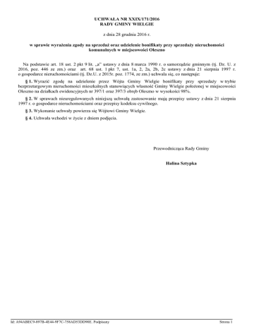 UCHWAŁA NR XXIX/171/2016 RADY GMINY WIELGIE z dnia 28 grudnia 2016 r. w sprawie wyrażenia zgody na sprzedaż oraz udzielenie bonifikaty przy sprzedaży nieruchomości komunalnych w miejscowości Oleszno Na podstawie art. 18 ust. 2 pkt 9 lit. „a” ustawy z dnia 8 marca 1990 r. o samorządzie gminnym (tj. Dz. U. z 2016, poz. 446 ze zm.) oraz art. 68 ust. 1 pkt 7, ust. 1a, 2, 2a, 2b, 2c ustawy z dnia 21 sierpnia 1997 r. o gospodarce nieruchomościami (tj. Dz.U. z 2015r. poz. 1774, ze zm.) uchwala się, co następuje: § 1. Wyrazić zgodę na udzielenie przez Wójta Gminy Wielgie bonifikaty przy sprzedaży w trybie bezprzetargowym nieruchomości mieszkalnych stanowiących własność Gminy Wielgie położonej w miejscowości Oleszno na działkach ewidencyjnych nr 397/1 oraz 397/3 obręb Oleszno w wysokości 98%. § 2. W sprawach nieuregulowanych niniejszą uchwałą zastosowanie mają przepisy ustawy z dnia 21 sierpnia 1997 r. o gospodarce nieruchomościami oraz przepisy kodeksu cywilnego. § 3. Wykonanie uchwały powierza się Wójtowi Gminy Wielgie. § 4. Uchwała wchodzi w życie z dniem podjęcia. Przewodnicząca Rady Gminy Halina Sztypka Id: A94ABEC9-897B-4E44-9F7C-758AD53DD90E. Podpisany Strona 1 UZASADNIENIE Przedmiotem uchwały jest wyrażenie zgody oraz określenie warunków udzielenia bonifikaty na sprzedaż nieruchomości zabudowanych budynkami mieszkalnymi położonymi w Olesznie na działkach ewidencyjnych: 397/1 o powierzchni 0,2569 ha oraz 397/3 o powierzchni 0,24 ha. Sprzedaż działki odbędzie się w trybie bezprzetargowym na rzecz ich dotychczasowych najemców. Zgodnie z wyceną dokonaną przez rzeczoznawcę majątkowego wartość rynkowa przedmiotowych nieruchomości przedstawia się następująco: Budynek mieszkalny położony na działce ewidencyjnej 397/3: 1. Lokal mieszkalny nr 1 o powierzchni użytkowej 34,23 m²: - wartość rynkowa lokalu mieszkalnego 4.400,00 zł. - wartość rynkowa gruntu wchodzącego w skład udziału w nieruchomości 5.100,00 zł. 2. Lokal mieszkalny nr 2 o powierzchni użytkowej 27,14 m²: - wartość rynkowa lokalu mieszkalnego 3.500,00 zł. - wartość rynkowa gruntu wchodzącego w skład udziału w nieruchomości 4.000,00 zł. 3. Lokal mieszkalny nr 3 o powierzchni użytkowej 31,89 m²: - wartość rynkowa lokalu mieszkalnego 4.100,00 zł. - wartość rynkowa gruntu wchodzącego w skład udziału w nieruchomości 4.700,00 zł. 4. Lokal mieszkalny nr 4 o powierzchni użytkowej 33,11 m²: - wartość rynkowa lokalu mieszkalnego 4.300,00 zł. - wartość rynkowa gruntu wchodzącego w skład udziału w nieruchomości 4.900,00 zł. Budynek mieszkalny położony na działce ewidencyjnej 397/1: 1. Lokal mieszkalny nr 1 o powierzchni użytkowej 49,99 m²: - wartość rynkowa lokalu mieszkalnego 10.000,00 zł. - wartość rynkowa gruntu wchodzącego w skład udziału w nieruchomości 3.800,00 zł. 2. Lokal mieszkalny nr 2 o powierzchni użytkowej 15,30 m²: - wartość rynkowa lokalu mieszkalnego 2.500,00 zł. - wartość rynkowa gruntu wchodzącego w skład udziału w nieruchomości 1.200,00 zł. 3. Lokal mieszkalny nr 3 o powierzchni użytkowej 14,94 m²: - wartość rynkowa lokalu mieszkalnego 1.900,00 zł. - wartość rynkowa gruntu wchodzącego w skład udziału w nieruchomości 2.800,00 zł. 4. Lokal mieszkalny nr 4 o powierzchni użytkowej 15,61 m²: - wartość rynkowa lokalu mieszkalnego 2.500,00 zł. - wartość rynkowa gruntu wchodzącego w skład udziału w nieruchomości 1.200,00 zł. 5. Lokal mieszkalny nr 5 o powierzchni użytkowej 43,45 m²: - wartość rynkowa lokalu mieszkalnego 7.100,00 zł. - wartość rynkowa gruntu wchodzącego w skład udziału w nieruchomości 8.100,00 zł. 6. Lokal mieszkalny nr 6 o powierzchni użytkowej 40,08 m²: - wartość rynkowa lokalu mieszkalnego 8.000,00 zł. - wartość rynkowa gruntu wchodzącego w skład udziału w nieruchomości 3.100,00 zł. Przewodniczący Rady Gminy HALINA SZTYPKA Id: A94ABEC9-897B-4E44-9F7C-758AD53DD90E. Podpisany Strona 1 Id: A94ABEC9-897B-4E44-9F7C-758AD53DD90E. Podpisany Strona 2