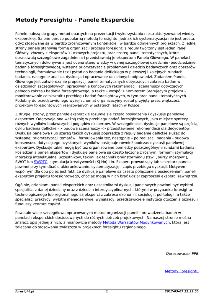 Metody Foresightu - Panele Eksperckie Panele należą do grupy metod opartych na prezentacji i wykorzystaniu niestrukturyzowanej wiedzy eksperckiej. Są one bardzo popularną metodą foresightu, jednak ich systematyzacja nie jest prosta, gdyż stosowane są w bardzo zróżnicowanym kontekście i w bardzo odmiennych projektach. Z jednej strony panele stanowią formę organizacji procesu foresight: z reguły tworzony jest jeden Panel Główny, złożony z ekspertów kluczowych projektu, oraz szereg paneli tematycznych, które opracowują szczegółowe zagadnienia i przedstawiają je ekspertom Panelu Głównego. W panelach tematycznych dokonywana jest ocena stanu wiedzy w danej szczegółowej dziedzinie (poddziedzinie badania foresightowego), wstępna priorytetyzacja problemów i dziedzin badawczych oraz obszarów technologii, formułowanie tez i pytań do badania delfickiego w pierwszej i kolejnych rundach badania, następnie analiza, dyskusja i opracowanie udzielonych odpowiedzi. Zadaniem Panelu Głównego jest zatwierdzanie propozycji paneli tematycznych dotyczących zakresu badań w dziedzinach szczegółowych, opracowanie końcowych rekomendacji, scenariuszy dotyczących pełnego zakresu badania foresightowego, a także – wespół z Komitetem Sterującym projektu – monitorowanie całokształtu przebiegu badań foresightowych, w tym prac paneli tematycznych. Podobny do przedstawionego wyżej schemat organizacyjny został przyjęty przez większość projektów foresightowych realizowanych w ostatnich latach w Polsce. Z drugiej strony, przez panele eksperckie rozumie się często posiedzenia i dyskusje panelowe ekspertów. Odgrywają one ważną rolę w przebiegu badań foresightowych, jako miejsce syntezy różnych wyników badawczych i poglądów ekspertów. W szczególności, dyskusje panelowe są częścią cyklu badania delfickie –> budowa scenariuszy –> przedstawienie rekomendacji dla decydentów. Dyskusja panelowa (lub szereg takich dyskusji) poprzedza z reguły badanie delfickie służąc do wstępnej priorytetyzacji tematów i formułowania tez, następnie – po realizacji badania - budowa konsensusu dotyczącego uzyskanych wyników następuje również podczas dyskusji panelowej ekspertów. Dyskusje takie mogą być tez organizowane pomiędzy poszczególnymi rundami badania. Posiedzenia paneli ekspertów i dyskusje panelowe są często łączone z różnymi formami stymulacji interakcji intelektualnej uczestników, takimi jak techniki brainstormingu (tzw. „burzy mózgów”), SWOT lub SWOTC, stymulacja kreatywności (KJ Ho) i in. Ekspert prowadzący lub sekretarz panelu powinni przy tym dbać o ukierunkowanie, systematyzację i zapis przebiegu dyskusji. Motywem wspólnym dla obu pojęć jest fakt, że dyskusje panelowe są często połączone z posiedzeniami paneli ekspertów projektu foresightowego, chociaż mogą w nich brać udział zaproszeni eksperci zewnętrzni. Ogólnie, członkami paneli eksperckich oraz uczestnikami dyskusji panelowych powinni być wybitni specjaliści z danej dziedziny oraz z dziedzin interdyscyplinarnych, którymi w przypadku foresightu technologicznego lub regionalnego są eksperci z zakresu ekonomii, socjologii, politologii, a także specjaliści praktycy: wybitni menedżerowie, wynalazcy, przedstawiciele instytucji otoczenia biznesu i funduszy venture capital. Powstało wiele szczegółowo opracowanych metod organizacji paneli i prowadzenia badań w panelach eksperckich dostosowanych do różnych potrzeb projektowych. Na naszej stronie można znaleźć opis jednej z nich, a mianowicie metody Metoda Warsztatów Modyfikowanych, która jest zalecana do stosowania zwłaszcza w projektach foresightu regionalnego. Opracowanie: FPB Metody Foresightu foresight.pl 1 2017-03-07 12:33:50