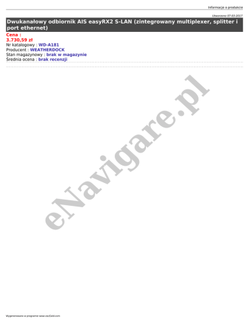 Informacje o produkcie Utworzono 07-03-2017 Dwukanałowy odbiornik AIS easyRX2 S-LAN (zintegrowany multiplexer, splitter i port ethernet) Cena : 3.730,59 zł eN av ig ar e. pl Nr katalogowy : WD-A181 Producent : WEATHERDOCK Stan magazynowy : brak w magazynie Średnia ocena : brak recenzji Wygenerowano w programie www.oscGold.com