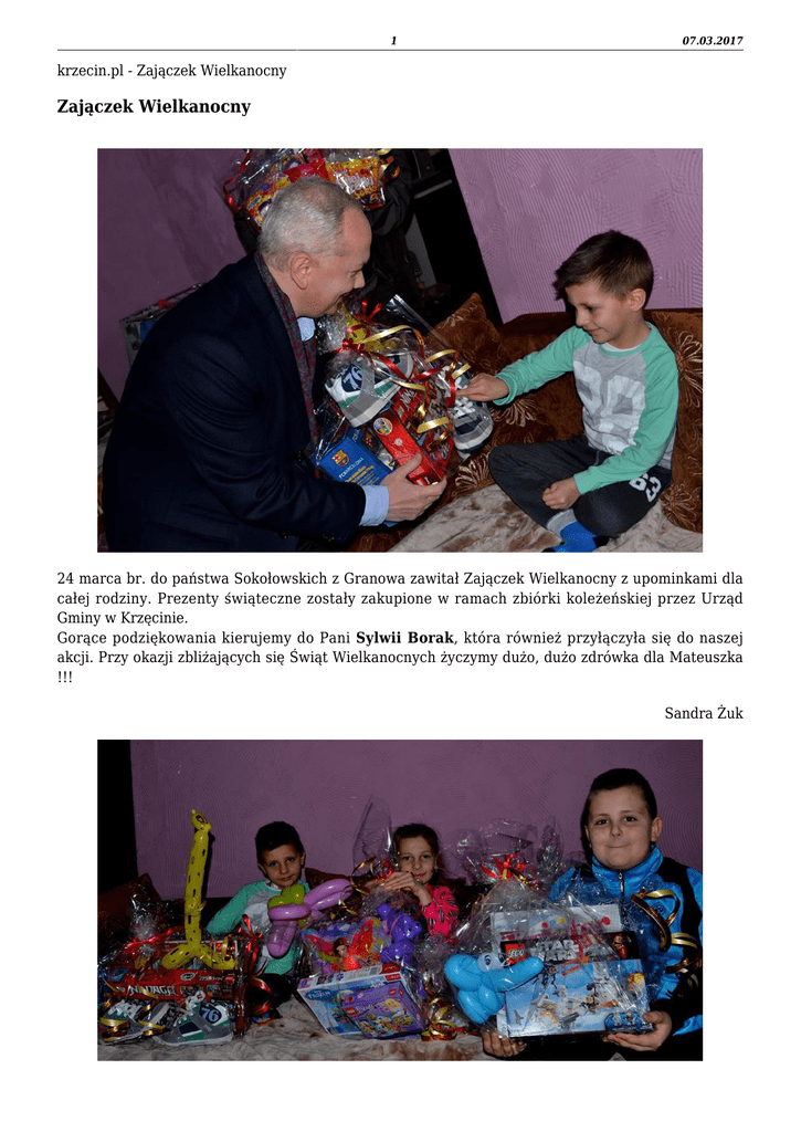 1 07.03.2017 krzecin.pl - Zajączek Wielkanocny Zajączek Wielkanocny 24 marca br. do państwa Sokołowskich z Granowa zawitał Zajączek Wielkanocny z upominkami dla całej rodziny. Prezenty świąteczne zostały zakupione w ramach zbiórki koleżeńskiej przez Urząd Gminy w Krzęcinie. Gorące podziękowania kierujemy do Pani Sylwii Borak, która również przyłączyła się do naszej akcji. Przy okazji zbliżających się Świąt Wielkanocnych życzymy dużo, dużo zdrówka dla Mateuszka !!! Sandra Żuk 2 07.03.2017