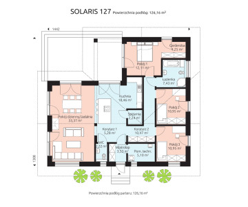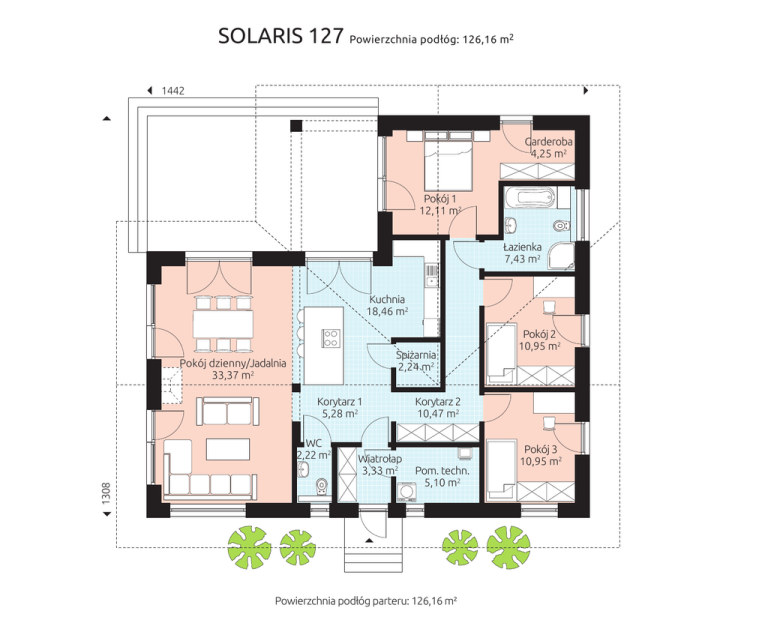 SOLARIS 127 Powierzchnia podłóg: 126,16 m 2 1442 Garderoba 4,25 m2 Pokój 1 12,11 m2 Łazienka 7,43 m2 Kuchnia 18,46 m2 Spiżarnia 2,24 m2 Pokój dzienny/Jadalnia 33,37 m2 Korytarz 1 5,28 m2 1308 WC 2,22 m2 Wiatrołap 3,33 m2 Pokój 2 10,95 m2 Korytarz 2 10,47 m2 Pom. techn. 5,10 m2 Powierzchnia podłóg parteru: 126,16 m² Pokój 3 10,95 m2