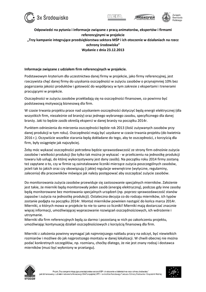 Odpowiedzi na pytania i informacje związane z pracą animatorów, ekspertów i firmami referencyjnymi w projekcie „Trzy Trzy kampanie integrujące przedsiębiorstwa sektora MŚP i ich otoczenie w działaniach działani na rzecz ochrony środowiska” Wydanie z dnia 23.12.2013 Informacje związane z udziałem firm referencyjnych w projekcie. Podstawowym kryterium dla uczestnictwa danej firmy w projekcie, jako firmy referencyjnej, referencyjnej jest rzeczywista chęć danej firmy do uzyskania oszczędności w zużyciu zasobów o przynajmniej 10% bez pogarszania jakości produktów i gotowość do współpracy w tym zakresie z ekspertami i trenerami pracującymi w projekcie. Oszczędności w zużyciu zasobów przekładają się na oszczędności finansowe, finansowe, co powinno być podstawową motywacją biznesową dla firm. W czasie trwania projektu prace nad uzyskaniem oszczędności dotyczyć będą energii elektrycznej (dla wszystkich firm, niezależnie od branży) oraz jednego wybranego zasobu, specyficznego dla danej branży. Jaki to będzie zasób określą eksperci w danej branży na początku 2014r. 2014r Punktem odniesienia do mierzenia oszczędności będzie rok 2013 (ilość zużywanych zasobów przy danej produkcji w tym roku). Oszczędności mają być uzyskane uzyskane w czasie trwania projektu proje (do kwietnia 2016 r.). Oczywiście wszelkie starania będą dokładane do tego, aby te oszczędności, z korzyścią dla firm, były osiągnięte jak najszybciej. Żeby móc wykazać oszczędności potrzebna będzie sprawozdawczość ze strony firm odnośnie zużycia zasobów ów i wielkości produkcji (bo tylko tak można je wykazać - w przeliczeniu na jednostkę produkcji towaru lub usługi, do której wykorzystywany jest dany zasób). Na początku roku 2014 firmy zostaną też zapytane o to, czy w firmie są zainstalowane liczniki mierzące mierzące zużycia poszczególnych zasobów, jeżeli tak to jakich oraz czy zy obowiązują (i jakie) regulacje wewnętrzne (wytyczne, regulaminy, zalecenia) dla pracowników mówiące jak należy postępować aby oszczędzać zużycie zasobów. zasobów Do monitorowania zużycia zasobów przewiduje przewiduje się zastosowanie specjalnych mierników. mierników Założenie jest takie, że mierniki będą monitorowały jeden zasób (energię elektryczną), podczas gdy inne zasoby będą monitorowane bez montowania specjalnych urządzeń (np. poprzez sprawozdawczość stanów zapasów ów i zużycia na jednostkę produkcji). Ostateczna decyzja co do rodzaju mierników, ich typów zostanie podjęta na początku 2014r. Montaż mierników powinien nastąpić do końca marca 2014r. Mierniki, o których mowa w projekcie to nie to samo co liczniki! Mierniki Mierniki mają dostarczać znacznie więcej informacji, umożliwiającej wypracowanie rozwiązań oszczędnościowych, ich wdrożenie i utrzymanie. Mierniki dla firm referencyjnych będą za darmo i pozostaną w nich po zakończeniu projektu, umożliwiając kontynuację działań oszczędnościowych z korzyścią finansową dla firm. Mierniki z założenia powinny wymagać jak najmniejszego nakładu pracy na odczyt, być niewielkich rozmiarów i możliwe do jak najprostszego montażu w danej lokalizacji. W chwili obecnej nie można podać konkretnych tnych szczegółów, np. rozmiaru, choćby dlatego, że nie jest znany rodzaj i dostawca mierników (musi być wyłoniony w przetargu). Z uczestnictwa w projekcie firma referencyjna będzie miała następujące korzyści: • • • • możliwość wypracowania przynajmniej 10% oszczędności w zużyciu zasobów, bez pogarszania jakości produktów, dzięki bezpłatnej współpracy z ekspertami w projekcie i innym formom pomocy (warsztaty, pakiet edukacyjny), bezpłatne otrzymanie miernika pozwalającego monitorować zużycie określonego zasobu, dającego informacje pozwalające na wypracowywanie rozwiązań oszczędnościowych i kontrolę ich skuteczności, gwarantowany udział przynajmniej jednego przedstawiciela firmy w bezpłatnych warsztatach uczących ch jak generować rozwiązania oszczędzające zasoby, gwarantowane otrzymanie bezpłatnie elementów pakietu edukacji ekologicznej, ekologicznej umożliwiającego samokształcenie w zakresie wprowadzania rozwiązań oszczędzających zasoby. Z każdą z firm referencyjnych zostanie podpisana umowa na czas trwania projektu (do 30 kwietnia 2016 roku) u) regulująca zasady współpracy, użytkowania mierników, sprawozdawczości i określająca tryb postępowania w przypadku ewentualnej rezygnacji firmy z udziału w projekcie. Pytania i odpowiedzi 1) Czy jeśli zainstalowane urządzenie (miernik) będzie posiadało opcję automatycznego przesyłania danych do centralnego systemu monitorującego, monitorującego to będzie przesyłało takie dane także po zakończeniu projektu (otrzymaliśmy informację, że urządzenie pozostaje pozostaje w firmie referencyjnej również po projekcie)? NIE, jeśli taka opcja będzie wykorzystywana w projekcie, to po jego zakończeniu dane nie będą wychodzić poza firmę, chyba, że firma byłaby tym zainteresowana i zawarto by w tym względzie odrębną umowę/porozumienie ozumienie (Co może mieć np. miejsce, jeśli w ramach działań po projekcie powstałby usługowy system monitorujący zużycie zasobów, wysyłający ostrzeżenia w przypadku niekorzystnych sytuacji, dający wskazówki w celu lepszego ich wykorzystania itp.) 2) Kiedy ewentualnie firma może zrezygnować z takiego urządzenia? Jeśli w firmie zainstalowano urządzenie to musi ono działać do końca projektu. Należy pamiętać, że urządzenia są pomyślane jako pomoc firmie w uzyskiwaniu oszczędności, a nie obciążenie. 3) Jak często zęsto firma będzie musiała/mogła kontaktować się z grupą ekspertów? To będzie ustalane indywidualnie z firmami. Nie znając sytuacji wyjściowej w firmie nie można z góry określić co będzie potrzebne dla uzyskania oszczędności (Teo