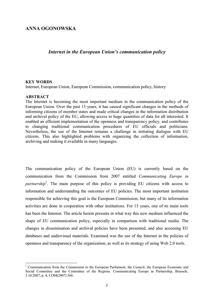 ANNA OGONOWSKA Internet in the European Union’s communication policy KEY WORDS Internet, European Union, European Commission, communication policy, history ABSTRACT The Internet is becoming the most important medium in the communication policy of the European Union. Over the past 15 years, it has caused significant changes in the methods of informing citizens of member states and made critical changes in the information distribution and archival policy of the EU, allowing access to huge quantities of data for all interested. It enabled an efficient implementation of the openness and transparency policy, and contributes to changing traditional communication procedures of EU officials and politicians. Nevertheless, the use of the Internet remains a challenge in initiating dialogue with EU citizens. This also highlighted problems with organizing the collection of information, archiving and making it available in many languages. The communication policy of the European Union (EU) is currently based on the communication from the Commission from 2007 entitled Communicating Europe in partnership1. The main purpose of this policy is providing EU citizens with access to information and understanding the outcomes of EU policies. The most important institution responsible for achieving this goal is the European Commission, but many of its information activities are done in cooperation with other institutions. For 15 years, one of its main tools has been the Internet. The article herein presents in what way this new medium influenced the shape of EU communication policy, especially in comparison with traditional media. The changes in dissemination and archival policies have been presented, and also accessing EU databases and audiovisual materials. Examined was the use of the Internet in the policies of openness and transparency of the organization, as well as its strategy of using Web 2.0 tools. 1 Communication from the Commission to the European Parliament, the Council, the European Economic and Social Committee and the Committee of the Regions. Communicating Europe in Partnership, Brussels, 3.10.2007, p. 4, COM(2007) 568. 1 Internet and traditional media in the European Union The Internet plays a very important part in EU communication policy, as in the last few years it has developed into a serious rival of television, radio and the printed press. It is a phenomenon not only in the communication policy of the EU, but also in the media system of the entire world. However, its position cannot be considered without the existence of traditional media. In the case of the EU, changes caused by the spread of this global network are all the more important, as their contact with “old” mass media has hardly been a success. For many decades now, the European Union has experienced a deficit of presence in the national media of member states, which are the most popular with viewers, listeners and readers. From the beginning of the 1980s the Eurobarometer, surveying public opinion in European Union member states, has researched the use of media in obtaining information on the Communities and the European Union. For many years, survey results showed that in every country, the main sources of information on the EU have been television, daily press and radio2. In 1998, the Internet appeared on the list and in the following years, moved up to take fourth place in 2006, and came in third in 2007, before the radio, but still after television and daily press3. The latest Eurobarometer research from 20114 confirms third place for the Internet among the most popular medium in the EU. 45 per cent of those surveyed claimed that they use the Internet daily or almost every day, 18 per cent – a few times a week, and another 6 per cent – a few times a month. However, 23 per cent of respondents claimed they never used the medium, and 8 per cent, said they did not have access to the Internet. The same research proves that less and less young people (aged 15–24) watch television, but instead more commonly than in other age groups, they use the Internet5. Television is still the main source of information on the EU6. It is also the largest medium in terms of searching for information about this organization, although in this case its 2 Les sources d’information sur les problèmes de la Communauté européenne. Les sources d’information sur les problèmes de la Communauté suivant le sentiment d’être bien ou mal informé, “Euro-baromètre” No. 13 (1980), p. 41, 43; Sources of information on the problems of the European Community, “Euro-baromètre” No. 17 (1982), p. 57; Sources d’information sur la CE, “Eurobaromètre” No. 39 (1993), p. A31; The need for more information. The information sources, “Eurobarometer” No. 49 (1998), p. 7, 10, 15. 3 Where do people look for information about the EU, “Eurobarometer” 50 (1998), p. 91; Sources of information about the European Union, “Standard Eurobarometer” No. 65 (2006), p. 113, No. 67 (2007), p. 134. 4 The use of media in general, “Standard Eurobarometer. Information on European Political Matters” No. 74 (2011), p. 16. 5 Ibidem, p. 17–18. 6 Media vehicles for information on European political matters, “Standard Eurobarometer. Information on European Political Matters” No. 74 (2011), p. 21. 2 position in the last few years (2007–2010) has been diminishing, similarly to other traditional media in this area. In recent years only the Internet has gained meaning7. It should also be noted that the number of people using the Internet in search of information on the EU is not the same in all member states. In some countries, the Internet already now dominates (Finland, Sweden, Denmark, the Netherlands and Estonia) in this field over television8. The decade long domination of traditional media in informing on the EU does not however mean that the degree of saturation with information on European integration is, in these very media, sufficie