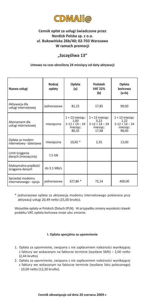 Cennik opłat za usługi świadczone przez Nordisk Polska sp. z o.o. ul. Bukowińska 26b/40; 02-703 Warszawa W ramach promocji „Szczęśliwa 13” Umowa na czas określony 24 miesięcy od daty aktywacji Rodzaj opłaty Opłata (a) Podatek VAT 22% (b) Opłata końcowa (a+b) Aktywacja dla usługi internetowej jednorazowa 81,15 17,85 99,00 Abonament dla usługi internetowej miesięczna Opłata za modem internetowy - dzierżawa miesięczna Nazwa usługi Limit ściągania danych (miesięczny) 1 + 13 miesiąc: 1 + 13 miesiąc: 1,00 0,22 2-12 + 14 – 24 2-12 + 14 – 24 miesiąc: miesiąc: 80,32 17,68 1 + 13 miesiąc: 1,22 2-12 + 14 – 24 miesiąc: 98,00 10,65 * 2,35 13,00 327,86 * 72,14 400,00 7,5 GB Maksymalna prędkość ściągania danych do 3.1 Mb/s Sprzedaż modemu internetowego - opcja jednorazowa * jednorazowa opłata za aktywację modemu internetowego pobierana przy aktywacji usługi 20,49 ne.o (25,00 bru.o). Wszystkie opłaty w Polskich Złotych (PLN). W przypadku zmiany wysokości stawki podatku VAT, opłata końcowa może ulec zmianie. I. Opłata specjalna za upomnienie 1. Opłata za upomnienie, związana z nie zapłaceniem należności wynikającej z faktury we wskazanym na fakturze terminie (wysłane SMS) – 2,00 ne.o (2,44 bru.o). 2. Opłata za upomnienie, związana z nie zapłaceniem należności wynikającej z faktury we wskazanym na fakturze terminie (wysłane listu poleconego) - 10,00 ne.o (12,20 bru.o). Cennik obowiązuje od dnia 20 czerwca 2009 r. Regulamin Promocji „Szczęśliwa 13” §1 Opis promocji 1. Promocja „Szczęśliwa 13” jest organizowana przez firmę Nordisk Polska sp. z o.o. z siedzibą w Warszawie ul. Bukowińska 26b i obejmuje nowych Abonentów, którzy będą korzystali z usług internetowych. 2. Czas trwania Promocji: od 20 czerwca 2009 do 30 listopada 2009 lub do wyczerpania zapasów. 3. W ramach Promocji „Szczęśliwa 13” Abonent może skorzystać z pakietu, który zawiera określone warunki zamieszczone w cenniku promocji.ślone warunki zamieszczone w cenniku promocji. §2 Zasady korzystania z promocji 1. Pakiet promocyjny może być aktywowany u Abonenta, który spełnieni warunki zawarte w Regulaminie Świadczenia Usług Telekomunikacyjnych będącym integralną częścią Promocji „Szczęśliwa 13” oraz warunki wskazane w niniejszym Regulaminie. 2. Pakiet promocyjny obowiązuje przy umowie zawartej na okres 24 pełnych miesięcznych okresów rozliczeniowych. 3. W przypadku jednostronnego rozwiązania umowy promocyjnej przez Abonenta lub Operatora z winy Abonenta przed upływem okresu na jaki została zawarta umowa, Abonent traci wszelkie korzyści wynikające z Promocji. Abonent zobowiązany będzie ponadto do uiszczenia na rzecz Operatora opłaty w wysokości ulgi przyznanej Abonentowi w ramach Promocji (różnica pomiędzy opłatami wynikającymi z cennika podstawowego dla usługi i opłatami wynikającymi z cennika promocji), pomniejszonej o proporcjonalną jej wartość za okres od dnia zawarcia umowy do dnia jej rozwiązania. 4. Operator przyznaje Abonentowi ulgę w płatnościach na czas 24 pełnych cykli rozliczeniowych w wysokości określonej w Umowie, pod warunkiem terminowego regulowania przez Abonenta wszystkich zobowiązań pieniężnych względem Operatora, które wynikają z Umowy. Abonent traci prawo do ulgi - proporcjonalnie za dany okres rozliczeniowy, za który nie uiścił opłaty w terminie. Operator, na umotywowany wniosek Abonenta, może przywrócić ulgę w dotychczasowej lub niższej wysokości. 5. Operator zastrzega sobie prawo ograniczenia prędkości ściągania danych w przypadku przekroczenia przez Abonenta miesięcznego limitu ściągania danych. 6. Po upływie 24 miesięcy od daty aktywacji modem internetowy przechodzi na własność Abonenta, chyba że umowa została wcześniej rozwiązana. W przypadku skorzystania z kolejnej promocji (minimum 12-to miesięcznej) z pakietu zaoferowanego w momencie zakończenia umowy, Abonentowi przysługuje prawo do wniesienia obniżonej opłaty aktywacyjnej nowej usługi w wybranej promocji w wysokości 1,00 PLN brutto (jeden 00/100 PLN). §3 Reklamacje 1. Reklamacje w trakcie trwania promocji „Szczęśliwa 13” mogą być składane w trybie przewidzianym w Regulaminie Świadczenia Usług Telekomunikacyjnych. 2. Złożenie reklamacji nie wstrzymuje obowiązku zapłaty za fakturę. §4 Postanowienia końcowe 1. Opłata za upomnienie, związana z nie zapłaceniem należności wynikającej z faktury w terminie (wysłanie SMS) – 2,00 netto (2,44 brutto). 2. Opłata za upomnienie, związana z nie zapłaceniem należności wynikającej z faktury w terminie (wysłanie listu poleconego) – 10,00 netto (12,20 brutto). 3. W sprawach nieuregulowanych niniejszym Regulaminem zastosowanie znajdują zapisy Regulaminu Świadczenia Usług Telekomunikacyjnych. W razie rozbieżności w postanowieniach Regulaminu Promocji „Szczęśliwa 13” i Regulaminu Świadczenia Usług Telekomunikacyjnych, pierwszeństwo stosowania znajdują postanowienia Regulaminu Promocji „Szczęśliwa 13” 4. W przypadku zmiany Regulaminu, Abonent zostanie poinformowany na piśmie. 5. W przypadku opóźnienia lub niezrealizowania płatności zgodnie z terminami wskazanymi na fakturach Operator zastrzega sobie prawo przekazania danych abonenta do firmy windykacyjnej w celu uzyskania zaległej płatności. 6. Po upływie 24 miesięcy od daty aktywacji usługi, jeżeli Abonent nie skorzysta z innej promocji, obowiązującej w momencie zakończenia obecnej Promocji, promocja ta zostaje automatycznie przedłużona na kolejne 24 miesiące.