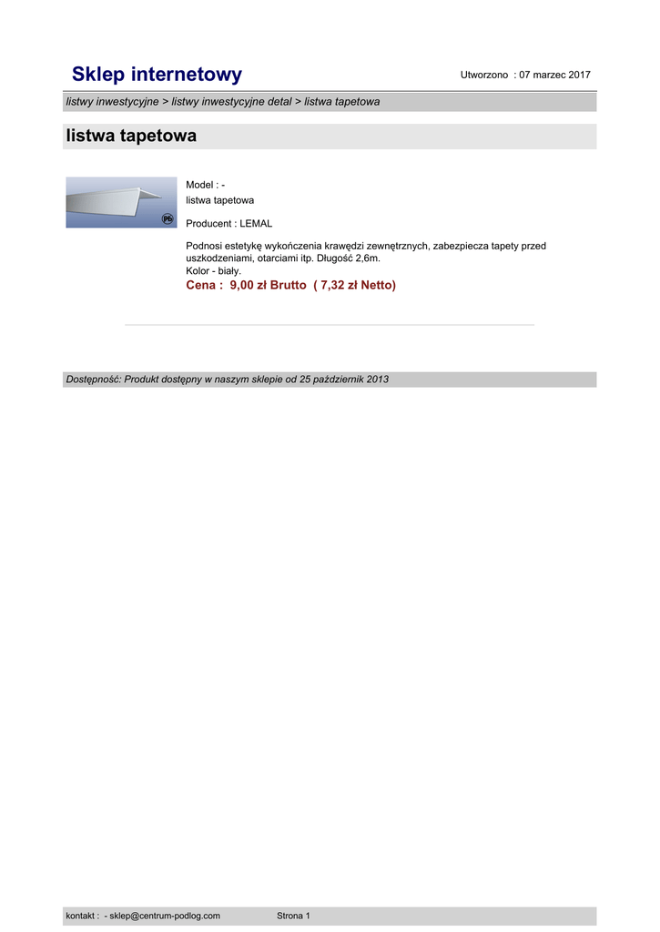 Sklep internetowy Utworzono : 07 marzec 2017 listwy inwestycyjne > listwy inwestycyjne detal > listwa tapetowa listwa tapetowa Model : listwa tapetowa Producent : LEMAL Podnosi estetykę wykończenia krawędzi zewnętrznych, zabezpiecza tapety przed uszkodzeniami, otarciami itp. Długość 2,6m. Kolor - biały. Cena : 9,00 zł Brutto ( 7,32 zł Netto) Dostępność: Produkt dostępny w naszym sklepie od 25 październik 2013 kontakt : - [email protected] Strona 1