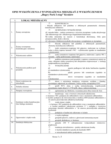 OPIS WYKOŃCZENIA I WYPOSAŻENIA MIESZKAŃ Z WYKOŃCZENIEM „Bagry Park I etap” Kraków I. 1. LOKAL MIESZKALNY Ściany zewnętrzne KONSTRUKCJA - bloczki silikatowe lub podobne o zbliżonych parametrach; elementy monolityczne żelbetowe OCIEPLENIE I WYKOŃCZENIE: a) metoda lekka – mokra systemowa z użyciem styropianu i tynku akrylowego lub silikonowego lub silikatowego fragmentami boniowana b) wełna mineralna na ruszcie z konstrukcji drewnianej, folia paro przepuszczalna, deski z drewna c) elewacja z klinkierowej płytki elewacyjnej z ociepleniem ze styropianu 2. Ściany wewnętrzne konstrukcyjne i działowe 3. Wykończenie sufitów 4. Wykończenie podłoży pod posadzki 5. Drzwi wejściowe do mieszkania 6. Stolarka okienna 7. Parapety wewnętrzne 8. Instalacja wodno-kanalizacyjna (bez białego montażu) 9. Ogrzewanie i ciepła woda 10. Instalacja elektryczna bloczki silikatowe lub podobne o zbliżonych parametrach; elementy monolityczne żelbetowe tynki cementowo-wapienne lub gipsowe, malowane na wybrany kolor z oferty (oprócz łazienki i WC – wykończenie zgodne ze standardem wykończenia) tynki cementowo-wapienne lub gipsowe, malowane ( oprócz WC i łazienki – sufity podwieszane, malowane) podłoża cementowe pod posadzki z zaprawy cementowej zatarte na ostro, zbrojone siatką systemową lub zbrojeniem rozproszonym z izolacją podposadzkową (styropian) WYKOŃCZENIE a) panele podłogowe lub deska barlinecka (zgodnie ze standardem wykończenia) b) płytki gresowe lub ceramiczne (zgodnie ze standardem wykończenia) c) drzwi wewnętrzne (zgodnie ze standardem wykończenia) drzwi z ościeżnicą metalową, wizjerem, szyldem i klamką, posiadające odporność na włamanie 2 klasy normy europejskiej ENV profil PCV, okna z szybą termoizolacyjną, współczynnik przenikania ciepła okna k=1.3 W/m2K, okna z mikrowentylacją aglomarmur np. Botticino, wysunięty poza obrys muru do 3cm z węzła cieplnego grzejniki płytowe, stalowe z głowicami termostatycznymi grzejnik drabinkowy w łazience kanalizacja – rury z tworzyw sztucznych zakończona: - w łazience i WC: podejścia do odbiorników wraz z montażem odbiorników - w kuchni: podejście do zlewozmywaka o średnicy Ø50 (montaż odbiorników o ile umowa przewidywała zabudowę kuchenną) woda zimna i ciepła: - w łazience i WC podejścia do odbiorników wraz z montażem odbiorników - w kuchni podejście zakończone gwintem ½” i zaślepką z tworzywa sztucznego (montaż odbiorników o ile umowa przewidywała zabudowę kuchenną) podejścia w kuchni nie zakuwane w ścianie gniazda 230 V zabezpieczone wyłącznikami prądowymi instalacja oświetleniowa – punkty zakończone kostką w kuchni dodatkowo puszka do kuchenki 400V w mieszkaniach tablice podtynkowe Strona 1 z 3 różnicowo- 11. Instalacja internetowa 12. Instalacja telefoniczna 13. Instalacja telewizyjna 14. Instalacja przyzywowa dla osób niepełnosprawnych 15. Instalacja domofonowa 16. Tarasy nad garażami dzwonek przy wejściu do lokalu w łazienkach instalacja prowadzona po ścianie na balkonach i tarasach jeden punkt oświetleniowy przycisk i sygnalizator optyczno-akustyczny w łazience aparat naścienny okablowanie z jednym punktem na mieszkanie, bez osprzętu (świadczenie usług internetowych na podstawie odrębnej umowy z operatorem), okablowanie z jednym punktem na mieszkanie, bez osprzętu (świadczenie usług telefonicznych na podstawie odrębnej umowy z operatorem), 1 gniazdo TV cyfrowej naziemnej, okablowanie z jednym punktem na mieszkanie dla telewizji satelitarnej, bez osprzętu (świadczenie usług telewizyjnych na podstawie odrębnej umowy z operatorem), okablowanie z jednym punktem na mieszkanie dla telewizji kablowej, bez osprzętu (świadczenie usług telewizyjnych na podstawie odrębnej umowy z operatorem), posadzka z kostki lub płyt betonowych lub posadzka z desek i legarów impregnowanych tereny zielone na stropach garażowych budynków typu A 17. płytki i cokoliki gresowe, mrozoodporne lub posadzka z desek i legarów impregnowanych balustrady stalowe malowane proszkowo lub balustrady stalowe malowane proszkowo z wypełnieniem szkłem bezpiecznym Balkony II. GARAŻ/ SCHOWKI/KOMÓRKI LOKATORSKIE 1. Ściany zewnętrzne żelbetowe monolityczne lub silikatowe 2. Ściany wewnętrzne żelbetowe monolityczne lub silikatowe 3. Płyta posadzkowa 4. Strop nad parterem posadzka betonowa przemysłowa utwardzona powierzchniowo żelbetowy monolityczny, docieplony na parterze w obrębie pomieszczeń 5. Pomieszczenia techniczne ogrzewanych 1 piętra posadzka betonowa przemysłowa utwardzona powierzchniowo lub płytki gresowe mrozoodporne lub wylewka cementowa zatarta na ostro drzwi do pomieszczeń technicznych systemowe wydzielone ściankami działowymi nietynkowane, z drzwiami lub 6. Komórki lokatorskie/ schowki/ zaplecza postojowe rozwiązanie systemowe modułowe posadzka betonowa przemysłowa utwardzona powierzchniowo lub płytki gresowe mrozoodporne lub wylewka cementowa zatarta na ostro wentylacja mechaniczna w 7 Instalacje garażu instalacja ewakuacyjnego wentylacja mechaniczna oświetlenia podstawowego, awaryjnego III. KOMUNIKACJA WEWNĘTRZNA - KLATKI SCHODOWE 1. Ściany wewnętrzne i sufity 2. Spoczniki, schody tynk ciepłochronny lub metoda lekka-mokra z użyciem wełny malowanie farbą akrylową płytki gresowe 3. Instalacja oświetleniowa oświetlenie i osprzęt dostosowany do wymogów oświetlenia schodowego Strona 2 z 3 i W przypadku trudności w nabyciu danego rodzaju materiału, może być zastosowany materiał zastępczy o porównywalnej jakości. Strona 3 z 3
