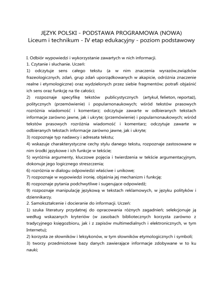 ZYK POLSKI - PODSTAWA PROGRAMOWA (NOWA) Liceum i technikum - IV etap edukacyjny - poziom podstawowy I. Odbiór wypowiedzi i wykorzystanie zawartych w nich informacji. 1. Czytanie i s uchanie. Ucze : 1) odczytuje sens ca ego tekstu (a w nim znaczenia wyrazów,zwi zków frazeologicznych, zda , grup zda uporz dkowanych w akapicie, odró nia znaczenie realne i etymologiczne) oraz wydzielonych przez siebie fragmentów; potrafi obja ni ich sens oraz funkcj na tle ca 2) rozpoznaje specyfik ci; tekstów publicystycznych (artyku , felieton, reporta ), politycznych (przemówienie) i popularnonaukowych; w ród tekstów prasowych rozró nia wiadomo i komentarz; odczytuje zawarte w odbieranych tekstach informacje zarówno jawne, jak i ukryte; (przemówienie) i popularnonaukowych; w ród tekstów prasowych rozró nia wiadomo i komentarz; odczytuje zawarte w odbieranych tekstach informacje zarówno jawne, jak i ukryte; 3) rozpoznaje typ nadawcy i adresata tekstu; 4) wskazuje charakterystyczne cechy stylu danego tekstu, rozpoznaje zastosowane w nim rodki j zykowe i ich funkcje w tek cie; 5) wyró nia argumenty, kluczowe poj cia i twierdzenia w tek cie argumentacyjnym, dokonuje jego logicznego streszczenia; 6) rozró nia w dialogu odpowiedzi w ciwe i unikowe; 7) rozpoznaje w wypowiedzi ironi , obja nia jej mechanizm i funkcj ; 8) rozpoznaje pytania podchwytliwe i sugeruj ce odpowied ; 9) rozpoznaje manipulacj j zykow w tekstach reklamowych, w j zyku polityków i dziennikarzy. 2. Samokszta cenie i docieranie do informacji. Ucze : 1) szuka literatury przydatnej do opracowania ró nych zagadnie ; selekcjonuje j wed ug wskazanych kryteriów (w zasobach bibliotecznych korzysta zarówno z tradycyjnego ksi gozbioru, jak i z zapisów multimedialnych i elektronicznych, w tym Internetu); 2) korzysta ze s owników i leksykonów, w tym s owników etymologicznych i symboli; 3) tworzy przedmiotowe bazy danych zawieraj ce informacje zdobywane w to ku nauki; 4) sporz dza opis bibliograficzny ksi ki i artyku u, zapisów elektronicznych, bibliografi wybranego tematu 3. wiadomo j zykowa. Ucze : 1) analizuje i de niuje (w razie potrzeby z pomoc s owników) znaczenia s ów; 2) zna poj cia znaku i systemu znaków; uzasadnia, e j zyk jest systemem znaków; rozró nia znaki werbalne i niewerbalne, ma wiadomo ich ró nych funkcji i sposobów interpretacji; 3) zna poj cie aktu komunikacji j zykowej i wskazuje jego sk adowe (nadaw ca, odbiorca, kod, komunikat, kontekst), dostrzega i omawia wspó czesne zmiany modelu komunikacji j zykowej (np. ró nice mi dzy tradycyjn komunikacj ustn lub pisan a komunikacj przez Internet); 4) rozpoznaje i nazywa funkcje tekstu (informatywn , poetyck , ekspresywn , impresywn – w tym perswazyjn ); 5) wskazuje w czytanych tekstach i analizuje przyk ady od mian terytorialnych, rodowiskowych i zawodowych polszczyzny; 6) rozpoznaje w czytanych tekstach oraz wypowiedziach mówionych stylizacj , rozró nia jej typy 7) rozró nia poj cia b du j zykowego i zamierzonej innowacji j zykowej, poprawno ci i stosowno ci wypowiedzi; rozpoznaje i poprawia ró ne typy b dów zykowych; 8) odró nia s ownictwo neutralne od emocjonalnego i warto ciuj cego, o cjalne od swobodnego. II. Analiza i interpretacja tekstów kultury. Ucze zna teksty literackie i inne teksty kultury wskazane przez nauczyciela. 1. Wst pne rozpoznanie. Ucze : 1) prezentuje w asne prze ycia wynikaj ce z kontaktu z dzie em sztuki; 2) okre la problematyk utworu; 3) rozpoznaje konwencj literack (sta e pojawianie si danego literackiego rozwi zania w obr bie pewnego historycznie okre lonego zbioru utworów) 2. Analiza. Ucze : 1) wskazuje zastosowane w utworze rodki wyrazu artystycznego i ich funkcje (poznane wcze niej, a ponadto: oksymorony, synekdochy, hiperbole, elipsy, paralelizmy) oraz inne wyznaczniki poetyki danego utworu (z zakresu podstaw wersy kacji, kompozycji, genologii) i okre la ich funkcje; 2) dostrzega w czytanych utworach cechy charakterystyczne okre lonej epoki redniowiecze, renesans, barok, o wiecenie, romantyzm, pozytywizm, M oda Polska, dwudziestolecie mi dzywojenne, wspó czesno ); 3) analizuj c teksty dawne, dostrzega ró nice j zykowe (fonetyczne, leksykalne) wynikaj ce ze zmian historycznych; 4) rozpoznaje w utworze sposoby kreowania wiata przedstawionego i bohatera (narracja, fabu a, sytuacja liryczna, akcja); 5) porównuje utwory literackie lub ich fragmenty (dostrzega cechy wspólne i ró ne). 3. Interpretacja. Ucze : 1) wykorzystuje w interpretacji elementy znacz ce dla odczytania sensu utworu (np. owa-klucze, wyznaczniki kompozycji); 2) wykorzystuje w interpretacji utworu konteksty (np. Literackie, kulturowe, lozo czne, religijne); 3) porównuje funkcjonowanie tych samych motywów w ró nych utworach literackich; 4) odczytuje tre ci alegoryczne i symboliczne utworu. 4. Warto ci i warto ciowanie. Ucze : 1) dostrzega zwi zek j zyka z warto ciami, rozumie, e j zyk podlega warto ciowaniu, (np. j zyk jasny, prosty, zrozumia y, obrazowy, pi kny), jest narz dziem warto ciowania, a tak e ród em poznania warto ci (utrwalonych w znaczeniach nazw warto ci, takich jak: dobro, prawda, pi kno; wiara, nadzieja, mi braterstwo; Bóg, honor, ojczyzna; solidarno , niepodleg ; wolno , równo , , tolerancja); 2) dostrzega obecne w utworach literackich oraz innych tekstach kultury warto ci narodowe i uniwersalne; 3) dostrzega w wiecie konflikty warto ci (np. równo ci i wolno ci, sprawiedliwo ci i mi osierdzia) oraz rozumie ród a tych konfliktów. III. Tworzenie wypowiedzi. 1. Mówienie i pisanie. Ucze : 1) tworzy d szy tekst pisany lub mówiony (rozprawka, recenzja, referat, interpretacja utworu literackiego lub fragmentu) zgodnie z podstawowymi regu ami jego organizacji, przestrzegaj c zasad spójno ci znaczeniowej i logicznej; 2) przygotowuje wypowied (wybiera form gatunkow kompozycyjny, analizuje temat, wybiera form wypowiedzi, dobiera w ciwe s ownictwo); 3) tworzy samodzieln wypowied logiki i retoryki (stawia tez argumentacyjn i odpowied