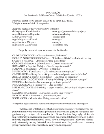 PROTOKÓŁ 38. Festiwalu Folkloru Górali Polskich – Żywiec 2007 r. Festiwal odbył się w dniach od 28 do 31 lipca 2007 roku. Wzięło w nim udział 16 zespołów. Zespoły oceniało Jury Festiwalu w składzie: dr Krystyna Kwaśniewicz - etnograf, przewodnicząca jury mgr Aleksandra Bogucka - etnomuzykolog Lidia Czechowska - choreograf mgr Małgorzata Kiereś - etnograf mgr Czesław Węglarz - muzyk mgr Janina Glanowska - sekretarz jury Zespoły uczestniczące w konkursie Festiwalu: OLDRZYCHOWICE z Oldrzychowic – „Rekrutka” DOLINA NOWEGO SOŁOŃCA ze Złotnika – „Kłaka” – skubanie wełny SKALNI z Krakowa – „Przygotowanie do redyku” GÓROLE z Mostów k. Jabłonkowa – „Dzień na szałasie” ROMANKA z Sopotni Małej – „Ostatki sopotniańskie” HARNASIE z Suchego – „Wesele – oczepiny” KONIAKÓW z Koniakowa – „Na szkubaczce z muzykom” ONDRASZEK ze Szczyrku – „W przededniu odpustu na św. Jakuba” ZIEMIA SUSKA z Suchej Beskidzkiej – „Zabawa w karczmie” KASINIANIE-ZAGÓRZANIE z Kasiny Wielkiej – „Na len na konopie” ISTEBNA z Istebnej – „Na muzyce przy śmiergustach” PISARZOWIANIE z Pisarzowej – „Na Sobótkę” MSZALNICZANIE z Mszalnicy – część wesela: „Rękowiny i błogosławieństwo” DAWIDENKA z Koźlic – „Drwanie śloków i na weredy” IWKOWIANIE z Iwkowej – „Imieniny u Jona” SPOD KICEK z Mordarki – „Pożegnanie rekrutów” Wszystkie zgłoszone do konkursu zespoły zostały ocenione przez jury. Podobnie jak w latach ubiegłych organizatorzy zapewnili każdemu zespołowi możliwość omówienia programu z członkami jury, na specjalnie zorganizowanych w tym celu konsultacjach. Konsultacje te dotyczyły całokształtu problematyki związanej z prezentacją programu folklorystycznego tj. obejmowały zagadnienia muzyki, tańca, stroju, obrzędowości i reżyserii scenicznej i stanowiły formę dokształcania instruktorów. Indywidualne rozmowy przeprowadzono z kierownikami wszystkich zespołów. Jury miało do dyspozycji następujące nagrody regulaminowe, których fundatorem jest Ministerstwo Kultury i Dziedzictwa Narodowego: „Złote Żywieckie Serce” i 5.000,00 zł „Srebrne Żywieckie Serce” i 4.000,00 zł „Brązowe Żywieckie Serce” i 3.000,00 zł 4 wyróżnienia dla zespołów po 2.000,00 zł 5 nagród indywidualnych dla instruktorów po 600,00 zł Ogółem pula nagród wynosi 23.000 zł. W trakcie obrad, jury w porozumieniu z organizatorami Tygodnia Kultury Beskidzkiej zmieniło określenie „wyróżnienie dla zespołów” na określenie „nagrody dla zespołów”, prosząc aby ta zmiana została uwzględniona w przyszłorocznym regulaminie. Jury przyznało nagrody, które otrzymują: „Złote Żywieckie Serce” i nagrodę 5.000,00 zł „ROMANKA” z Sopotni Małej „Srebrne Żywieckie Serce” i nagrodę 4.000,00 zł „SPOD KICEK” z Mordarki „Brązowe Żywieckie Serce” i nagrodę 3.000,00 zł „KASINIANIE-ZAGÓRZANIE” z Kasiny Wielkiej Nagrody regulaminowe za poszczególne elementy programu i nagrody pieniężne po 2.000,00 zł każda otrzymują: „OLDRZYCHOWICE” z Oldrzychowic za dobór i wykonanie tańców „MSZALNICZANIE” z Mszalnicy za wysokie walory artystyczne wesela lachowskiego „HARNASIE” z Suchego za oddanie nastroju autentycznego wesela podhalańskiego „ONDRASZEK” ze Szczyrku za walory widowiskowe zabawy na polanie. Nagrody regulaminowe dla instruktorów po 600,00 zł każda decyzją jury otrzymują: Zbigniew Wałach z zespołu „Koniaków” Rafał Główka z zespołu „Ondraszek” Antoni Gluza z zespołu „Ondraszek” Stanisław Staszel z zespołu „Harnasie” Tadeusz Papierzyński z zespołu „Istebna” Zgodnie z sugestią organizatorów Tygdnia Kultury Beskidzkiej jury proponuje na Międzynarodowy Festiwal Folkloru Ziem Górskich w Zakopanem zespoły: „ROMANKA” z Sopotni Małej z programem „Ostatki sopotniańskie” „KASINIANIE-ZAGÓRZANIE” z Kasiny Wielkiej z programem „Na len na konopie” „HARNASIE” z Suchego z programem „Wesele – oczepiny” Zdaniem komisji Festiwal Folkloru Górali Polskich jako część składowa Tygodnia Kultury Beskidzkiej powinien zachować swoją odrębność i rangę imprezy ważnej dla polskiej góralszczyzny. Organizacja Festiwalu – zdaniem komisji – była jak zwykle bardzo dobra, za co wyraża podziękowanie wszystkim, którzy się do tego przyczynili. Równocześnie członkowie jury zwracają się z prośbą do władz miasta i organizatorów Festiwalu w Żywcu o stworzenie właściwych warunków pracy, w trakcie oceny zespołów pod Grojcem (tj. wygodnych stołów do sporządzania notatek, oświetlenia i zabezpieczenia przed deszczem). Na tym protokół zakończono.