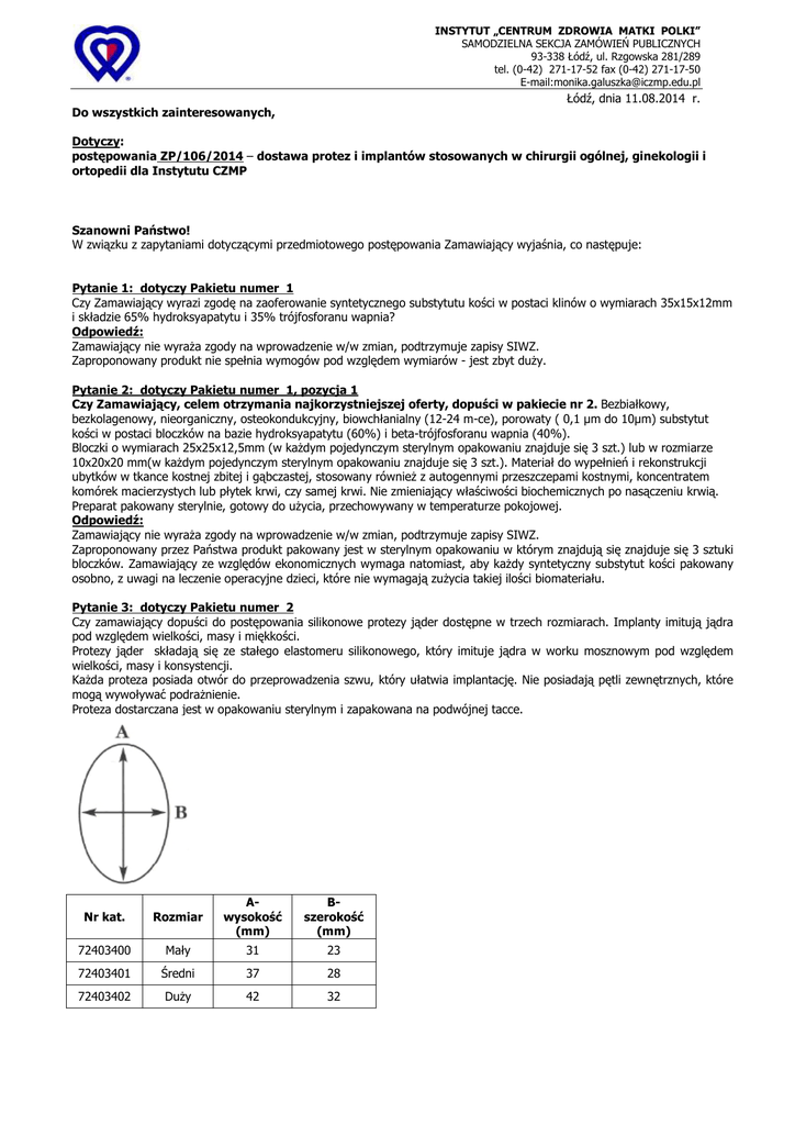 INSTYTUT „CENTRUM ZDROWIA MATKI POLKI” SAMODZIELNA SEKCJA ZAMÓWIEŃ PUBLICZNYCH 93-338 Łódź, ul. Rzgowska 281/289 tel. (0-42) 271-17-52 fax (0-42) 271-17-50 E-mail:[email protected] Łódź, dnia 11.08.2014 r. Do wszystkich zainteresowanych, Dotyczy: postępowania ZP/106/2014 – dostawa protez i implantów stosowanych w chirurgii ogólnej, ginekologii i ortopedii dla Instytutu CZMP Szanowni Państwo! W związku z zapytaniami dotyczącymi przedmiotowego postępowania Zamawiający wyjaśnia, co następuje: Pytanie 1: dotyczy Pakietu numer 1 Czy Zamawiający wyrazi zgodę na zaoferowanie syntetycznego substytutu kości w postaci klinów o wymiarach 35x15x12mm i składzie 65% hydroksyapatytu i 35% trójfosforanu wapnia? Odpowiedź: Zamawiający nie wyraŜa zgody na wprowadzenie w/w zmian, podtrzymuje zapisy SIWZ. Zaproponowany produkt nie spełnia wymogów pod względem wymiarów - jest zbyt duŜy. Pytanie 2: dotyczy Pakietu numer 1, pozycja 1 Czy Zamawiający, celem otrzymania najkorzystniejszej oferty, dopuści w pakiecie nr 2. Bezbiałkowy, bezkolagenowy, nieorganiczny, osteokondukcyjny, biowchłanialny (12-24 m-ce), porowaty ( 0,1 µm do 10µm) substytut kości w postaci bloczków na bazie hydroksyapatytu (60%) i beta-trójfosforanu wapnia (40%). Bloczki o wymiarach 25x25x12,5mm (w kaŜdym pojedynczym sterylnym opakowaniu znajduje się 3 szt.) lub w rozmiarze 10x20x20 mm(w kaŜdym pojedynczym sterylnym opakowaniu znajduje się 3 szt.). Materiał do wypełnień i rekonstrukcji ubytków w tkance kostnej zbitej i gąbczastej, stosowany równieŜ z autogennymi przeszczepami kostnymi, koncentratem komórek macierzystych lub płytek krwi, czy samej krwi. Nie zmieniający właściwości biochemicznych po nasączeniu krwią. Preparat pakowany sterylnie, gotowy do uŜycia, przechowywany w temperaturze pokojowej. Odpowiedź: Zamawiający nie wyraŜa zgody na wprowadzenie w/w zmian, podtrzymuje zapisy SIWZ. Zaproponowany przez Państwa produkt pakowany jest w sterylnym opakowaniu w którym znajdują się znajduje się 3 sztuki bloczków. Zamawiający ze względów ekonomicznych wymaga natomiast, aby kaŜdy syntetyczny substytut kości pakowany osobno, z uwagi na leczenie operacyjne dzieci, które nie wymagają zuŜycia takiej ilości biomateriału. Pytanie 3: dotyczy Pakietu numer 2 Czy zamawiający dopuści do postępowania silikonowe protezy jąder dostępne w trzech rozmiarach. Implanty imitują jądra pod względem wielkości, masy i miękkości. Protezy jąder składają się ze stałego elastomeru silikonowego, który imituje jądra w worku mosznowym pod względem wielkości, masy i konsystencji. KaŜda proteza posiada otwór do przeprowadzenia szwu, który ułatwia implantację. Nie posiadają pętli zewnętrznych, które mogą wywoływać podraŜnienie. Proteza dostarczana jest w opakowaniu sterylnym i zapakowana na podwójnej tacce. Nr kat. Rozmiar Awysokość (mm) Bszerokość (mm) 72403400 Mały 31 23 72403401 Średni 37 28 72403402 DuŜy 42 32 Odpowiedź: Zamawiający wyraŜa zgodę na wprowadzenie w/w zmiany. W związku z powyŜszym zmianie ulega Formularz Cenowy – załącznik Nr 2 do SIWZ w zakresie Pakietu 2. Integralnymi załącznikami do niniejszego pisma są: - Zmieniony Załącznik Nr 2 do SIWZ Formularz Cenowy - Informacja o zmianie ogłoszenia. Ostateczny termin składania i otwarcia ofert ulega zmianie. Zmianie ulega: Specyfikacja Istotnych Warunków Zamówienia w zakresie: § 58 Było: Ofertę naleŜy złoŜyć w Samodzielnej Sekcji Zamówień Publicznych Instytutu „Centrum Zdrowia Matki Polki”, 93-338 Łódź ul. Rzgowska 281/289, pawilon „A” (Ginekologiczno-PołoŜniczy), poziom „0”, pok. Nr 15 do dnia 14.08.2014 r. do godz.10:00 Jest: Ofertę naleŜy złoŜyć w Samodzielnej Sekcji Zamówień Publicznych Instytutu „Centrum Zdrowia Matki Polki”, 93-338 Łódź ul. Rzgowska 281/289, pawilon „A” (Ginekologiczno-PołoŜniczy), poziom „0”, pok. Nr 15 do dnia 19.08.2014 r. do godz.10:00 § 61 Było: Otwarcie ofert nastąpi w Samodzielnej Sekcji Zamówień Publicznych Instytutu „Centrum Zdrowia Matki Polki”, 93-338 Łódź ul. Rzgowska 281/289, pawilon „A” (Ginekologiczno-PołoŜniczy), poziom „0”, pokój Nr 15, w dniu 14.08.2014 r. o godz.10:15 Jest: Otwarcie ofert nastąpi w Samodzielnej Sekcji Zamówień Publicznych Instytutu „Centrum Zdrowia Matki Polki”, 93-338 Łódź ul. Rzgowska 281/289, pawilon „A” (Ginekologiczno-PołoŜniczy), poziom „0”, pokój Nr 15, w dniu 19.08.2014 r. o godz.10:15 Wersja elektroniczna dokumentu. Dokument podpisany w oryginale przez prof. dr hab. n. med. Macieja Banacha Dyrektora Instytutu „Centrum Zdrowia Matki Polki”