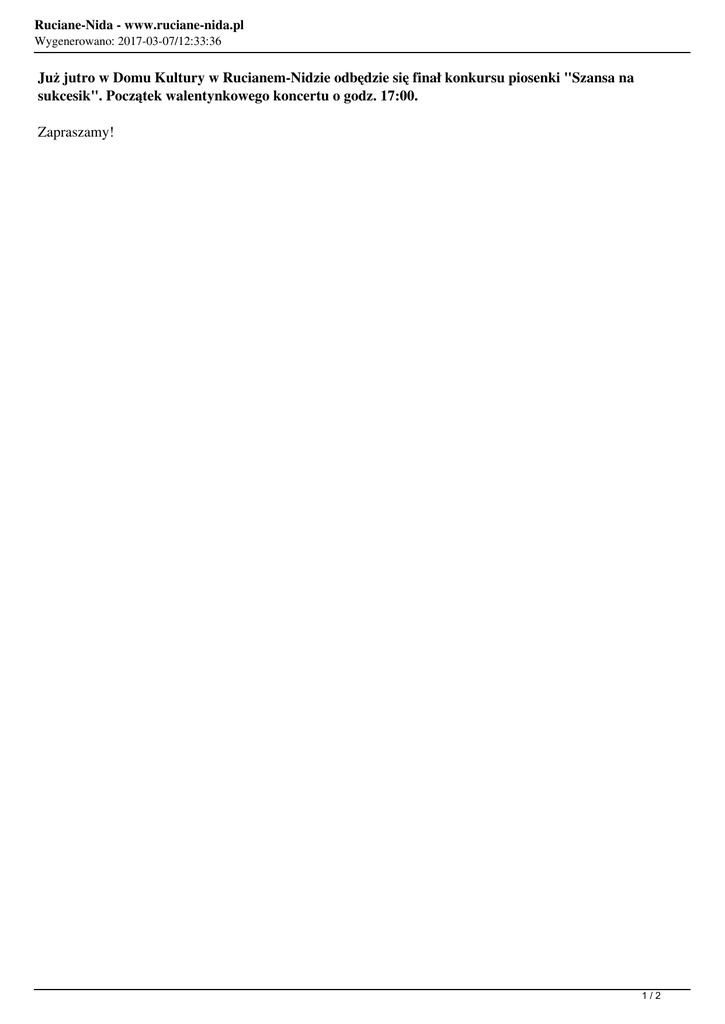 Ruciane-Nida - www.ruciane-nida.pl Wygenerowano: 2017-03-07/12:33:36 Już jutro w Domu Kultury w Rucianem-Nidzie odbędzie się finał konkursu piosenki "Szansa na sukcesik". Początek walentynkowego koncertu o godz. 17:00. Zapraszamy! 1/2 Ruciane-Nida - www.ruciane-nida.pl Wygenerowano: 2017-03-07/12:33:36 2/2 Powered by TCPDF (www.tcpdf.org)