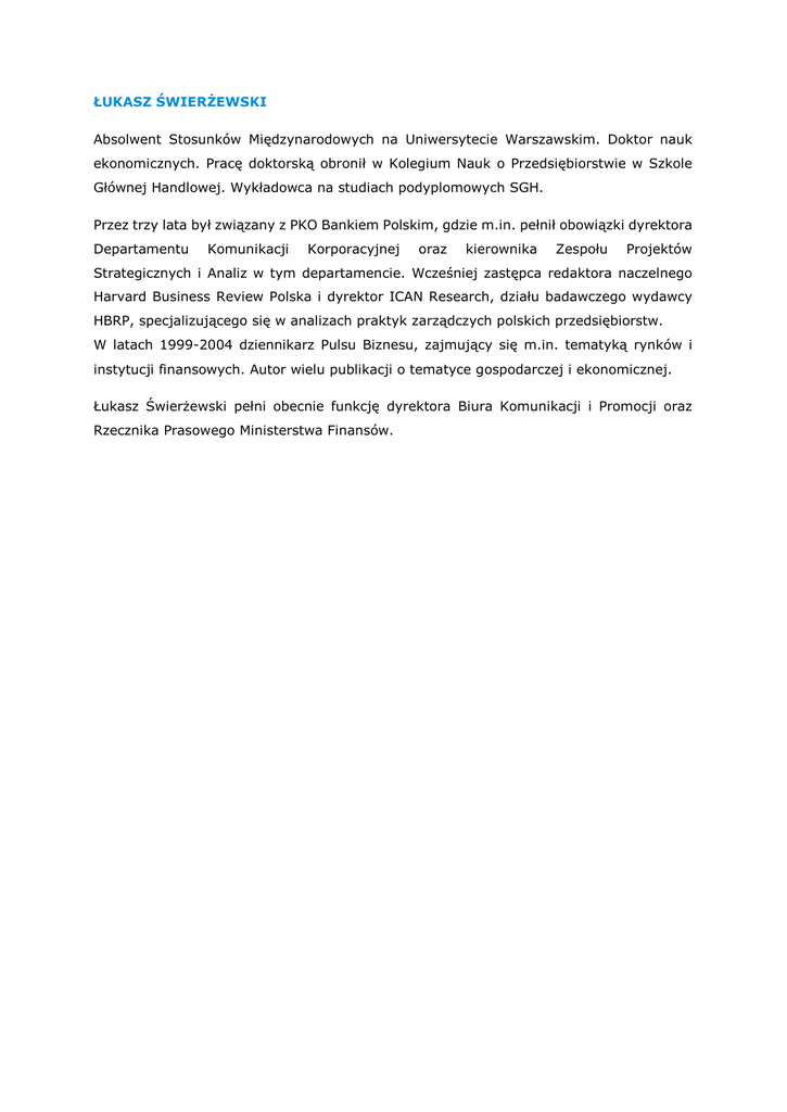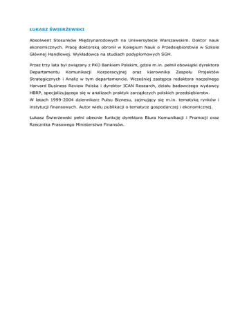 ŁUKASZ ŚWIERŻEWSKI Absolwent Stosunków Międzynarodowych na Uniwersytecie Warszawskim. Doktor nauk ekonomicznych. Pracę doktorską obronił w Kolegium Nauk o Przedsiębiorstwie w Szkole Głównej Handlowej. Wykładowca na studiach podyplomowych SGH. Przez trzy lata był związany z PKO Bankiem Polskim, gdzie m.in. pełnił obowiązki dyrektora Departamentu Komunikacji Korporacyjnej oraz kierownika Zespołu Projektów Strategicznych i Analiz w tym departamencie. Wcześniej zastępca redaktora naczelnego Harvard Business Review Polska i dyrektor ICAN Research, działu badawczego wydawcy HBRP, specjalizującego się w analizach praktyk zarządczych polskich przedsiębiorstw. W latach 1999-2004 dziennikarz Pulsu Biznesu, zajmujący się m.in. tematyką rynków i instytucji finansowych. Autor wielu publikacji o tematyce gospodarczej i ekonomicznej. Łukasz Świerżewski pełni obecnie funkcję dyrektora Biura Komunikacji i Promocji oraz Rzecznika Prasowego Ministerstwa Finansów.