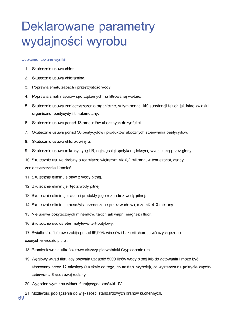 Deklarowane parametry wydajności wyrobu Udokumentowane wyniki 1. Skutecznie usuwa chlor. 2. Skutecznie usuwa chloraminę. 3. Poprawia smak, zapach i przejrzystość wody. 4. Poprawia smak napojów sporządzonych na filtrowanej wodzie. 5. Skutecznie usuwa zanieczyszczenia organiczne, w tym ponad 140 substancji takich jak lotne związki organiczne, pestycydy i trihalometany. 6. Skutecznie usuwa ponad 13 produktów ubocznych dezynfekcji. 7. Skutecznie usuwa ponad 30 pestycydów i produktów ubocznych stosowania pestycydów. 8. Skutecznie usuwa chlorek winylu. 9. Skutecznie usuwa mikrocystynę LR, najczęściej spotykaną toksynę wydzielaną przez glony. 10. Skutecznie usuwa drobiny o rozmiarze większym niż 0,2 mikrona, w tym azbest, osady, zanieczyszczenia i kamień. 11. Skutecznie eliminuje ołów z wody pitnej. 12. Skutecznie eliminuje rtęć z wody pitnej. 13. Skutecznie eliminuje radon i produkty jego rozpadu z wody pitnej. 14. Skutecznie eliminuje pasożyty przenoszone przez wodę większe niż 4–3 mikrony. 15. Nie usuwa pożytecznych minerałów, takich jak wapń, magnez i fluor. 16. Skutecznie usuwa eter metylowo-tert-butylowy. 17. Światło ultrafioletowe zabija ponad 99,99% wirusów i bakterii chorobotwórczych przeno szonych w wodzie pitnej. 18. Promieniowanie ultrafioletowe niszczy pierwotniaki Cryptosporidium. 19. Węglowy wkład filtrujący pozwala uzdatnić 5000 litrów wody pitnej lub do gotowania i może być stosowany przez 12 miesięcy (zależnie od tego, co nastąpi szybciej), co wystarcza na pokrycie zapotrzebowania 6-osobowej rodziny. 20. Wygodna wymiana wkładu filtrującego i żarówki UV. 69 21. Możliwość podłączenia do większości standardowych kranów kuchennych. 22. Korzysta z zastrzeżonych technik opatentowanych w Stanach Zjednoczonych. Numery patentów USA 4,753,728; 4,859,386; 5,017,318; 6,368,504; 5,573,666; 5,529,689; 6,436,299. Postępowanie w sprawie dodatkowych patentów w Stanach Zjednoczonych i międzynarodowych jest na ukończeniu lub w toku. Uwaga: Substancje zanieczyszczające oraz inne substancje wymienione w tej części nie muszą znajdować się w Państwa wodzie pitnej. Kiedy wskaźnik zasygnalizuje koniec użyteczności filtra, w celu zapewnienia optymalnej sprawności urządzenia konieczna jest wymiana wkładu filtrującego. Deklaracja 1: skutecznie usuwa chlor W większości miejskich sieci wodociągowych stosuje się chlorowanie w celu wyeliminowania szkodliwych mikroorganizmów, by zapobiec rozprzestrzenianiu się chorób drogą wodną. Wiele osób ocenia smak chloru jako przykry. W laboratoriach NSF przeprowadzono testy dwóch urządzeń eSpring™ pod kątem zmniejszania zawartości chloru w ramach normy NSF/ANSI nr 42, „Urządzenia do uzdatniania wody, względy estetyczne”. Urządzenia testowano w pełnym zakresie żywotności wkładu filtrującego, czyli na 5000 litrów wody. Przepływ wody naprzemiennie włączano i wyłączano co 10 minut, stosując ciśnienie 410 kPa. Normy dotyczące eliminowania chloru ustalone przez NSFI dotyczą stężenia 2,0 ppm w wodzie wchodzącej. Zawartość wolnego chloru musi być zmniejszana przynajmniej o 75%. System oczyszczania wody eSpring pozwalał usunąć powyżej 98% chloru. Deklaracja 2: skutecznie usuwa chloraminę Jakkolwiek w wielu ośrodkach miejskich eliminowanie mikroorganizmów chorobotwórczych z wody pitnej odbywa się przez traktowanie chlorem, coraz większą popularność zyskuje także alternatywny środek dezynfekujący, chloramina. Podobnie jak w przypadku chloru, chloramina zmienia smak i zapach wody pitnej, w sposób często uważany za niepożądany. W laboratoriach NSF poddano testom dwa urządzenia eSpring pod kątem zmniejszenia zawartości chloraminy w ramach normy NSF/ANSI nr 42, „Urządzenia do uzdatniania wody, względy estetyczne”. Urządzenia testowano w pełnym zakresie żywotności wkładu filtrującego, czyli na 5000 litrów wody, zgodnie z treścią protokołu. Protokół wymaga wstępnego zanieczyszczenia wody monochloraminą w stężeniu 3 ppm, a testowane urządzenie musi zmniejszać jej zawartość do poziomu poniżej 0,51 ppm. System zmniejszał wyjściową zawartość 2,9 ppm monochloraminy w wodzie wchodzącej do poziomu nie większego niż 0,33 ppm. 70 Deklaracja 3: polepsza smak, zapach i przejrzystość wody W ramach badań przeprowadzonych wśród mieszkańców wybranego miasta amerykańskiego urządzenie otrzymało dobre oceny konsumentów pod względem poprawy smaku, zapachu i przejrzystość wody. Poniżej przedstawiono dane na temat odsetka ankietowanych, którzy zauważyli poprawę poszczególnych aspektów jakości wody. • Poprawa przejrzystości • Poprawa smaku 98% • Poprawa zapachu 86% 79% Deklaracja 4: poprawia smak napojów sporządzonych na filtrowanej wodzie W ramach wyżej opisanych badań konsumenckich proszono ankietowanych o ocenę, czy poprawie uległ smak napojów przygotowywanych na bazie oczyszczonej wody. System oczyszczania wody eSpring™ poprawił smak napojów przygotowanych na bazie oczyszczonej wody zdaniem 82% badanych. Źródłem niekorzystnych walorów smakowych wody mogą być także dwa inne rodzaje zanieczyszczeń: izoborneol metylowy i geosmina, których zawartość w wodzie ma związek z obecnością glonów. Konsumenci często zgłaszają zastrzeżenia do smaku i zapachu takiej wody, zwłaszcza w przypadku ujęć, w których okresowo pojawiają się glony. Węgiel aktywowany okazał się skuteczną metodą zmniejszania stężenia tych związków. Deklaracja 5: skutecznie usuwa zanieczyszczenia organiczne, w tym ponad 140 substancji takich jak lotne związki organiczne, pestycydy i trihalometany System oczyszczania wody eSpring charakteryzuje się udokumentowaną skutecznością w usuwaniu z wody wielu substancji organicznych. Testy systemu pod kątem eliminowania takich związków przeprowadzono w kilku laboratoriach. Węgiel aktywowany może zmniejszać stężenie wielu substancji organicznyc