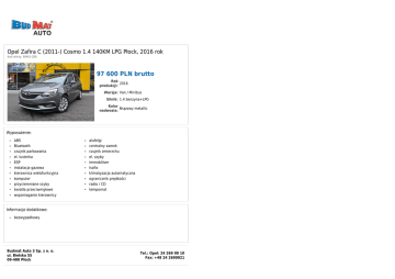 Opel Zafira C (2011-) Cosmo 1.4 140KM LPG Płock, 2016 rok Kod oferty: BMA3-286 97 600 PLN brutto Rok 2016 produkcji: Wersja: Van / Minibus Silnik: 1.4 benzyna+LPG Kolor Brązowy metallic nadwozia: Wyposażenie: - ABS Bluetooth czujnik parkowania el. lusterka ESP instalacja gazowa kierownica wielofunkcyjna komputer przyciemniane szyby światła przeciwmgłowe wspomaganie kierownicy - alufelgi centralny zamek czujnik zmierzchu el. szyby immobiliser Isofix klimatyzacja automatyczna ogranicznik prędkości radio / CD tempomat Informacje dodatkowe: - bezwypadkowy Budmat Auto 3 Sp. z o. o. ul. Bielska 55 09-400 Płock Tel.: Opel: 24 269 00 10 Fax: +48 24 2690021