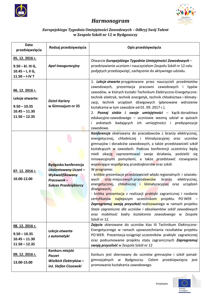 Harmonogram Europejskiego Tygodnia Umiejętności Zawodowych – Odkryj Swój Talent w Zespole Szkół nr 12 w Bydgoszczy Data przedsięwzięcia Rodzaj przedsięwzięcia 05. 12. 2016 r. 9.50 – kl. III G, 10.45 – I, II G, 11.50 – I-IV T Apel Inauguracyjny 06. 12. 2016 r. Lekcje otwarte: 9.50 – 10.35 10.45 – 11.30 11.50 – 12.35 07. 12. 2016 r. 10.00-12.00 Dzień Kariery w Gimnazjum nr 35 Bydgoska konferencja Utalentowany Uczeń – Wykwalifikowany Pracownik – Sukces Przedsiębiorcy 08. 12. 2016 r. 9.50 – 10.35 10.45 – 11.30 11.50 – 12.35 09. 12. 2016 r. 13.00-15.00 Lekcja otwarta z automatyki Konkurs miejski Poczet Wielkich Elektryków – inż. Stefan Ciszewski Opis przedsięwzięcia Otwarcie Europejskiego Tygodnia Umiejętności Zawodowych – przedstawienie uczniom i nauczycielom Zespołu Szkół nr 12 celu podjętych przedsięwzięć, zachęcenie do aktywnego udziału. 1. Lekcje otwarte przygotowane przez nauczycieli przedmiotów zawodowych, prezentacja pracowni zawodowych i typów zawodów, w których kształci Technikum Elektryczno-Energetyczne: technik elektryk, technik energetyk, technik chłodnictwa i klimatyzacji, technik urządzeń dźwigowych (planowane wdrożenie kształcenia w tym zawodzie od 01. 09. 2017 r.). 2. Poznaj siebie i swoje umiejętności – kącik doradztwa edukacyjno-zawodowego – uczniowie wezmą udział w quizach i ankietach badających ich umiejętności i predyspozycje zawodowe. Konferencja skierowana do pracodawców z branży elektrycznej, energetycznej, chłodniczej i klimatyzacyjnej oraz uczniów gimnazjów i doradców zawodowych, a także przedstawicieli szkół kształcących w zawodach. Podczas konferencji uczestnicy będą mieli okazję zaprezentować swoje działania, podzielić się innowacyjnymi pomysłami, a także przedstawić rozwiązania wspierające współpracę przedsiębiorstw oraz szkół. W programie: - krótkie prezentacje przedstawicieli władz regionalnych i oświatowych oraz miejscowych pracodawców branży elektrycznej, energetycznej, chłodniczej i klimatyzacyjnej oraz urządzeń dźwigowych, - krótka prezentacja z realizacji praktyki zagranicznej i rozdanie certyfikatów najlepszym uczestnikom projektu PO WER – Zaprogramuj swoją przyszłość realizowanego w ramach projektu Staże zagraniczne dla uczniów i absolwentów szkół zawodowych oraz mobilność kadry kształcenia zawodowego w Zespole Szkół nr 12. Zajęcia skierowane do uczniów klas III Technikum ElektrycznoEnergetycznego w ramach upowszechniania rezultatów projektu PO WER. Prezentacja osiągnięć uczestników praktyki zagranicznej oraz podsumowanie projektu staży zagranicznych Zaprogramuj swoją przyszłość w Zespole Szkół nr 12 Konkurs jest skierowany do uczniów gimnazjów i szkół ponadgimnazjalnych w Bydgoszczy. Celem przedsięwzięcia jest promowanie kształcenia zawodowego. Inicjatywa