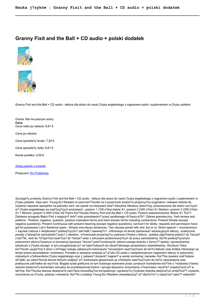Nauka j?zyków : Granny Fixit and the Ball + CD audio + polski dodatek Granny Fixit and the Ball + CD audio + polski dodatek Granny Fixit and the Ball + CD audio - lektura dla dzieci do nauki j?zyka angielskiego z nagraniem audio i suplementem w j?zyku polskim. Ocena: Nie ma jeszcze oceny Cena Cena netto po rabacie: 6,61 € Cena po rabacie Cena sprzeda?y brutto: 7,20 € Cena sprzeda?y netto: 6,61 € Kwota podatku: 0,59 € Zadaj pytanie o produkt Producent: ELI Publishing Szczegó?y produktu Granny Fixit and the Ball + CD audio - lektura dla dzieci do nauki j?zyka angielskiego z nagraniem audio i suplementem w j?zyku polskim. Opis serii: Young ELI Readers to seria ksi??eczek na 4 poziomach trudno?ci proponuj?ca oryginalne i ciekawe historie do czytania napisane specjalnie na potrzeby serii, lub oparte na motywach dzie? klasyków literatury dzieci?cej, przeznaczone dla dzieci ucz?cych si? j?zyka angielskiego na nast?puj?cych poziomach: -poziom 1 (100 s?ów) below A1 -poziom 2 (200 s?ów) A1 Starters -poziom 3 (300 s?ów) A1.1 Movers -poziom 4 (400 s?ów) A2 Flyers Ksi??eczka Granny Fixit and the Ball + CD audio: Poziom zaawansowania: Below A1 Tre??: Zabawne przygody Babci Fixit z magiczn? torb? oraz pozostawion? przez spotkanego ch?opca pi?k?. Zakres gramatyczny: Verb tenses and patterns - Positive, negative, question, positive imperative forms and short answer forms including contractions: Present Simple (except negative questions), Present Continuous with present meaning (except negative questions), can/can’t for ability, requests and permission have got for possession Let’s Sentence types - Simple one-clause sentences, Two clauses joined with and, but or or, Direct speech + noun/pronoun + say/ask Lektura z dedykowan? polskoj?zyczn? zak?adk? zawieraj?c?: -informacje na temat zastosowa? edukacyjnych lektury, -praktyczne porady u?atwiaj?ce samodzieln? prac? z tekstem, -s?owniczek prezentuj?cy wybrane s?ówka z lektury, -polskie obja?nienia polece? do ?wicze? z ksi??ki, -kod do ?ci?gni?cia rozwi?za? do ?wicze? wraz z arkuszem podsumowuj?cym do pracy samodzielnej. Dzi?ki polskoj?zycznym poleceniom sformu?owanym w konwencji typowych ?wicze? podr?cznikowych, lektura oswaja dziecko z formu?? testów i sprawdzianów szkolnych z j?zyka obcego, w tym przygotowuje ju? od najm?odszych do obowi?zkowego sprawdzianu szóstoklasisty. Struktura Tekst ksi??eczki uzupe?nia 5 stron z ró?nego rodzaju zabawnymi kolorowymi ?wiczeniami nawi?zuj?cymi do tre?ci lekturki oraz krótkie informacje na temat autora opowiadania i ilustratora. Ponadto w zestawie znajduje si? p?yta CD audio z zarejestrowanym nagraniem lektury w wykonaniu rodowitych u?ytkowników j?zyka angielskiego oraz z zabawn? piosenk? nagran? w wersji normalnej i karaoke. Ksi??ka zawiera rozk?adane ok?adki, po wewn?trznej stronie których znajduj? si? ilustrowane glosariusze ze s?ówkami nawi?zuj?cymi do tre?ci opowiadania oraz praktyczna zak?adka do wyci?cia. Bogata szata graficzna (w tym ilustracje wykonane przez uznanych ilustratorów ksi??ek o ?wiatowej s?awie) stanowi doskona?y komentarz wizualny do przedstawionej historii i sprzyja lepszemu zrozumieniu s?ownictwa i wyra?e? znajduj?cych si? w tek?cie. Ksi??eczka stanowi doskona?e narz?dzie konsoliduj?ce kompetencje i sprawno?ci j?zykowe dziecka obejmuj?ce umiej?tno?? czytania, rozumienia ze s?uchu, pisania i mówienia. Ksi??ki z kolekcji Young ELI Readers charakteryzuj? si? dba?o?ci? o najwy?sz? jako?? edytorsk? 1 / 2 Nauka j?zyków : Granny Fixit and the Ball + CD audio + polski dodatek oraz starannym i eleganckim wykonaniem. Seria Young ELI Readers opracowana zosta?a w oparciu o kryteria Europejskiego Systemu Opisu Kszta?cenia J?zykowego (Common European Framework of Reference for Languages). Autor: Jane Cadwallader Ilustracje: Gustavo Mazali Ilo?? stron: 32 Format: 15x21cm ISBN: 9788853604217 ISBN:9788853604217 Wydawnictwo:ELI PUBLISHING (ELI European Language Institute) 2 / 2 Powered by TCPDF (www.tcpdf.org)