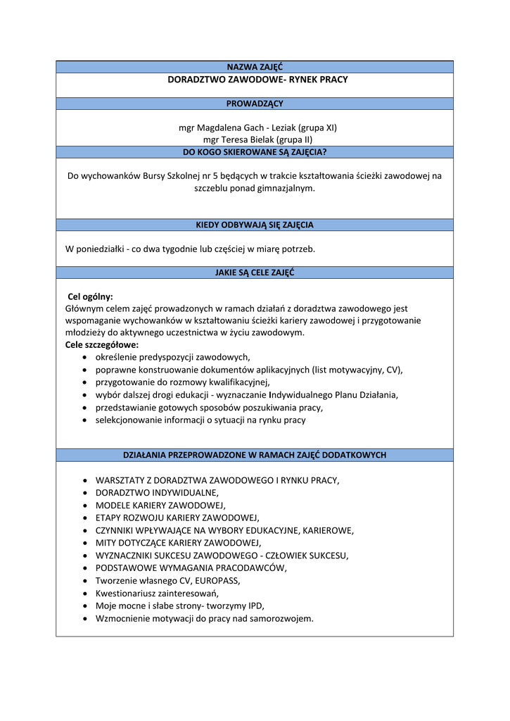 NAZWA ZAJĘĆ DORADZTWO ZAWODOWE- RYNEK PRACY PROWADZĄCY mgr Magdalena Gach - Leziak (grupa XI) mgr Teresa Bielak (grupa II) DO KOGO SKIEROWANE SĄ ZAJĘCIA? Do wychowanków Bursy Szkolnej nr 5 będących w trakcie kształtowania ścieżki zawodowej na szczeblu ponad gimnazjalnym. KIEDY ODBYWAJĄ SIĘ ZAJĘCIA W poniedziałki - co dwa tygodnie lub częściej w miarę potrzeb. JAKIE SĄ CELE ZAJĘĆ Cel ogólny: Głównym celem zajęć prowadzonych w ramach działań z doradztwa zawodowego jest wspomaganie wychowanków w kształtowaniu ścieżki kariery zawodowej i przygotowanie młodzieży do aktywnego uczestnictwa w życiu zawodowym. Cele szczegółowe: określenie predyspozycji zawodowych, poprawne konstruowanie dokumentów aplikacyjnych (list motywacyjny, CV), przygotowanie do rozmowy kwalifikacyjnej, wybór dalszej drogi edukacji - wyznaczanie Indywidualnego Planu Działania, przedstawianie gotowych sposobów poszukiwania pracy, selekcjonowanie informacji o sytuacji na rynku pracy DZIAŁANIA PRZEPROWADZONE W RAMACH ZAJĘĆ DODATKOWYCH WARSZTATY Z DORADZTWA ZAWODOWEGO I RYNKU PRACY, DORADZTWO INDYWIDUALNE, MODELE KARIERY ZAWODOWEJ, ETAPY ROZWOJU KARIERY ZAWODOWEJ, CZYNNIKI WPŁYWAJĄCE NA WYBORY EDUKACYJNE, KARIEROWE, MITY DOTYCZĄCE KARIERY ZAWODOWEJ, WYZNACZNIKI SUKCESU ZAWODOWEGO - CZŁOWIEK SUKCESU, PODSTAWOWE WYMAGANIA PRACODAWCÓW, Tworzenie własnego CV, EUROPASS, Kwestionariusz zainteresowań, Moje mocne i słabe strony- tworzymy IPD, Wzmocnienie motywacji do pracy nad samorozwojem.