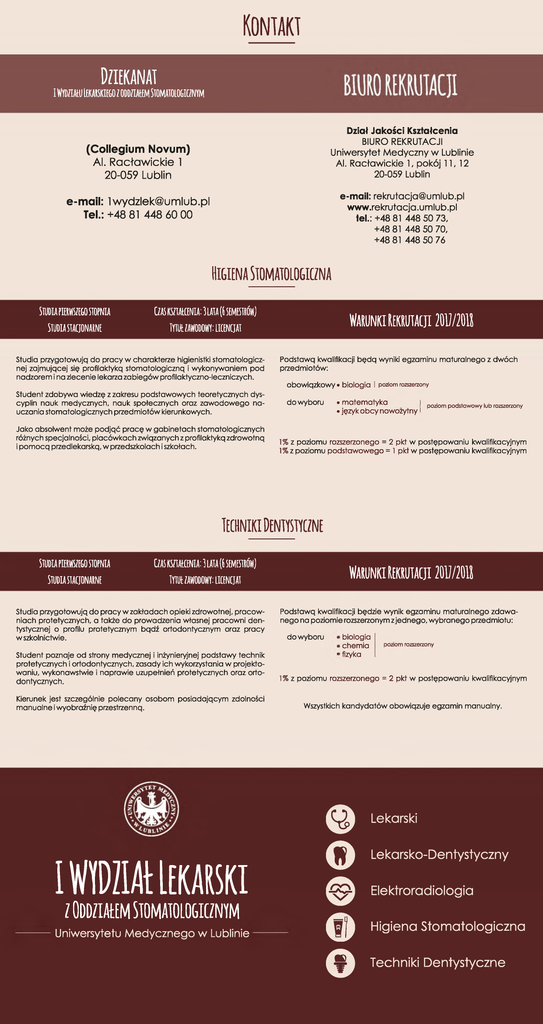 Ko n t a k t DZIEKANAT i Wydziału Lekarskiego z oddziałem Stomatologicznym Dział Jakości Kształcenia BIURO REKRUTACJI Uniwersytet Medyczny w Lublinie AL Racławickie 1, pokój 11,12 20-059 Lublin (Collegium Nóvum) Al. Racławickie 1 20-059 Lublin e-maii: [email protected] www.rekrutacja.umlub.pl tel.: +48 81 448 50 73, +48 81 448 50 70, +48 81 448 50 76 e-mail: [email protected] Tel.: +48 81 448 60 00 Higiena Stomatologiczna STUDIA PIERWSZEGO STOPNIA SllfDIASTACJONARNE CZAS KSZTAŁCENIA: 3 LATA (6 SEMESTRÓW) . « • ! « nmi/nmo WAKUNKÜEKMCJI mim . Studia przygotowują do pracy w charakterze higienistki stomatologicz nej zajmującej się profilaktyką stom atologiczną i wykonywaniem pod nadzorem i na zlecenie lekarza zabiegów profilaktyczno-leczniczych. Podstawą kwalifikacji b ę d ą wyniki egzaminu maturalnego z dw óch przedmiotów: obow iązkow y* biologia Student zdobywa wiedzę z zakresu podstaw owych teoretycznych dys cyplin nauk medycznych, nauk społecznych oraz zaw odow ego na uczania stom atologicznych przedm iotów kierunkowych. Jako absolwent może po djąć pracę w gabinetach stomatologicznych różnych specjalności, placów kach związanych z profilaktyką zdrowotną i p o m ocą przedlekarską, w przedszkolach i szkołach. do wyboru I poziom rozszerzony .m a te m a ty k a I poziom podstQwowy lub rozszerzony • język o b cy nowożytny l 1% z poziomu rozszerzonego = 2 pkt w postępowaniu kwalifikacyjnym 1% z poziomu podstaw ow ego = 1 pkt w postępowaniu kwalifikacyjnym techniki dentystyczne STUDIA PIERWSZEGOSTOPNIA CZAS KSZTAŁCENIA: 3 LATA (6 SEMESTRÓW) STUDIA STACJONARNE TYTUt ZAWODOWY: LICENCJAT Studia przygotowują do pracy w zakładach opieki zdrowotnej, pracow niach protetycznych, a także d o prowadzenia własnej pracowni den tystycznej o profilu protetycznym bądź ortodontycznym oraz pracy wszkolnictwie. Wa r u n k i rek r u ta c ji 20U/20U Podstawą kwalifikacji będzie wynik egzaminu m aturalnego zdaw a nego na poziomie rozszerzonym zjednego, w ybranego przedmiotu: do wyboru ■biologia > chem ia ■fizyka poziom rozszerzony Student poznaje od strony medycznej i inżynieryjnej podstawy technik protetycznych i ortodontycznych, zasady ich wykorzystania w projekto waniu, wykonawstwie i naprawie uzupełnień protetycznych oraz orto dontycznych. 1% z poziomu rozszerzonego = 2 pkt w postępowaniu kwalifikacyjnym Kierunek jest szczególnie polecany osobom posiadającym zdolności manualne i wyobraźnię przestrzenną. Wszystkich kandydatów obowiązuje egzamin manualny. I WlDflAt Lekarski z Oddziałem stomatologicznym Uniwersytetu M edycznego w Lublinie © o © © © Lekarski Lekarsko-Dentystyczny Elektroradiologia Higiena Stomatologiczna Techniki Dentystyczne LEKARSKI JEDNOLITE STUDIA MAGISTERSKIE Studia stacjonarne i niestacjonarne CZAS KSZTAECENIA: 6LAT(12 SEMESTRÓW) tytuł zawodowy: lekarz Studia przygotowują do profesjonalnej diagnostyki laboratoryjnej zgod nie z w ym ogam i dobrej praktyki laboratoryjnej oraz zasadami etyki za w odow ej. Student zdobywa podstaw ow ą wiedzę z zakresu nauk me dycznych, biologicznych, biochem icznych i społecznych oraz zaaw an sowaną w zakresie m edycyny laboratoryjnej. Nabywa praktycznych umiejętności niezbędnych wzawodzie diagnosty laboratoryjnego. W A łllW C T lF im iT A rT T 9M 7/ 9I M W ARUNKI l i m IA U I m l I m Podstawą kwalifikacji b ę d ą wyniki egzaminu m aturalnego z trzech przedmiotów: obowiązkowy • biologia • matem atyka do wyboru ' Jako absolwent może podjąć pracę m.in. w medycznych laboratoriach diagnostycznych, zakładach opieki zdrowotnej prow adzących b a dania kliniczne, jednostkach kontrolno-pomiarowych i laboratoriach z dziedziny biologii i genetyki medycznej, higieny ogólnej, kontroli i b a dania żywności oraz ochrony środowiska, urzędach i instytucjach pań stwowych i samorządowych działających w dziedzinie biologii medycz nej i ochrony zdrowia. • chem ia _ . • fiz v k n I | | poziom rozszerzony Pozlom podstaw owy lub rozszerzony poziom rozszerzony 1% z poziomu rozszerzonego = 2 pkt w postępowaniu kwalifikacyjnym 1%z poziomu podstaw owego = 1 pkt w postępowaniu kwalifikacyjnym lE K M O - D E N T W ™ Jednolite studia magisterskie Czas kształcenia: ^ lat (10 semestrów) Studia stacjonarne i niestacjonarne tytuł zawodowy: Lekarz dentysta Studia przygotowują do sprawowania profesjonalnej opieki nad p a cjentem , pracy w placów kach służby zdrowia, instytutach naukowobadaw czych oraz prowadzenia praktyki stomatologicznej. Student zdobywa teoretyczne i praktyczne umiejętności w zakresie profilaktyki i leczenia niezbędne do wykonywania zawodu lekarza dentysty. Uzyskuje w iedzę na te m a t przeprowadzania diagnostyki najczęstszych chorób i oceny stanu pacjenta, a także w zakresie prom ocji zdrowia i edukacji prozdrowotnej. War u n ki iiekrutacji 20U/2MJ Podstawą kwalifikacji b ę d ą wyniki egzaminu m aturalnego z trzech przedmiotów: obowiązkowy •1 biologia ' matem atyka do wyboru ' chemia 1 fizyka poziom rozszerzony poziom podstaw owy lub rozszerzony poziom rozszerzony 1% z poziomu rozszerzonego = 2 pkt w postępowaniu kwalifikacyjnym 1%z poziomu podstaw ow ego = 1 pkt w postępowaniu kwalifikacyjnym ELEKTRORADIOLO&IA i ° STUDIAPIERWSZE&O STOPNIA CZAS KSZTAŁCENIA: 3 LATA (6 SEMESTRÓW) Studia stacjonarne TYTUŁ ZAWODOWY: LICENCJAT Studia przygotowują d o realizacji procedur m edycznych zarówno diagnostycznych, jak i terapeutycznych z zastosowaniem m etod i te ch nik radiologicznych, technik z obszaru diagnostyki elektromedycznej oraz m edycyny nuklearnej. Student zdobywa wiedzę ogólną z zakresu nauk medycznych i fizycz nych oraz wiedzę szczegółową z zakresu elektroradiologii. Uczy się w y konywania czynności diagnostycznych i terapeutycznych związanych z obsługą aparatury radiologicznej, radioterapeutycznej, m edycyny nuklearnej i aparatury elektromedycznej. WAKUNKI REKRUTACJI 2011/2011 P odstaw ą kw a lifika cji b ę d zie 