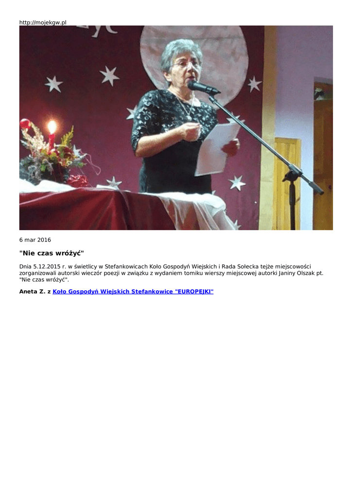 http://mojekgw.pl 6 mar 2016 "Nie czas wróżyć" Dnia 5.12.2015 r. w świetlicy w Stefankowicach Koło Gospodyń Wiejskich i Rada Sołecka tejże miejscowości zorganizowali autorski wieczór poezji w związku z wydaniem tomiku wierszy miejscowej autorki Janiny Olszak pt. "Nie czas wróżyć". Aneta Z. z Koło Gospodyń Wiejskich Stefankowice "EUROPEJKI"