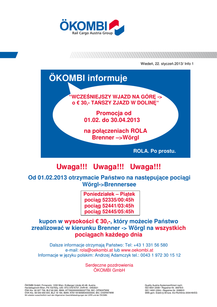 Wiedeń, 22. styczeń.2013/ Info 1 ÖKOMBI informuje Innovativer Sattelauflieger Umschlag “WCZEŚNIEJSZY WJAZD NA GÓRĘ -> o € 30,- TAŃSZY ZJAZD W DOLINĘ“ Promocja od 01.02. do 30.04.2013 na połączeniach ROLA Brenner –>Wörgl ROLA. Po prostu. Uwaga!!! Uwaga!!! Uwaga!!! Od 01.02.2013 otrzymacie Państwo na następujące pociągi Wörgl->Brennersee Poniedziałek – Piątek pociąg 52335/00:45h pociąg 52441/03:45h pociąg 52445/05:45h kupon w wysokości € 30,-, który moŜecie Państwo zrealizować w kierunku Brenner -> Wörgl na wszystkich pociągach kaŜdego dnia Dalsze informacje otrzymają Państwo: Tel: +43 1 331 56 580 e-mail: [email protected] lub www.oekombi.at Informacje w języku polskim: Andrzej Adamczyk tel.: 0043 1 972 30 15 12 Serdeczne pozdrowienia ÖKOMBI GmbH ÖKOMBI GmbH, Firmensitz: 1030 Wien, Erdberger Lände 40-48, Austria Handelsgericht Wien, FN 102763y, UID: ATU 37675707, DVR-Nr.: 0453021 PSK Kto. 90 027 756, BLZ 60 000, IBAN: AT726000000090027756, BIC: OPSKATWW ÖVK Kto. 58 540 000 004, BLZ 18 190, IBAN: AT811819058540000004, BIC: OVERATWW Wir arbeiten ausschließlich nach den Allgemeinen Geschäftsbedingungen der UIRR und der ÖKOMBI. Quality Austria-Systemzertifiziert nach: ISO 9001:2008 • Registrier-Nr. 06976/0 ISO 14001:2004 • Registrier-Nr. 00880/0 SMS gem. EisbG § 39 bzw. EU-Richtlinie 2004/49/EG