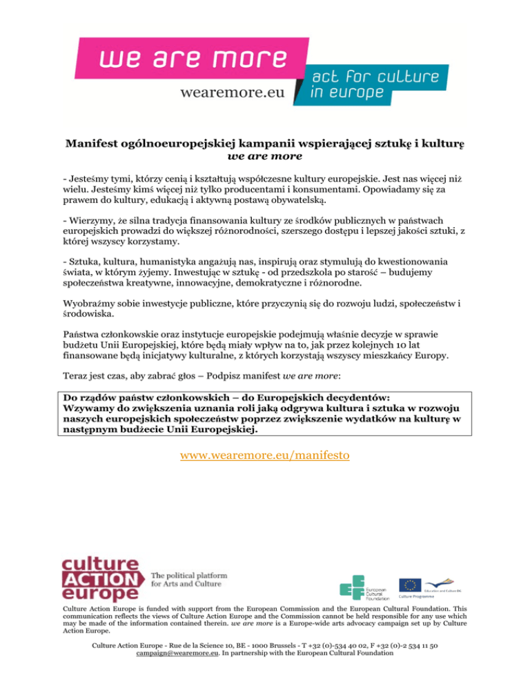 Manifest ogólnoeuropejskiej kampanii wspierającej sztukę i kulturę we are more - Jesteśmy tymi, którzy cenią i kształtują współczesne kultury europejskie. Jest nas więcej niż wielu. Jesteśmy kimś więcej niż tylko producentami i konsumentami. Opowiadamy się za prawem do kultury, edukacją i aktywną postawą obywatelską. - Wierzymy, że silna tradycja finansowania kultury ze środków publicznych w państwach europejskich prowadzi do większej różnorodności, szerszego dostępu i lepszej jakości sztuki, z której wszyscy korzystamy. - Sztuka, kultura, humanistyka angażują nas, inspirują oraz stymulują do kwestionowania świata, w którym żyjemy. Inwestując w sztukę - od przedszkola po starość – budujemy społeczeństwa kreatywne, innowacyjne, demokratyczne i różnorodne. Wyobraźmy sobie inwestycje publiczne, które przyczynią się do rozwoju ludzi, społeczeństw i środowiska. Państwa członkowskie oraz instytucje europejskie podejmują właśnie decyzje w sprawie budżetu Unii Europejskiej, które będą miały wpływ na to, jak przez kolejnych 10 lat finansowane będą inicjatywy kulturalne, z których korzystają wszyscy mieszkańcy Europy. Teraz jest czas, aby zabrać głos – Podpisz manifest we are more: Do rządów państw członkowskich – do Europejskich decydentów: Wzywamy do zwiększenia uznania roli jaką odgrywa kultura i sztuka w rozwoju naszych europejskich społeczeństw poprzez zwiększenie wydatków na kulturę w następnym budżecie Unii Europejskiej. www.wearemore.eu/manifesto Culture Action Europe is funded with support from the European Commission and the European Cultural Foundation. This communication reflects the views of Culture Action Europe and the Commission cannot be held responsible for any use which may be made of the information contained therein. we are more is a Europe-wide arts advocacy campaign set up by Culture Action Europe. Culture Action Europe - Rue de la Science 10, BE - 1000 Brussels - T +32 (0)-534 40 02, F +32 (0)-2 534 11 50 [email protected]. In partnership with the European Cultural Foundation