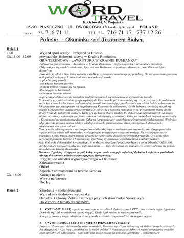 05-500 PIASECZNO TEL/FAX 22- 716 K. Orłowski, V. Wojeńska UL. DWORCOWA 18 lokal użytkowy 4 71 11 TEL 22- POLAND 716 71 17 , 737 12 26 Polesie - Okuninka nad Jeziorem Białym Dzień 1 7.00 Ok.11.00- 12.00 Wyjazd spod szkoły. Przejazd na Polesie. przyjazd do Hołowni wizyta w Krainie Rumianku. GRA TERENOWA – „AWANTURA W KRAINIE RUMIANKU” Fabularna gra terenowa „ Awantura w Krainie Rumianku” to gra kupiecka o strukturze centralnej. Odbywająca się wśród zabudowań, łąk i pól wsi Hołowno; wspaniała zabawa zarówno dla dzieci jak i dorosłych. Prowadzi ją Mistrz Gry, który udziela wszelkich wyjaśnień i monitoruje jej przebieg. On też opowiada graczom o kłopotach nękających mieszkańców rumiankowej wioski: -z płotów giną garnki, -coś plącze koniom grzywy, -niszczy płótno roszące się na łąkach, -tłucze jajka w kurnikach, -zakwasza krowom mleko co powoduje kłótnie wśród sąsiadów podejrzewających się wzajemnie o wyrządzone szkody. Uczestnicy gry podzieleni na grupy wędrują do Karczmarki gdzie dowiadują się, że przyczyną tych problemów może być Leśne Licho, które znalazło tajny sposób umożliwiający przebywanie mu wśród ludzi i szkodzenie im. Ich zadaniem jest wykupienie od niepiśmiennej Karczmarki dokumentu, dzięki któremu dowiedzą się jak się owego Licha pozbyć. Każda grupa otrzymuje: sakiewkę z kilkoma rumiankowymi pieniążkami, mapę dzięki której trafia do kolejnych postaci i kartę gry na której zbiera punkty. Po dotarciu do wyznaczonych na mapie miejsc uczestnicy wykonują specjalne zadania i zdobywają przedmioty, które po zaciekłych targach wymieniają u Karczmarki na rumiankowe dukaty. Zabawa i przygoda jest uzupełniona elementami edukacyjnymi. Wędrując od postaci do postaci można zdobyć wiedzę o ziołach, garncarstwie, dawnych zajęciach domowych , tajemnicach warzenia soli etc. Należy także zdać egzamin u surowego Pustelnika ukrytego w malowniczym wąwozie, do którego prowadzi wąska miedza wśród pól rumianku i niebezpieczne przejście po wiszącym moście. Na trasie pojawia się znienacka Leśny Dziad, który zwodzi graczy, co wprowadza dodatkowy element przygody. Gra uczy także negocjacji podczas targów z Karczmarką, sportowej rywalizacji, współdziałania i autoprezentacji. Jaka jest treść dokumentu? Co znajduje się w skrzyni strzeżonej przez przekupne Psotne Skrzaty? Gdzie jest ukryty kamień niezgody i jakie jest jego znaczenie…. . tego dowiedzą się śmiałkowie, którzy odważą się pomóc mieszkańcom Krainy Rumianku. Gra trwa 2 godziny. Wygrywa zespół, który w tym czasie utarguje najwięcej dukatów i wejdzie w posiadanie tajnego dokumentu pilnie strzeżonego przez Karczmarkę. Ok. 18.00 Dzień 2 Przyjazd do ośrodka wypoczynkowego w Okunince Zakwaterowanie Obiad Zajęcia z animatorami na terenie ośrodka Kolacja na ciepło Wizyta na basenie Nocleg. Śniadanie + suchy prowiant Wyjazd na całodniowa wycieczkę . Ośrodek Ochrony Żółwia Błotnego przy Poleskim Parku Narodowym Do wyboru 2 tematy warsztatów: 1. CZYTAMY MAPĘ zajęcia prowadzone w ośrodkach dydaktycznych PPN, czas trwania zajęć 1 godzina, Dowiesz się: Jak prawidłowo czytać mapę?, Kiedy i jak można ja wykorzystywać?, Sam przy pomocy mapy odnajdziesz swój punkt w terenie i zaprowadzisz do niego kolegów. 2. CZY BIEDRONKI LECĄ DO NIEBA? POZNAJEMY OWADY Poznasz i Zobaczysz: Różnorodny świat owadów?, Dowiesz się: Czym różnią się od siebie i innych zwierząt?, Jak długo żyją?, Czy lecą „do nieba po kawałek chleba”? Nauczysz się: Różnych metod oznaczania owadów oraz sposoby ich odławiania. Sam odłowisz swoje owady za pomocą „czerpaka”, oznaczysz je z wykorzystaniem lup powiększających, binokularów czy mikroskopów. 3. ZANIM KOPNIESZ CZY RZUCISZ... – POZNAJEMY SKAŁY Dowiesz się: Jak dzielimy skały?, Że piasek to też skała. Nauczysz się rozpoznawać skały. Sam określisz jaka to skała. 4. CZYJ TO ŚLAD? ROZRÓŻNIAMY ŚLADY ZOSTAWIONE PRZEZ ZWIERZĘTA Dowiesz się: Jakie tropy zostawiają zwierzęta?, Czy każdy ślad jest tropem?, Poznasz: jakie inne ślady pozostawiają zwierzęta?, Nauczysz się rozpoznawać tropy i tropić zwierzęta. Sam wykonasz odlew gipsowy tropu wybranego zwierzęcia i poprowadzisz kolegów po tropach. 5. PTASI ZAKĄTEK Dowiesz się: Jakie ptaki żyją na Polesiu?, Gdzie możemy je spotkać?, Jakie ślady zostawiają po sobie?, Poznasz i Zobaczysz: Jaki ptak na jakim jaju siedzi i w jakim gnieździe nocuje?, Sam wykonasz ptaka zabawkę z i zbudujesz budkę dla niego. 6. MALI MIESZKAŃCY ŁĄKI Poznasz i Zobaczysz: Jakie zwierzęta można spotkać na łąkach i trawnikach?, Nauczysz się: Jak je obserwować?, Dowiesz się: Gdzie ma przód a gdzie tył?, Czy to chodzi, lata czy pełza?, Zrozumiesz: skąd się wzięło na „naszym” trawniku? Sam złapiesz swojego zwierzaka i oznaczysz za pomocą lupki powiększającej. 7. W WARSZTACIE WYOBRAŹNI – IMPRESJE, SUPER ZWIERZAKI, NIEZWYKŁE ROŚLINY – ZAJĘCIA Z KOLOGRAFII Dowiesz się: Co to jest kolografia?, Zobaczysz: Jak wykorzystując stare szmatki, trochę kleju i farby można zrobić obraz. Sam wykonasz swój obraz wyobraźni. 8 ŁOŚ SUPERKTOŚ Dowiesz się: Czy łoś łopatą „kopie”?, Czy na bagnie mieszka sobie?, Zobaczysz: Jak łoś chodzi i czy w błocie brudzi nogi?, Sam śladami łosia krocząc odnajdziesz poroże i „wdepniesz” w błoto. 9. BLISKIE SPOTKANIE Z ŻÓŁWIEM Dowiesz się: Co to jest żółw błotny?, W jakim środowisku żyje i gdzie można go spotkać?, Jak funkcjonuje ośrodek czynnej ochrony żółwia błotnego?, Zobaczysz: żółwie błotne w ośrodku. Zrozumiesz: dlaczego tu są?, i dlaczego trzeba je chronić?, Sam poznasz życie żółwia w ośrodku, pomożesz pracownikowi Parku pomierzyć i zważyć żółwie aby dowiedzieć się „czy mały żółw już przytył?” Po zajęciach warsztatowych spacer ścieżką przyrodniczą np. „Dąb Do