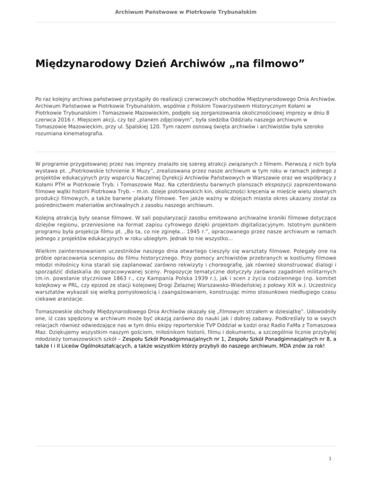 Archiwum Państwowe w Piotrkowie Trybunalskim Międzynarodowy Dzień Archiwów „na filmowo” Po raz kolejny archiwa państwowe przystąpiły do realizacji czerwcowych obchodów Międzynarodowego Dnia Archiwów. Archiwum Państwowe w Piotrkowie Trybunalskim, wspólnie z Polskim Towarzystwem Historycznym Kołami w Piotrkowie Trybunalskim i Tomaszowie Mazowieckim, podjęło się zorganizowania okolicznościowej imprezy w dniu 8 czerwca 2016 r. Miejscem akcji, czy też „planem zdjęciowym”, była siedziba Oddziału naszego archiwum w Tomaszowie Mazowieckim, przy ul. Spalskiej 120. Tym razem osnową święta archiwów i archiwistów była szeroko rozumiana kinematografia. W programie przygotowanej przez nas imprezy znalazło się szereg atrakcji związanych z filmem. Pierwszą z nich była wystawa pt. „Piotrkowskie tchnienie X Muzy”, zrealizowana przez nasze archiwum w tym roku w ramach jednego z projektów edukacyjnych przy wsparciu Naczelnej Dyrekcji Archiwów Państwowych w Warszawie oraz we współpracy z Kołami PTH w Piotrkowie Tryb. i Tomaszowie Maz. Na czterdziestu barwnych planszach ekspozycji zaprezentowano filmowe wątki historii Piotrkowa Tryb. – m.in. dzieje piotrkowskich kin, okoliczności kręcenia w mieście wielu sławnych produkcji filmowych, a także barwne plakaty filmowe. Ten jakże ważny w dziejach miasta okres ukazany został za pośrednictwem materiałów archiwalnych z zasobu naszego archiwum. Kolejną atrakcją były seanse filmowe. W sali popularyzacji zasobu emitowano archiwalne kroniki filmowe dotyczące dziejów regionu, przeniesione na format zapisu cyfrowego dzięki projektom digitalizacyjnym. Istotnym punktem programu była projekcja filmu pt. „Bo ta, co nie zginęła… 1945 r.”, opracowanego przez nasze archiwum w ramach jednego z projektów edukacyjnych w roku ubiegłym. Jednak to nie wszystko… Wielkim zainteresowaniem uczestników naszego dnia otwartego cieszyły się warsztaty filmowe. Polegały one na próbie opracowania scenopisu do filmu historycznego. Przy pomocy archiwistów przebranych w kostiumy filmowe młodzi miłośnicy kina starali się zaplanować zarówno rekwizyty i choreografię, jak również skonstruować dialogi i sporządzić didaskalia do opracowywanej sceny. Propozycje tematyczne dotyczyły zarówno zagadnień militarnych (m.in. powstanie styczniowe 1863 r., czy Kampania Polska 1939 r.), jak i scen z życia codziennego (np. komitet kolejkowy w PRL, czy epizod ze stacji kolejowej Drogi Żelaznej Warszawsko-Wiedeńskiej z połowy XIX w.). Uczestnicy warsztatów wykazali się wielką pomysłowością i zaangażowaniem, konstruując mimo stosunkowo niedługiego czasu ciekawe aranżacje. Tomaszowskie obchody Międzynarodowego Dnia Archiwów okazały się „filmowym strzałem w dziesiątkę”. Udowodniły one, iż czas spędzony w archiwum może być okazją zarówno do nauki jak i dobrej zabawy. Podkreślały to w swych relacjach również odwiedzające nas w tym dniu ekipy reporterskie TVP Oddział w Łodzi oraz Radio FaMa z Tomaszowa Maz. Dziękujemy wszystkim naszym gościom, miłośnikom historii, filmu i dokumentu, a szczególnie licznie przybyłej młodzieży tomaszowskich szkół – Zespołu Szkół Ponadgimnazjalnych nr 1, Zespołu Szkół Ponadgimnazjalnych nr 8, a także I i II Liceów Ogólnokształcących, a także wszystkim którzy przybyli do naszego archiwum. MDA znów za rok! 1