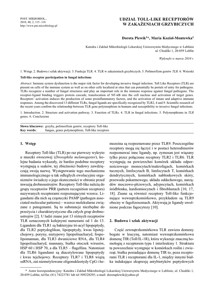 UDZIA£ TOLL-LIKE RECEPTORÓW W ZAKA¯ENIACH GRZYBICZYCH POST. MIKROBIOL., 2010, 40, 2, 115118 http://www.pm.microbiology.pl Dorota Plewik1*, Maria Kozio³-Montewka1 Katedra i Zak³ad Mikrobiologii Lekarskiej Uniwersytetu Medycznego w Lublinie ul. Chodki 1, 20-059 Lublin Wp³ynê³o w marcu 2010 r. 1. Wstêp. 2. Budowa i szlak aktywacji. 3. Funkcja TLR. 4. TLR w zaka¿eniach grzybiczych. 5. Polimorfizm genów TLR. 6. Wnioski Toll-like receptor participation in fungal infections Abstract: Immune system dysfunction is the major risk factor for developing invasive fungal infection. Toll Like Receptors (TLR) are present on cells of the immune system as well as on other cells localized at sites that can potentially be portals of entry for pathogens. TLRs recognize a number of fungal structures and play an important role in the immune response against fungal pathogens. The receptor-ligand binding triggers protein cascade, translocation of NF-6B into the cell nucleus and activation of target genes. Receptors activation induces the production of some proinflammatory factors, and the activation of innate and adaptive immune responses. Among the discovered 13 different TLRs, fungal ligands are specifically recognized by TLR2, 4 and 9. Scientific research of the recent years confirm the relationship between TLR gene polymorphism in humans and susceptibility to invasive fungal infections. 1. Introduction. 2. Structure and activation pathway. 3. Function of TLRs. 4. TLR in fungal infections. 5. Polymorphisms in TLR genes. 6. Conclusions S³owa kluczowe: grzyby, polimorfizm genów, receptory Toll-like Key words: fungus, genes polymorphism, Toll-like receptors 1. Wstêp Receptory Toll-like (TLR) po raz pierwszy wykryto u muszki owocowej (Drosophila melanogaster), kolejne badania wykaza³y, ¿e bardzo podobne receptory wystêpuj¹ u ssaków, tej zbie¿noci budowy zawdziêczaj¹ swoj¹ nazwê. Wystêpowanie tego mechanizmu immunologicznego u tak odleg³ych ewolucyjnie organizmów wiadczy o jego skutecznoci w obronie przed inwazj¹ drobnoustrojów. Receptory Toll-like nale¿¹ do grupy receptorów PRR (pattern recognition receptors) nazywanych receptorami rozpoznaj¹cymi wzorce. Ligandami dla nich s¹ cz¹steczki PAMP (pathogen associated molecular patterns) wzorce molekularne zwi¹zane z patogenami. S¹ to substancje niezbêdne do prze¿ycia i charakterystyczne dla ca³ych grup drobnoustrojów [2]. U ludzi znane jest 13 ró¿nych receptorów TLR oznaczonych kolejnymi numerami od 1 do 13. Ligandem dla TLR1 s¹ bakteryjne tri-acyl lipopeptydy, dla TLR2 peptydoglikan, lipopeptydy, kwas lipotejchojowy, poryny, nietypowy lipopolisacharyd, fospolipomannan, dla TLR3 dwuniciowe RNA, dla TLR4 lipopolisacharyd, mannany, bia³ka otoczek wirusów, HSP 60 i HSP 70, a dla TLR5 flagellina. Natomiast dla TLR6 ligandami s¹ diacetylowane lipopeptydy i kwas tejchojowy. Receptory TLR7 i TLR8 wi¹¿¹ ssRNA, za niemetylowane oligonukleotydy CpG i he- mozoina s¹ rozpoznawane przez TLR9. Poszczególne receptory mog¹ siê ³¹czyæ i w postaci heterodimerów rozpoznawaæ inne ligandy, np. zymosan jest wi¹zany tylko przez po³¹czone receptory TLR2 i TLR6. TLR wystêpuj¹ na powierzchni komórek uk³adu odpornociowego monocytach/makrofagach, komórkach tucznych, limfocytach B, limfocytach T, komórkach dendrytycznych, komórkach nab³onkowych skóry, przewodu pokarmowego, uk³adu oddechowego, narz¹dów moczowo-p³ciowych, adypocytach, komórkach ródb³onka, kardiomiocytach i fibroblastach [10, 17, 18]. Znane s¹ równie¿ receptory Toll-like funkcjonuj¹ce wewn¹trzkomórkowo, przyk³adem s¹ TLR9 obecny w fagolizosomach. Aktywuj¹ je ligandy uwolnione podczas fagocytozy [10]. 2. Budowa i szlak aktywacji Czêæ zewn¹trzkomórkowa TLR zawiera domeny bogate w leucynê, natomiast wewn¹trzkomórkowa domenê TIR (Toll/IL-1R), która wykazuje znaczn¹ homologiê z receptorem typu 1 interleukiny 1. Struktura ta powszechnie wystêpuje w komórkach rolin i zwierz¹t; bia³ka posiadaj¹ce domenê TIR to, poza receptorami TLR i receptorami dla IL-1, miêdzy innymi bia³ka indukuj¹ce ekspresjê antybiotyków peptydowych * Autor korespondencyjny: Katedra i Zak³ad Mikrobiologii Lekarskiej Uniwersytetu Medycznego w Lublinie, ul. Chodki 1, 20-059 Lublin; tel/fax (81) 74223781 lub tel 509228295; e-mail: [email protected] 116 PLEWIK DOROTA, KOZIO£-MONTEWKA MARIA u lnu, tytoniu i muszek owocowych. Zwi¹zanie ligandu z receptorem TLR uruchamia wewn¹trz komórki kaskadê bia³ek, nastêpnie przy³¹czanie i aktywacja kolejnych elementów szlaku. Sygna³ z aktywowanego TLR jest przekazywany przez kompleksy bia³kowe. Pierwszy kompleks zawieraj¹cy aktywowany TLR, moleku³ê ³¹cz¹c¹ MyD88 (myeloid differentiation primary response) i kinazê IRAK (kinaza zwi¹zana z receptorem interleukiny), gromadzi siê wokó³ receptora w odpowiedzi na sygna³. Ten kompleks aktywuje kolejny kompleks, nastêpuje fosforylacja, ubikwitynacja i degradacja bia³ka inhibitorowego I6B. Uwolniony NF-6B przemieszcza siê do j¹dra komórkowego i aktywuje docelowe geny. Koduj¹ one cytokiny prozapalne, chemokiny, receptory immunologiczne, cz¹steczki adhezyjne zwi¹zane z powierzchni¹ komórki. Mediatory zapalne pobudzaj¹ drugi szlak sygna³owy, który zwrotnie aktywuje NF-6B [1, 15]. 3. Funkcja TLR Receptory TLR znajduj¹ siê miêdzy innymi na powierzchni komórek nab³onkowych dróg oddechowych i jelit oraz komórkach ródb³onka, dziêki takiej lokalizacji drobnoustroje mog¹ byæ rozpoznawane ju¿ we wrotach zaka¿enia. Aktywowane komórki nab³onka wydzielaj¹ cytokiny, chemokiny i defensyny, dziêki czemu ju¿ na tym etapie zaka¿enie mo¿e zostaæ powstrzymane. Jeli komórki nab³onka nie powstrzymaj¹ inwazji drobnoustrojów, walkê z nimi podejmuj¹ komórki uk³adu odpornociowego [10] Czynniki wydzielane przez komórki nab³onka przyci¹gaj¹ i wstêpnie aktywuj¹ leukocyty. Monocyty/makrofagi posiadaj¹ wszystkie znane receptory TLR poza TLR3. Zw