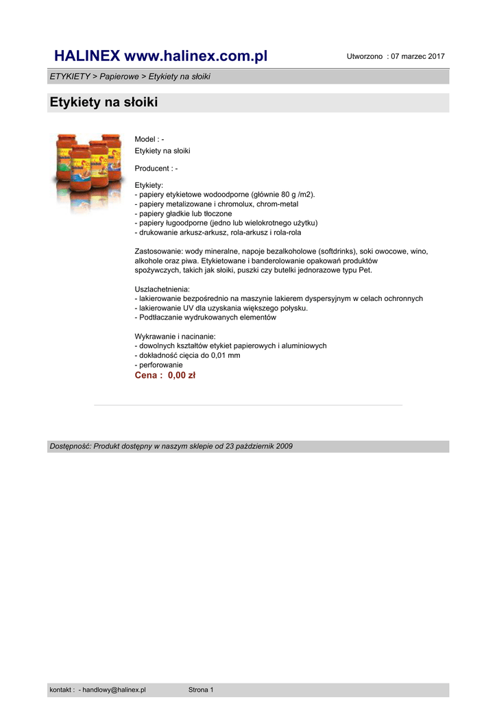 HALINEX www.halinex.com.pl Utworzono : 07 marzec 2017 ETYKIETY > Papierowe > Etykiety na słoiki Etykiety na słoiki Model : Etykiety na słoiki Producent : Etykiety: - papiery etykietowe wodoodporne (głównie 80 g /m2). - papiery metalizowane i chromolux, chrom-metal - papiery gładkie lub tłoczone - papiery ługoodporne (jedno lub wielokrotnego użytku) - drukowanie arkusz-arkusz, rola-arkusz i rola-rola Zastosowanie: wody mineralne, napoje bezalkoholowe (softdrinks), soki owocowe, wino, alkohole oraz piwa. Etykietowane i banderolowanie opakowań produktów spożywczych, takich jak słoiki, puszki czy butelki jednorazowe typu Pet. Uszlachetnienia: - lakierowanie bezpośrednio na maszynie lakierem dyspersyjnym w celach ochronnych - lakierowanie UV dla uzyskania większego połysku. - Podtłaczanie wydrukowanych elementów Wykrawanie i nacinanie: - dowolnych kształtów etykiet papierowych i aluminiowych - dokładność cięcia do 0,01 mm - perforowanie Cena : 0,00 zł Dostępność: Produkt dostępny w naszym sklepie od 23 październik 2009 kontakt : - [email protected] Strona 1
