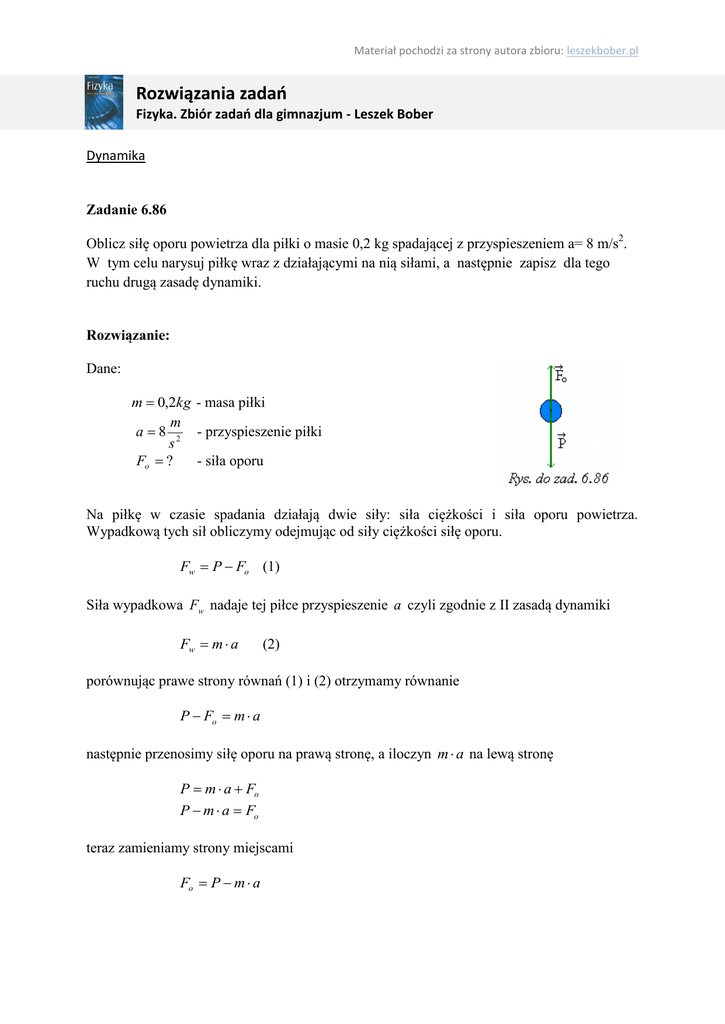 Materiał pochodzi za strony autora zbioru: leszekbober.pl Rozwiązania zadań Fizyka. Zbiór zadań dla gimnazjum - Leszek Bober Dynamika Zadanie 6.86 Oblicz siłę oporu powietrza dla piłki o masie 0,2 kg spadającej z przyspieszeniem a= 8 m/s2. W tym celu narysuj piłkę wraz z działającymi na nią siłami, a następnie zapisz dla tego ruchu drugą zasadę dynamiki. Rozwiązanie: Dane: m 0,2kg - masa piłki m a 8 2 - przyspieszenie piłki s - siła oporu Fo ? Na piłkę w czasie spadania działają dwie siły: siła ciężkości i siła oporu powietrza. Wypadkową tych sił obliczymy odejmując od siły ciężkości siłę oporu. Fw P Fo (1) Siła wypadkowa Fw nadaje tej piłce przyspieszenie a czyli zgodnie z II zasadą dynamiki Fw m a (2) porównując prawe strony równań (1) i (2) otrzymamy równanie P Fo m a następnie przenosimy siłę oporu na prawą stronę, a iloczyn m a na lewą stronę P m a Fo P m a Fo teraz zamieniamy strony miejscami Fo P m a Materiał pochodzi za strony autora zbioru: leszekbober.pl Siłę ciężkości obliczamy ze wzoru P m g . Po uwzględnieniu tej zależności otrzymamy wzór Fo m g m a możemy jeszcze wyciągnąć masę przed nawias Fo m g a æ m mö m Fo = 0, 2kg× ç10 2 - 8 2 ÷ = 0, 2kg× 2 2 = 0, 4N è s s ø s Odpowiedź: Na piłkę działa siła oporu powietrza o wartości 0,4 N.
